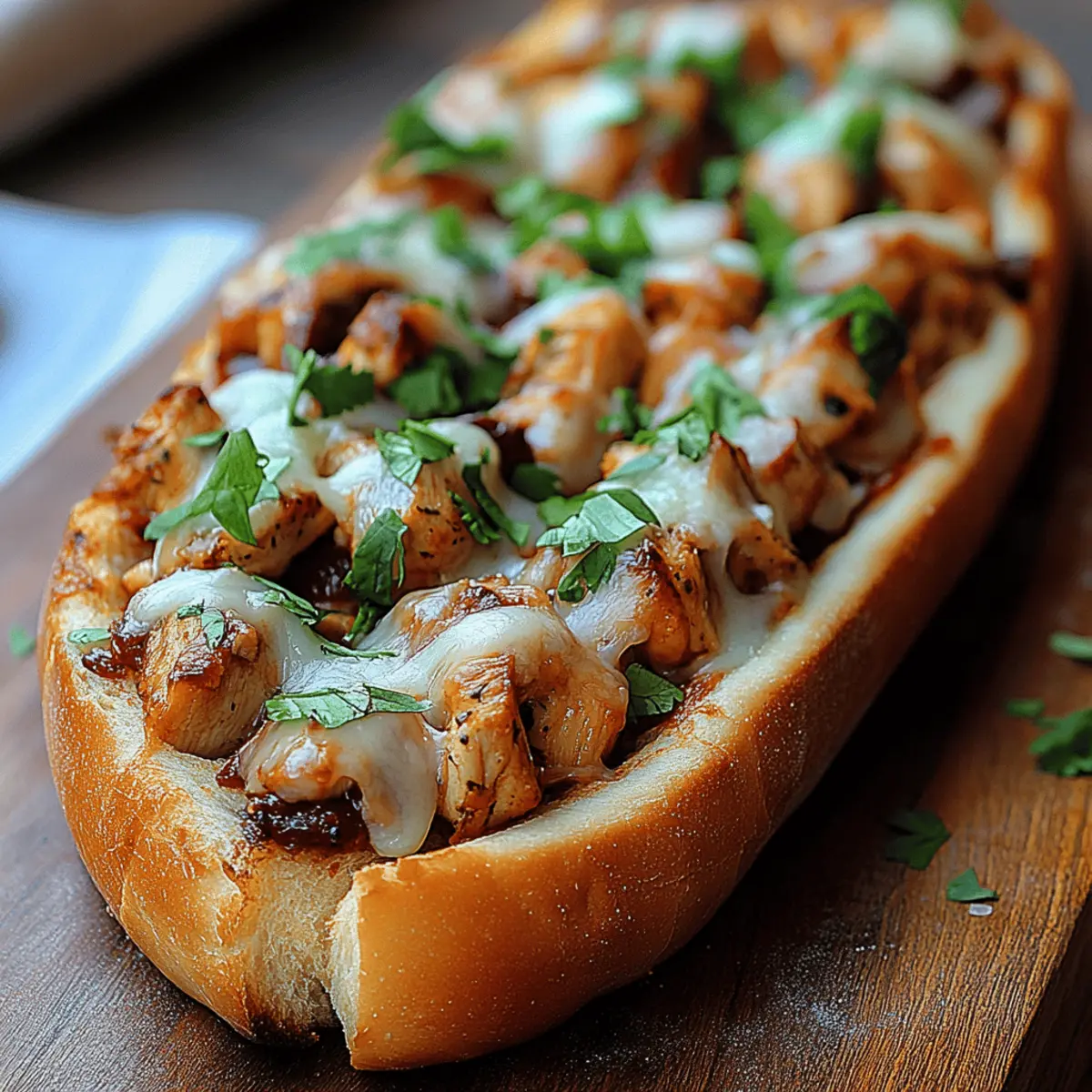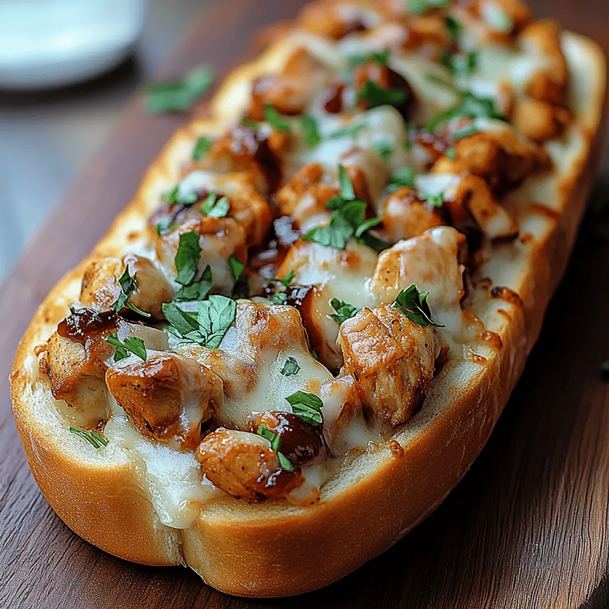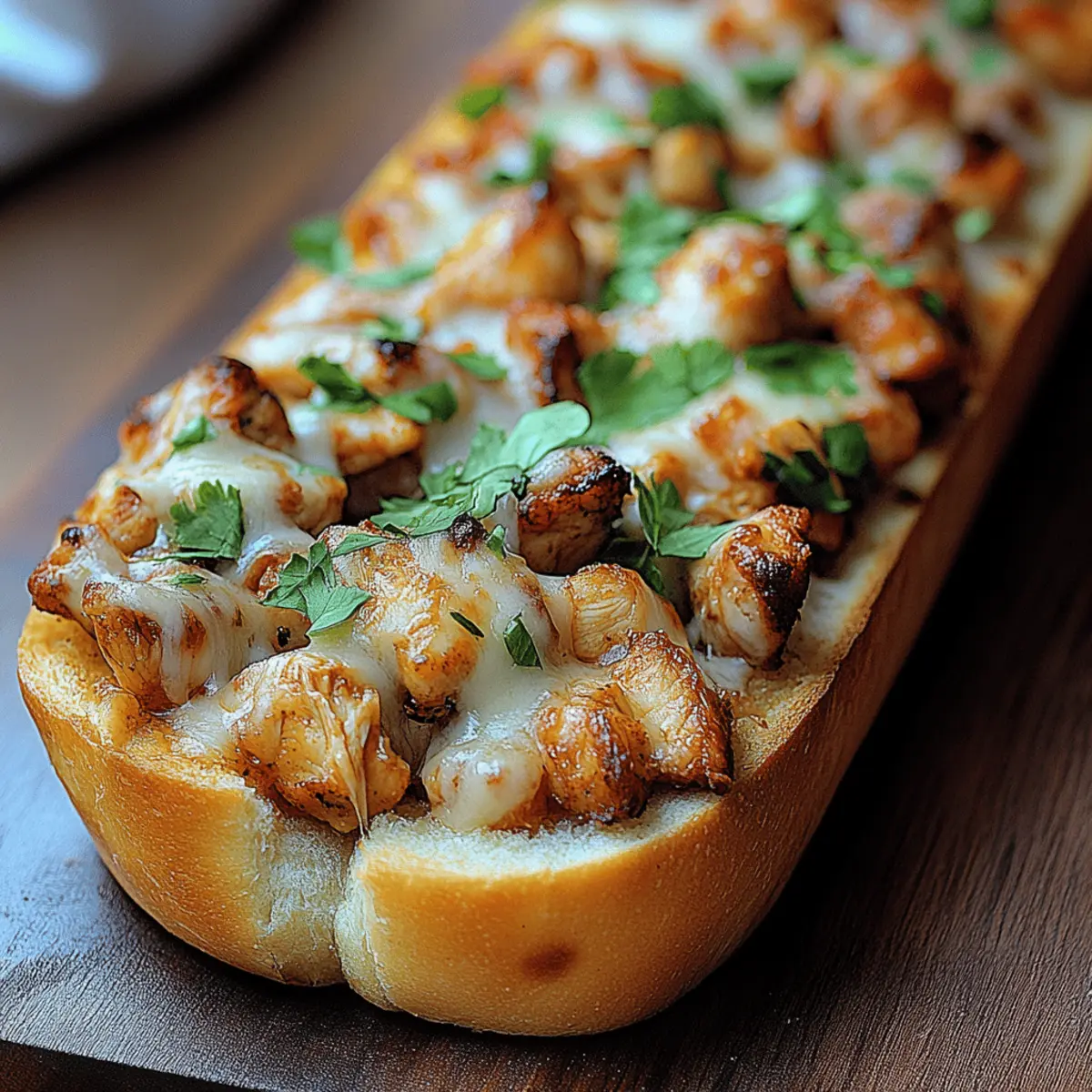 Indulgent BBQ Chicken French Bread Pizza for Comfort Cravings Posted on September 24, 2025September 24, 2025 by Mandy Evans As I was preparing for a cozy weekend in, an unexpected craving for a cheesy, smoky slice of comfort food hit me hard. That’s when I decided to whip up my BBQ Chicken French Bread Pizza! This delicious dish combines tender chicken and tangy BBQ sauce, all melted atop a crispy French bread base that’s simply irresistible. Not only is it quick to assemble, making it a perfect weeknight dinner solution, but it’s also customizable—it caters to everyone’s tastes and dietary needs, whether you’re feeding a crowd or craving a solo indulgence. How about giving this delightful dish a try and transforming those ordinary nights into something extraordinary? Why is BBQ Chicken French Bread Pizza a Must-Try? Simplicity: With just a few ingredients, you can whip up this mouthwatering pizza in no time. Customization: Top with your favorite veggies or switch up the bread type for endless variations. Comforting: The melty cheese and BBQ chicken create a warm hug in every bite. For a fun twist, consider pairing it with a light garden salad or chips and salsa for a complete meal experience. Whether you’re enjoying a cozy night in or hosting a game day celebration, this dish is guaranteed to please everyone! BBQ Chicken French Bread Pizza Ingredients Get ready to create a scrumptious comfort food delight! For the Base French Bread – Provides the perfect crispy structure; Italian bread, a baguette, or pita can work beautifully as alternatives. For the Toppings Cooked Chicken – This protein-packed ingredient soaks up all that tangy BBQ goodness; feel free to use pre-shredded rotisserie chicken for a quick solution. Barbecue Sauce – The star of the show, imparting a sweet and smoky flavor; opt for sugar-free or homemade BBQ sauce for a healthier option. Mozzarella Cheese – Melts to perfection, adding that ooey-gooey texture we crave; for a vegan touch, try using plant-based cheese. Cheddar Cheese – Its rich and sharp taste enhances the overall flavor; can be omitted or swapped for another cheese if desired. Red Onion – Adds a crunchy texture and a hint of sharpness; if you prefer milder flavors, consider green onions or leave it out altogether. Fresh Cilantro/Parsley – Sprinkled on top for a burst of color and freshness; feel free to use any herbs that harmonize with BBQ flavors, such as basil or oregano. Step‑by‑Step Instructions for BBQ Chicken French Bread Pizza Step 1: Preheat the Oven Begin by preheating your oven to 375°F (190°C). This temperature is ideal for achieving that perfectly melted cheese and crispy bread base. While the oven heats up, gather your ingredients to ensure a smooth cooking process. Step 2: Prepare the French Bread Slice the French bread loaf in half lengthwise using a sharp knife. If you prefer extra crunch, place the bread halves on a baking sheet and lightly toast them for about 5 minutes in the preheated oven until they’re just golden. This step adds an irresistible texture to your BBQ Chicken French Bread Pizza. Step 3: Mix the Chicken and BBQ Sauce In a medium-sized bowl, combine your shredded cooked chicken with BBQ sauce, stirring until the chicken is thoroughly coated. The goal here is to ensure every bite is packed with flavor. Aim for a good balance; you want the chicken to glisten with BBQ sauce but not be overly saturated, allowing the chicken’s taste to shine through. Step 4: Assemble the Toppings Generously layer the BBQ chicken mixture over the toasted French bread halves. Spread it evenly, reaching every corner to create a mouthwatering base. The combination of savory chicken and tangy sauce will be the star of your BBQ Chicken French Bread Pizza, making it irresistible to all who try it. Step 5: Add the Cheeses Sprinkle shredded mozzarella and cheddar cheese evenly over the BBQ chicken layer. This cheesy topping will create the delicious, gooey goodness everyone loves. If you’re a fan of a little extra zing, feel free to layer on some thinly sliced red onions for added flavor and crunch at this stage. Step 6: Bake the Pizzas Place the prepared pizzas on a baking sheet and slide them into the oven. Bake for 12-15 minutes, watching for the cheese to melt and bubble with golden edges. The aroma of BBQ chicken will fill your kitchen, and you’ll know it’s almost time to savor this delightful BBQ Chicken French Bread Pizza. Step 7: Garnish and Serve Once baked to perfection, remove the pizzas from the oven and let them cool for a moment. Sprinkle fresh cilantro or parsley on top for added color and a burst of freshness. Slice into pieces and serve warm, allowing everyone to enjoy this comforting meal that’s simple, delicious, and oh-so-satisfying! What to Serve with BBQ Chicken French Bread Pizza Transform a simple meal into a feast with the perfect accompaniments for your BBQ Chicken French Bread Pizza! Crispy Garden Salad: A crunchy mix of fresh greens and colorful veggies adds a refreshing contrast to the rich pizza. Creamy Coleslaw: The tangy and creamy slaw offers a cool complement that balances the smoky flavors of the BBQ chicken. Spicy Chips and Salsa: Crunchy tortilla chips paired with zesty salsa bring an added crunch and vibrant flavor to your spread. Grilled Asparagus: Smoky, charred asparagus offers an earthy flavor that enhances the BBQ theme and adds a sophisticated touch. Pairing your BBQ Chicken French Bread Pizza with these sides invites warm conversations and cozy moments with loved ones. Plus, don’t forget a chilled drink, like a light lager or sweet iced tea, to complete your meal! Make Ahead Options These BBQ Chicken French Bread Pizzas are perfect for meal prep enthusiasts! You can prepare the chicken mixed with BBQ sauce up to 3 days in advance, allowing those flavors to meld beautifully while refrigerated. The bread can be sliced and toasted 24 hours ahead of time, ensuring a c