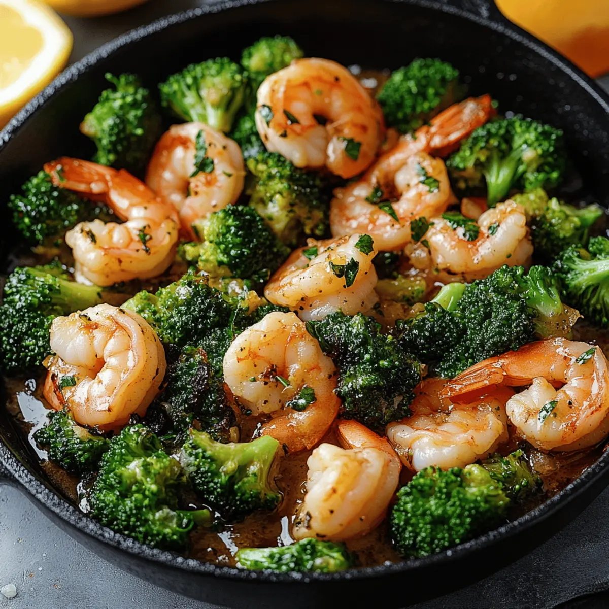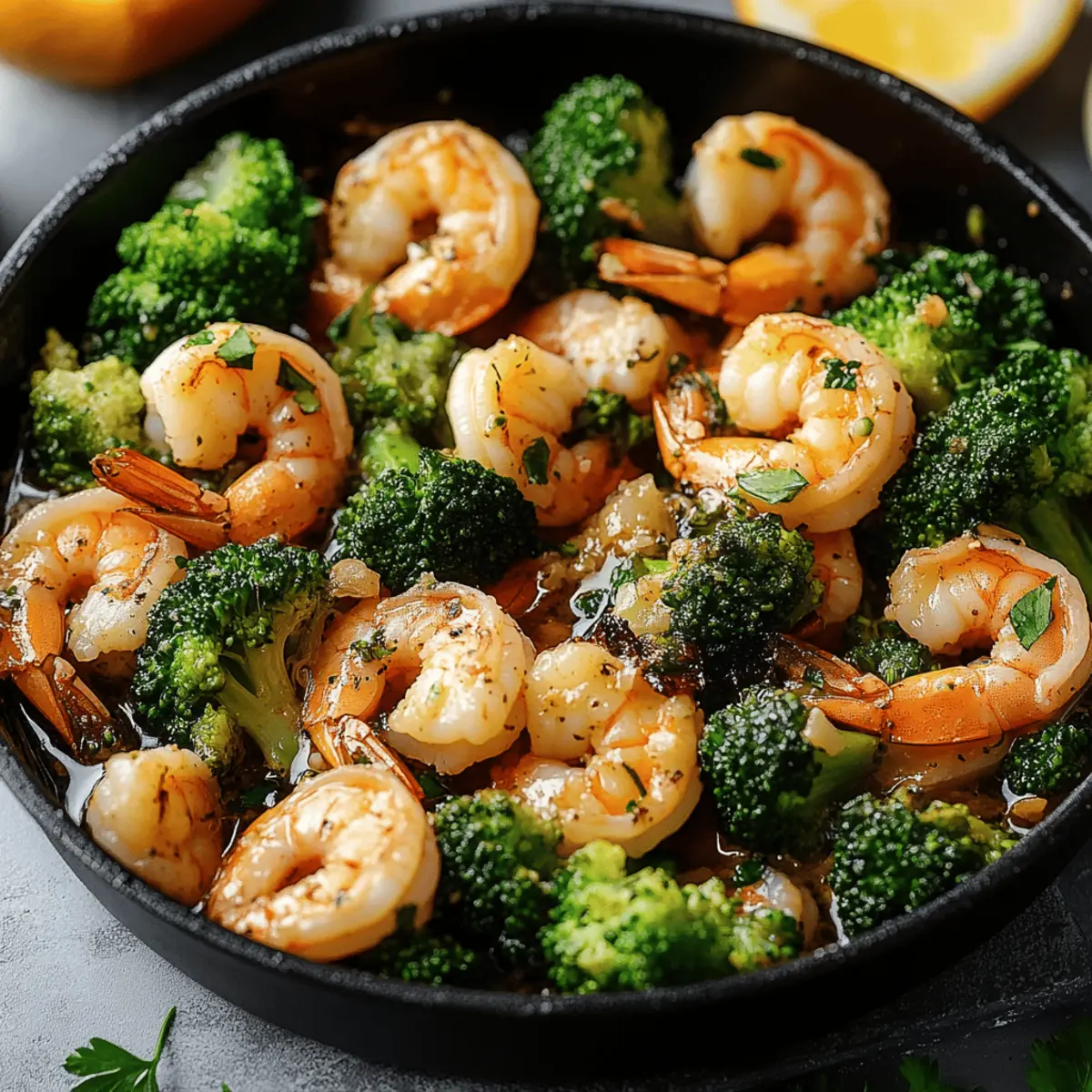 Quick and Juicy Garlic Butter Shrimp and Broccoli Skillet Posted on August 25, 2025August 25, 2025 by Mandy Evans As I hurriedly stirred the bubbling skillet before me, the tantalizing aroma of garlic danced through my kitchen, inviting everyone nearby to share in the excitement. There’s something magical about a quick meal, and my Garlic Butter Shrimp and Broccoli Skillet is just that—a vibrant, satisfying dish that gets dinner on the table in under 20 minutes. With tender shrimp bathed in a rich garlic butter sauce and crisp broccoli providing a nutritious crunch, this low-carb, high-protein recipe is not only keto-friendly but also a remarkable crowd-pleaser for busy weeknights. You’ll love how easy it is to whip up this deliciously balanced meal, perfect for those evenings when you long for homemade comfort without the hassle. Are you ready to elevate your weeknight dinners with this delightful recipe? Why is this recipe a must-try? Quick Preparation: In just 20 minutes, you can whip up this delicious meal, making it perfect for busy weeknights. Flavor Explosion: The garlic butter sauce is a decadent blend that perfectly complements the shrimp and broccoli, ensuring every bite is a delight! Healthy Eating: Packed with protein and low in carbs, this dish fits seamlessly into any keto or gluten-free lifestyle. Versatile Ingredients: You can easily substitute shrimp with chicken or tofu, allowing you to experiment with flavors and textures. Crowd-Pleasing: Perfect for family dinners or casual gatherings, everyone will be asking for seconds of this irresistible Garlic Butter Shrimp and Broccoli Skillet! Garlic Butter Shrimp and Broccoli Skillet Ingredients • Discover the magic of flavors in this quick meal! For the Shrimp Raw Shrimp (peeled and deveined) – The star of the dish; fresh shrimp yields the best results. Butter – Adds a rich, creamy texture that’s simply irresistible. For the Broccoli Broccoli Florets – Provides crunch and nutrients; make sure to cut them into bite-sized pieces. For the Flavor Minced Garlic – Brings robust flavor; opt for fresh garlic for the best taste. Paprika – A dash of mild sweetness and vibrant color; smoked paprika can enhance the flavor. Ground Black Pepper – Elevates the dish with subtle warmth. Dried Oregano – Add an herbal note; feel free to swap for fresh if you have it handy. Red Chili Flakes – Introduces a hint of heat; adjust to fit your spice preference. Salt – Essential for flavor; remember to taste as you season! For the Finish Olive Oil – A healthy base for sautéing; can be replaced with your favorite cooking oil. Lemon Juice & Lemon Slices – Brightens the dish and enhances all the flavors beautifully. Fresh Cilantro (chopped) – Adds a pop of freshness; parsley or dill are lovely substitutes if you prefer. Step‑by‑Step Instructions for Garlic Butter Shrimp and Broccoli Skillet Step 1: Heat the Skillet Begin by heating 2 tablespoons of olive oil in a large skillet over medium heat. Allow the oil to shimmer for about 1 minute, indicating it’s hot enough for cooking. This will create a perfect base for your Garlic Butter Shrimp and Broccoli Skillet, enhancing the flavors of the ingredients to come. Step 2: Sauté the Broccoli Add the broccoli florets to the hot skillet, stirring gently. Sauté for 3-4 minutes until the broccoli is bright green and just tender, but still crisp. Once cooked, remove the broccoli from the skillet and set it aside on a plate. This step allows the flavors to blossom while preventing overcooking of the vibrant vegetable. Step 3: Prepare the Garlic Butter In the same skillet, melt 2 tablespoons of butter over medium heat. As the butter begins to bubble, add 4 cloves of minced garlic, stirring constantly for about 30 seconds until fragrant. This rich garlic butter will infuse the Garlic Butter Shrimp and Broccoli Skillet with delectable flavor, so keep an eye on it to avoid burning. Step 4: Cook the Shrimp Add 1 pound of peeled and deveined shrimp to the skillet, seasoning with 1 teaspoon of paprika, 1/2 teaspoon of black pepper, 1 teaspoon of dried oregano, 1/2 teaspoon of red chili flakes, and a pinch of salt. Cook the shrimp for 2-3 minutes on each side until they turn pink and opaque. This quick cooking process ensures the shrimp remain tender and juicy, making your skillet dish a highlight of the meal. Step 5: Combine Ingredients Once the shrimp are cooked, return the sautéed broccoli to the skillet. Drizzle the mixture with the juice of 1 lemon and add a few lemon slices for extra flavor. Gently toss everything together for about 1-2 minutes, allowing the ingredients to heat thoroughly and the citrus to enhance the overall taste of your Garlic Butter Shrimp and Broccoli Skillet. Step 6: Garnish and Serve Remove the skillet from the heat and sprinkle freshly chopped cilantro on top for a burst of flavor and color. Serve your Garlic Butter Shrimp and Broccoli Skillet immediately on warm plates. This lively dish is best enjoyed fresh, showcasing its delicious combination of savory, buttery shrimp and crunchy broccoli. What to Serve with Garlic Butter Shrimp and Broccoli Skillet Elevate your weeknight dinner with delightful sides that complement the vibrant flavors and satisfying textures of this quick meal. Creamy Mashed Potatoes: The rich, buttery flavor of mashed potatoes pairs beautifully with the garlic butter shrimp, balancing the meal with a comforting creaminess. Cauliflower Rice: A light, low-carb alternative that captures the essence of rice while keeping it keto-friendly, enhancing the dish’s vibrant veggie profile. Zucchini Noodles: A playful twist that adds a fresh, light touch, allowing the flavors of the shrimp and sauce to shine through without weighing you down. Crisp Green Salad: A refreshing mix of greens with a citrus vinaigrette that crowns the meal with brightness and crunch, contrasting beautifully against the tender shrimp. Garlic Bread: Crispy, toast