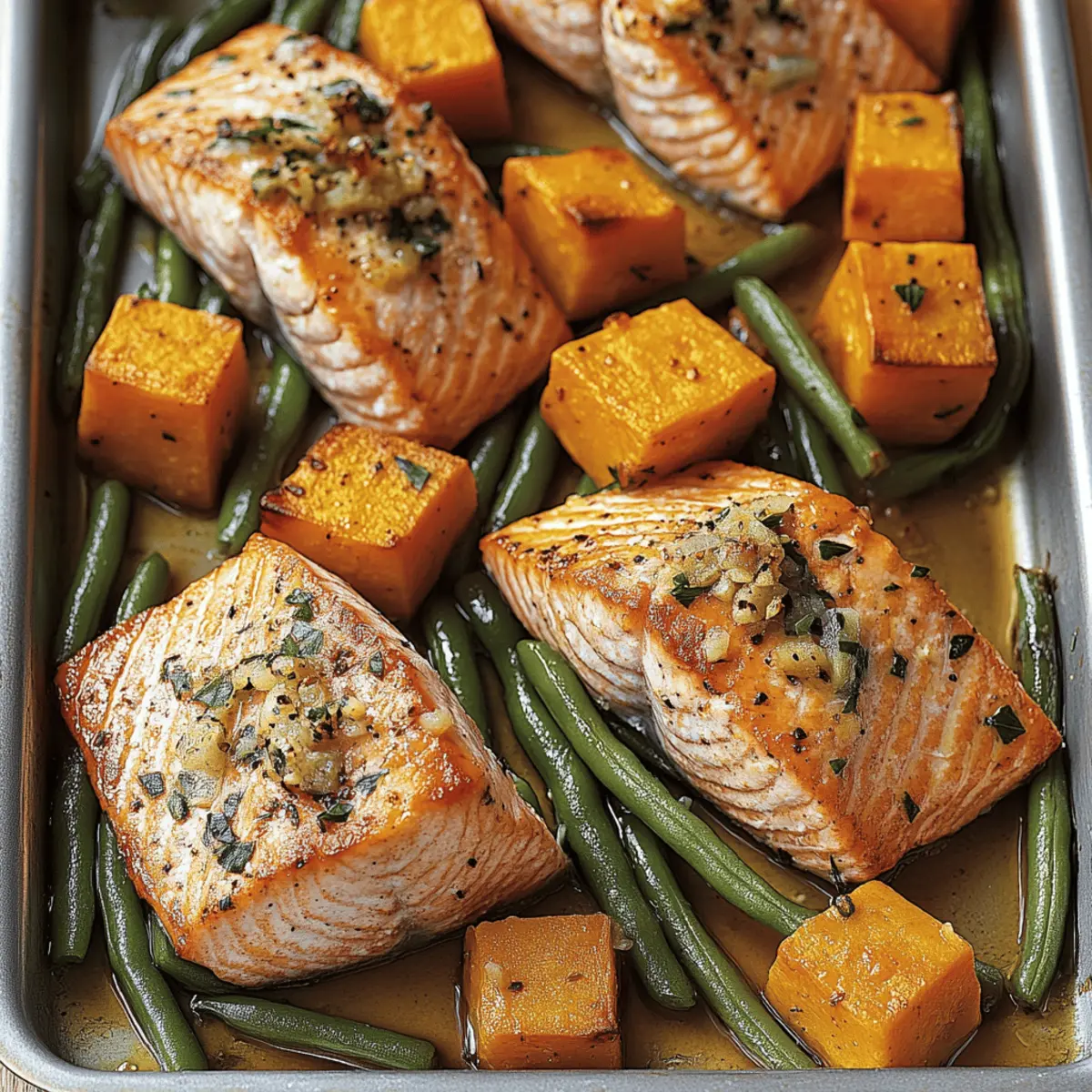 With a satisfying sizzle, the oven comes to life, filling the kitchen with promises of delicious aromas. This Easy Sheet Pan Baked Salmon with Sweet Potatoes and Green Beans is the perfect quick answer for those busy weeknights or lazy Sundays when you just want something fresh and comforting. Not only is this colorful dish packed with nutritious benefits, featuring omega-3-rich salmon and naturally sweet sweet potatoes, but it also requires minimal cleanup—win-win, right? The combination of flaky salmon, caramelized sweet potatoes, and vibrant green beans creates a delightful flavor harmony that will impress everyone at the dinner table. Are you ready to make your cooking routine a little easier and a lot tastier? Let’s dive into this effortless recipe! Why is This Recipe a Must-Try? Simplicity and Ease: You can whip up this delicious meal in about 30 minutes, making it perfect for busy lifestyles. Flavor Explosion: The combination of flaky salmon, sweet roasted sweet potatoes, and crisp green beans brings an unrivaled, vibrant taste to your dinner table. One-Pan Wonder: Enjoy minimal cleanup with this one-sheet meal—more time to relax and savor your food! Nutritional Powerhouse: Packed with protein, healthy fats, and vitamins, this dish aligns perfectly with your healthy eating goals. Versatile Options: Feel free to customize with your favorite veggies or seasoning blends for a different twist every time. You’ll love how easily this Baked Salmon with Sweet Potatoes and Green Beans fits into your weekly meal planning! Baked Salmon with Sweet Potatoes and Green Beans Ingredients For the Salmon • Salmon Fillets – Rich in protein and omega-3 fatty acids, perfect for a heart-healthy diet. For the Roasted Veggies • Sweet Potatoes – Adds natural sweetness and complex carbohydrates; can be swapped for butternut squash or carrots. • Green Beans – Provides fresh crunch and color; feel free to use asparagus or broccoli as alternatives. For the Seasoning • Olive Oil – Essential for roasting and full of healthy fats; substitute with avocado oil if needed. • Minced Garlic – Brings robust flavor to the dish; fresh or powdered varieties work great. • Salt and Pepper – Key for enhancing the overall taste; adjust to your personal preference. • Dried Herbs (optional) – Rosemary or thyme add wonderful fragrance and depth. • Lemon Zest and Juice – Brightens the dish and complements the salmon beautifully; lime juice can substitute nicely. This vibrant Baked Salmon with Sweet Potatoes and Green Beans is ready to turn your weeknight dinner into something extraordinary! Step‑by‑Step Instructions for Easy Sheet Pan Baked Salmon with Sweet Potatoes and Green Beans Step 1: Preheat the Oven Begin by preheating your oven to 400°F (200°C). This temperature will ensure the salmon cooks perfectly while allowing the sweet potatoes to become tender and caramelized. While the oven heats, gather a rimmed baking sheet and prepare your fresh ingredients. Step 2: Prepare the Vegetables Peel and cube your sweet potatoes into 1-inch pieces, ensuring they are uniform for even cooking. Next, rinse and trim the green beans, removing any tough ends. Pat the salmon fillets dry with a paper towel to remove excess moisture. This step is crucial for achieving that perfect crispy texture on your salmon. Step 3: Toss the Veggies In a large mixing bowl, combine your sweet potato cubes and green beans. Drizzle with olive oil, add minced garlic, and season with salt, pepper, and dried herbs if using. Toss everything well to ensure all the vegetables are evenly coated in this flavorful mixture, ready to create a delicious backdrop for the baked salmon. Step 4: Arrange on the Baking Sheet Spread the seasoned sweet potatoes on one side of the rimmed baking sheet, leaving ample space on the other side for the green beans. Place the green beans next to the sweet potatoes, ensuring both get proper roasting space. This arrangement will provide a beautiful color contrast and an even cooking surface for your Baked Salmon with Sweet Potatoes and Green Beans. Step 5: Add the Salmon Now it’s time to place the salmon fillets in the center of the baking sheet. Drizzle them with a bit of olive oil and sprinkle with fresh lemon zest and a squeeze of lemon juice. This step enhances the flavor of the salmon while adding a bright citrus note that complements the entire dish beautifully. Step 6: Bake It All Together Carefully transfer the baking sheet into your preheated oven and bake the salmon and vegetables for 20-25 minutes. Check for doneness by ensuring the salmon is flaky and the sweet potatoes are tender. Toss the veggies halfway through baking for even cooking and to achieve that perfect roasted finish. Step 7: Garnish and Serve After baking, remove the sheet pan from the oven and let the dish cool slightly. Garnish your Baked Salmon with Sweet Potatoes and Green Beans with fresh parsley or dill, and add lemon wedges or optional sesame seeds for an extra touch. This vibrant dish is now ready to be served and enjoyed with family and friends! Make Ahead Options These Easy Sheet Pan Baked Salmon with Sweet Potatoes and Green Beans are a fantastic choice for meal prep enthusiasts! You can cube the sweet potatoes and trim the green beans up to 24 hours in advance, storing them in an airtight container in the refrigerator to keep them fresh. Additionally, you can season the salmon fillets and keep them ready to go; just ensure they are covered tightly to maintain their flavor. When you’re ready to serve, simply arrange everything on the baking sheet and follow the baking steps for a delicious, stress-free dinner. This way, you’ll have a wholesome meal with minimal effort, allowing you to savor more precious time with your loved ones! Baked Salmon with Sweet Potatoes and Green Beans Variations Feel free to let your creativity shine and customize this delightful recipe to fit your tastes and dietary needs!