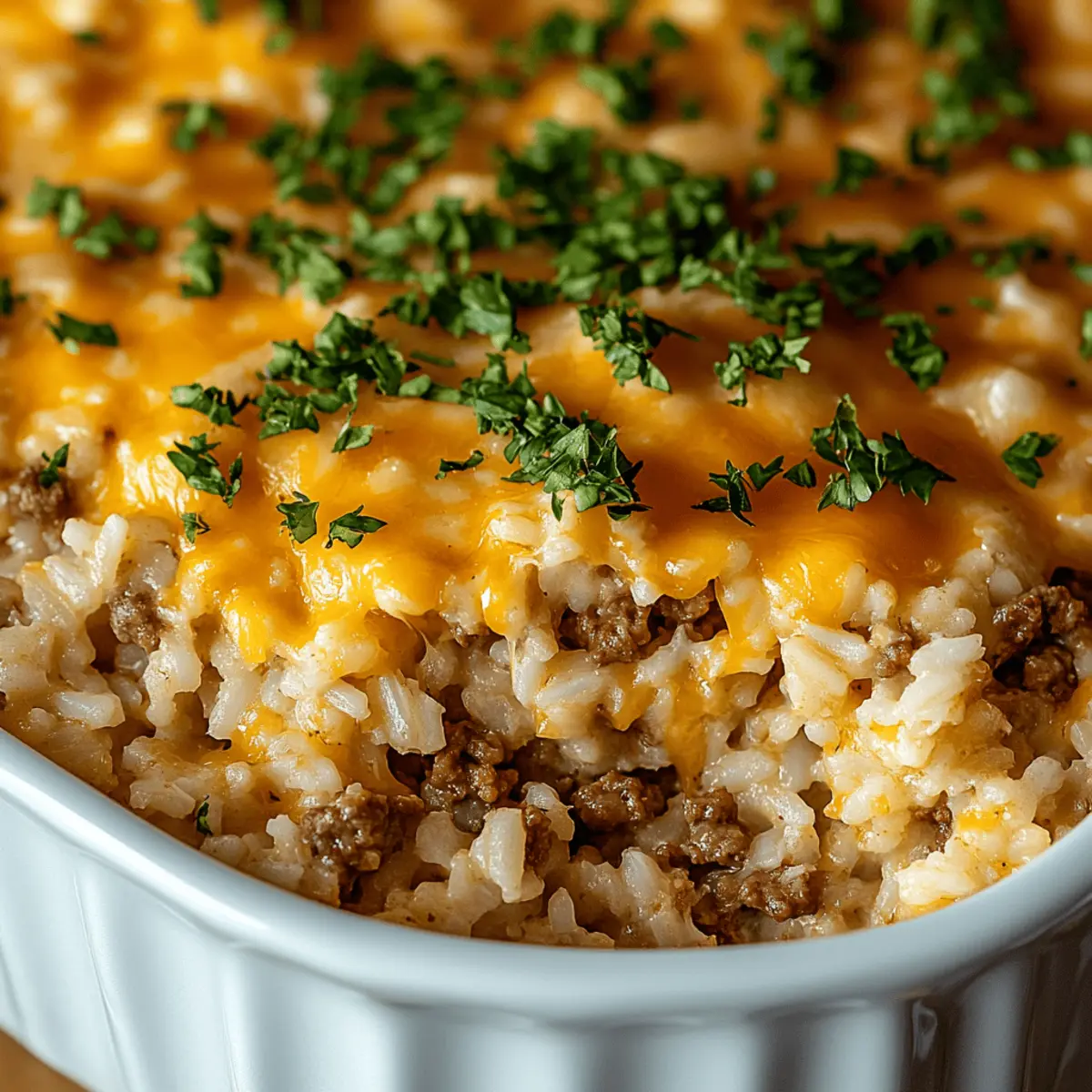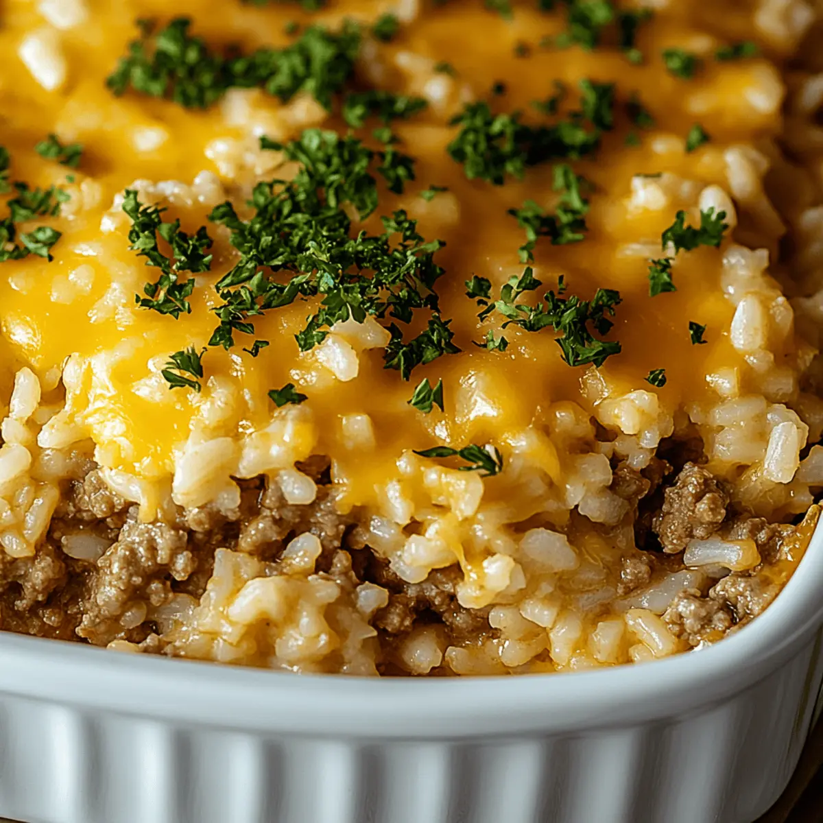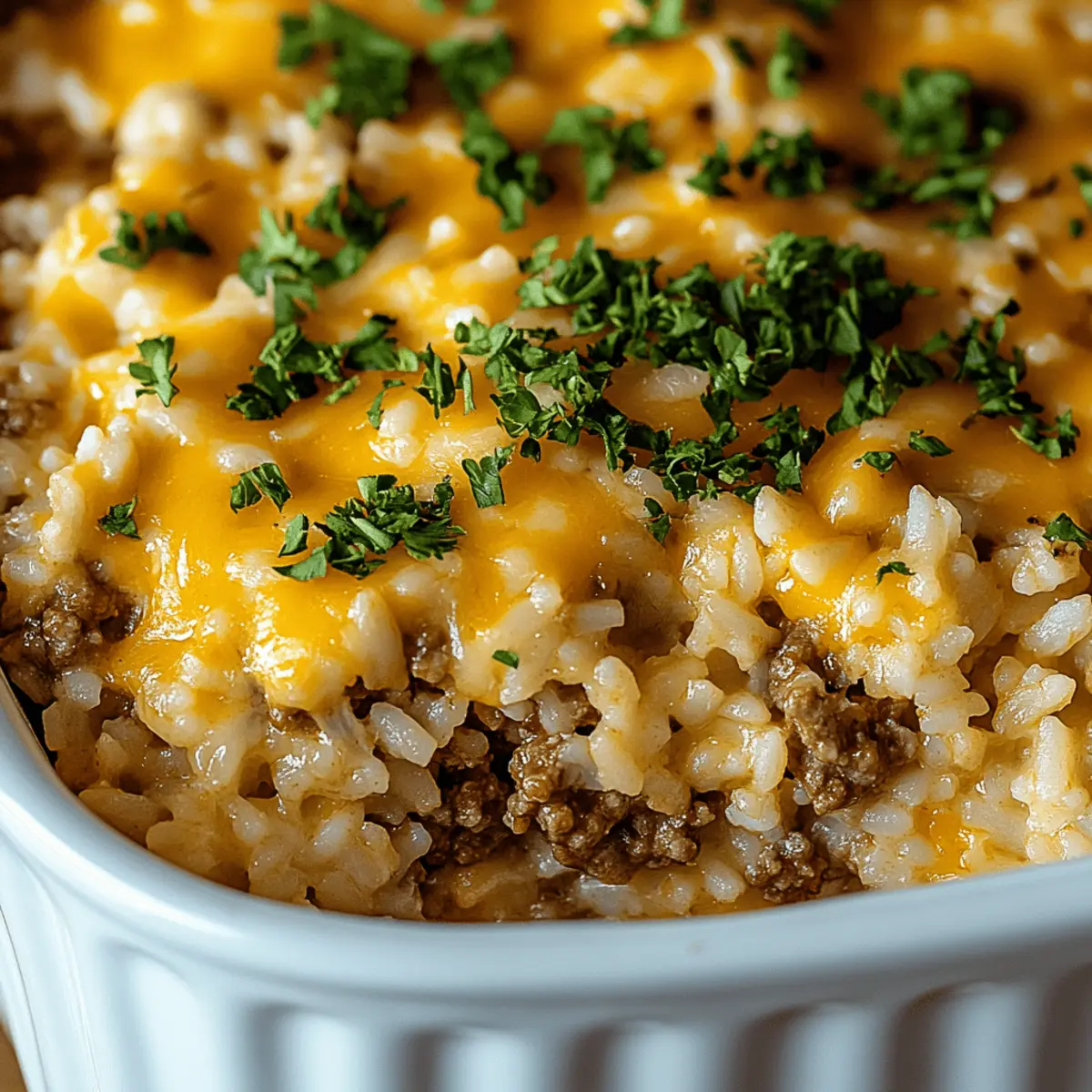 As I spooned the last bit of casserole into my bowl, a wave of nostalgia washed over me—home-cooked meals that wrapped me in warmth and comfort. Today, I’m excited to share my Cheesy Ground Beef and Rice Casserole, a hearty one-dish wonder that’s perfect for those busy evenings when you crave something satisfying yet simple. This recipe shines as a budget-friendly dinner option and is versatile enough to please everyone at the table. With just a handful of ingredients, including tender ground beef, long-grain rice, and flavorful French onion soup, you can create a delightful meal that’s bound to become a family favorite. Plus, it’s easy to make ahead or freeze, offering the ultimate convenience for your weeknight cooking. Are you ready to discover how to seamlessly merge comfort food with straightforward preparation? Let’s dive in! What makes this casserole so comforting? Hefty portions: This Cheesy Ground Beef and Rice Casserole is perfect for families and gatherings, offering a satisfying meal everyone will love. Easy prep: With just one dish to clean, you can spend more time enjoying your meal and less time on cleanup! Flavor explosion: Infused with French onion soup, the layers of flavor create a deliciously savory experience that warms the soul. Customizable goodness: Feel free to add your favorite veggies or extra cheese for a unique twist—this recipe is as versatile as it is delicious! Budget-friendly: Using affordable ingredients, this dish proves that comfort food doesn’t have to break the bank. Make-ahead option: Prepare it in advance and pop it in the oven when you’re ready to savor this delightful casserole—perfect for busy weeknights! Cheesy Ground Beef and Rice Casserole Ingredients For the Casserole • Ground Beef – Offers hearty protein; opt for 85–90% lean for the best flavor and texture. • Long-Grain White Rice – Serves as the base and absorbs all the delicious flavors; avoid instant rice to prevent mushiness. • French Onion Soup – Adds rich depth and savory goodness; beef broth can be a lighter alternative. • Beef Consommé – Intensifies the beefy flavor beautifully; you can substitute it with beef broth in a pinch. • Unsalted Butter – Brings creaminess and richness to your casserole; stick with unsalted to maintain control over seasoning. • Chopped Parsley – Optional garnish that adds a touch of freshness and color, elevating your dish. For Extra Flavor (Optional) • Cheddar or Mozzarella Cheese – Sprinkle on top during the last 10 minutes of baking for an extra-cheesy bite. • Vegetables (Mushrooms, Peas, Bell Peppers) – Stir in your favorite veggies for added nutrition and texture. • Garlic Powder or Worcestershire Sauce – Season the ground beef with these for a flavor boost before browning. Embrace the warmth offered by this Cheesy Ground Beef and Rice Casserole; it’s sure to become a staple in your home! Step‑by‑Step Instructions for Cheesy Ground Beef and Rice Casserole Step 1: Preheat and Prepare Begin by preheating your oven to 350°F (175°C). While it warms up, take a moment to grease a 9×13-inch baking dish with a bit of butter or cooking spray. This preparation will ensure that your Cheesy Ground Beef and Rice Casserole doesn’t stick and comes out beautifully once baked. Step 2: Brown the Ground Beef In a large skillet over medium heat, add your ground beef, cooking until it’s fully browned and no longer pink, usually about 7-10 minutes. Remember to break it apart with a spatula as it cooks. Drain any excess fat, and, for an extra flavor boost, consider seasoning it with garlic powder or Worcestershire sauce before moving to the next step. Step 3: Layer the Rice and Beef Evenly spread the uncooked long-grain white rice at the bottom of your prepared baking dish. This rice will serve as the base, soaking in all the savory flavors. Next, layer the cooked ground beef generously over the rice. Make sure it’s evenly distributed to ensure every spoonful of your casserole is delicious. Step 4: Add the Soups Carefully pour the French onion soup and beef consommé over the rice and beef mixture. This will add depth and richness to your Cheesy Ground Beef and Rice Casserole, ensuring everything is coated evenly. Use a spoon to gently stir if necessary, but try to keep the layers intact to create texture once baked. Step 5: Dot with Butter Dot the top of the casserole with small pats of unsalted butter. This will melt into the dish as it bakes, enriching the flavor and adding a creamy texture. Make sure the butter is evenly spaced to ensure every part of your Cheesy Ground Beef and Rice Casserole gets that extra touch of indulgence. Step 6: Cover and Bake Cover the baking dish tightly with aluminum foil to trap the steam while it bakes. Place it in the preheated oven and bake for 60 to 75 minutes. You’ll know it’s ready when the rice is tender and has absorbed the liquid, creating a delightful casserole that’s bubbling and golden around the edges. Step 7: Fluff and Garnish Once the baking time is complete, carefully remove the foil and allow the casserole to cool for a few minutes. Use a fork to fluff the rice, mixing the layers gently. For a pop of color and freshness, sprinkle chopped parsley over the top just before serving your comforting Cheesy Ground Beef and Rice Casserole. Cheesy Ground Beef and Rice Casserole Twists Feel free to personalize your Cheesy Ground Beef and Rice Casserole to suit your family’s tastes and dietary needs! Extra Cheesy: Top with shredded cheddar or mozzarella during the final 10 minutes of baking for a gooey, cheesy finish. Add a layer of cheese goodness that will make everyone’s eyes light up—what’s not to love about more cheese? Veggie Boost: Stir in sautéed mushrooms, peas, or bell peppers for added nutrition and color. Incorporating vegetables not only enhances the flavor but also creates a beautiful medley of tastes and textures, perfect for veggie 