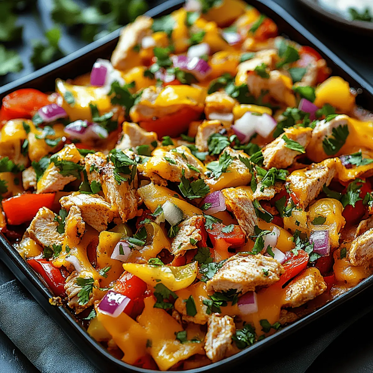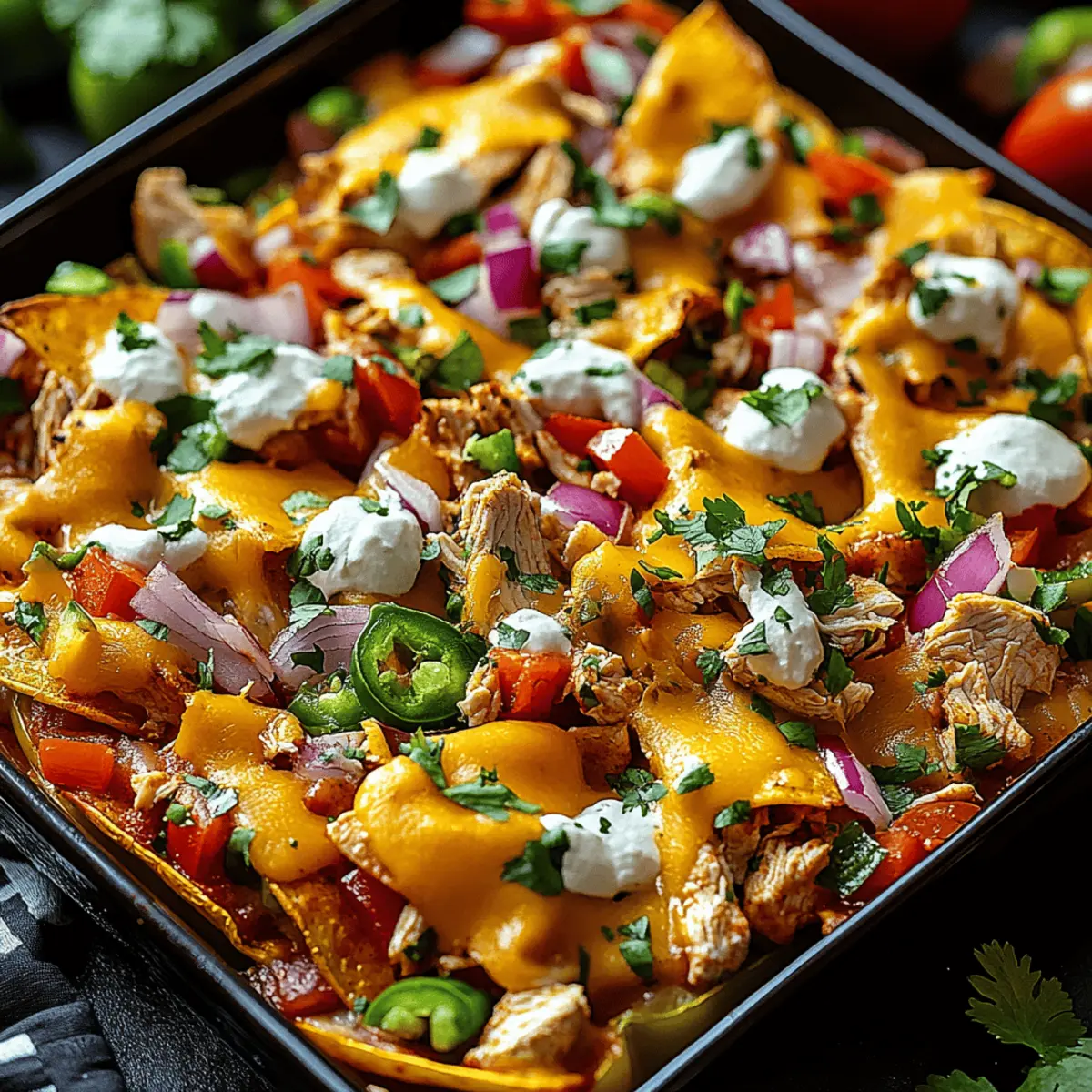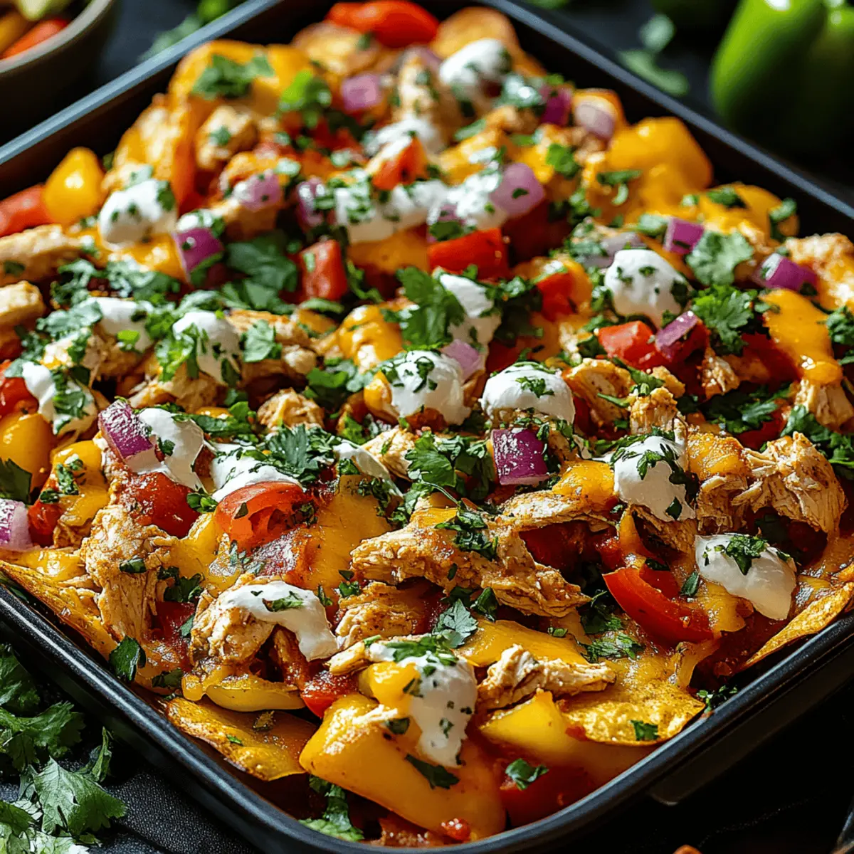 As I stood in my kitchen, I was hit with a wave of nostalgia for game nights filled with laughter and delicious snacks. That’s when I decided to reinvent the classic nachos and create Chicken Nachos on Mini Bell Peppers. This delightful twist combines the satisfying crunch of bite-sized mini bell peppers with savory shredded chicken and melty cheese, making it not only fun to eat but also a healthier alternative to traditional nachos. You’ll love how quick this recipe is to prepare—perfect for any gathering or just a cozy night in. Plus, they’re gluten-free and completely customizable, allowing you to add your favorite toppings or ingredients. What’s your favorite way to get creative in the kitchen? Let’s dive in and explore this colorful, nutritious snack that’s sure to impress! Why Choose Mini Bell Pepper Nachos? Unbeatable Crunch: Each mini bell pepper serves as a crunchy vessel that elevates your snacking experience beyond standard nachos. Healthy Twist: These nutritious nachos are gluten-free and packed with flavor, making them a guilt-free indulgence. Quick Prep: With just a few minutes of prep time, you can whip up these tasty treats, ideal for last-minute gatherings or casual movie nights. Customizable Flavors: Mix and match toppings to suit your taste—whether you prefer spicy jalapeños or creamy avocado, the options are endless! Crowd-Pleasing Appeal: Serve them at parties or as a wholesome snack at home, and watch everyone come back for more. If you love quick and customizable recipes, check out my Cajun Shrimp Chicken for another flavorful idea! Chicken Nachos on Mini Bell Peppers Ingredients Here’s what you’ll need to create these scrumptious Chicken Nachos on Mini Bell Peppers! For the Base • Mini Bell Peppers – These sweet and crunchy gems make the perfect “cup” for your filling. You can substitute with larger bell peppers for more bite. For the Filling • Shredded Cooked Chicken – A must for protein and flavor; rotisserie chicken works wonderfully for a quick option. • Salsa – This adds moisture and zest; feel free to use your favorite homemade or store-bought variety. • Shredded Cheese – Melts beautifully on top; consider using dairy-free cheese for a vegan alternative. • Black Beans – They boost protein content; if desired, swap them out for corn or omit altogether. For the Toppings • Green Onions – Adds a fresh, mild onion flavor that brightens your nachos. • Jalapeños – Spice things up with fresh or pickled jalapeños for a kick! • Fresh Cilantro – A vibrant garnish that adds an aromatic touch; you can also try avocado or Greek yogurt for extra creaminess. Feel free to mix and match these ingredients according to your taste—these Chicken Nachos on Mini Bell Peppers will be a hit! Step‑by‑Step Instructions for Chicken Nachos on Mini Bell Peppers Step 1: Preheat the Oven Begin by preheating your oven to 375°F (190°C). This temperature ensures that the cheese melts perfectly while the mini bell peppers retain their vibrant color and crispness. As the oven heats up, gather your ingredients and prepare your workspace for a seamless cooking experience. Step 2: Prepare the Mini Bell Peppers Wash the mini bell peppers thoroughly, then slice them in half lengthwise. Carefully remove the seeds to create little cups for your filling. Arrange the halved peppers on a baking sheet lined with parchment paper for easy cleanup. They should look inviting and colorful, ready to be filled with the delicious toppings! Step 3: Mix the Chicken Filling In a mixing bowl, combine the shredded cooked chicken with your choice of salsa. Stir until the chicken is evenly coated, adding spices like cumin or chili powder if desired for an extra kick. This savory filling is the star of your Chicken Nachos on Mini Bell Peppers, so ensure it’s well-mixed and flavorful before you move on. Step 4: Assemble the Nachos Take your prepared mini bell pepper halves and fill each with the chicken mixture generously. For an added layer of taste and nutrition, sprinkle black beans over the chicken if using. Finally, top each stuffed pepper with a handful of shredded cheese, ensuring that every pepper is packed with goodness. Step 5: Bake to Perfection Carefully place the baking sheet in your preheated oven and bake for 8-10 minutes. Keep an eye on the nachos as they bake; they are ready when the cheese is melted and bubbly, and the peppers are tender yet still crisp. This step truly brings your Chicken Nachos on Mini Bell Peppers to life! Step 6: Garnish and Serve Once out of the oven, let the nachos cool slightly before garnishing. Sprinkle freshly chopped green onions, jalapeños, and cilantro on top for a burst of flavor and color. These garnishes will elevate your dish, adding freshness to each bite. Serve your delicious Chicken Nachos on Mini Bell Peppers warm for the ultimate snacking experience! Storage Tips for Chicken Nachos on Mini Bell Peppers Room Temperature: Allow cooked Chicken Nachos on Mini Bell Peppers to cool before serving; they can sit at room temperature for up to 2 hours for safe consumption. Fridge: Store any leftovers in an airtight container in the fridge for up to 3 days. It’s best to keep garnishes separate to maintain their freshness. Freezer: For longer storage, freeze the unbaked chicken-filled mini bell peppers. They can last up to 2 months; just thaw in the fridge before baking. Reheating: When reheating, place the nachos in a preheated oven at 350°F (175°C) for about 10 minutes until warmed through, restoring their delightful crunch! What to Serve with Chicken Nachos on Mini Bell Peppers Elevate your snacking experience by pairing these vibrant nachos with delightful sides and beverages that enhance their flavors. Fresh Green Salad: A crisp salad with a light vinaigrette balances the rich flavors of the nachos, adding a refreshing element. Cilantro-Lime Rice: This fragrant side dish complements the Southwestern 