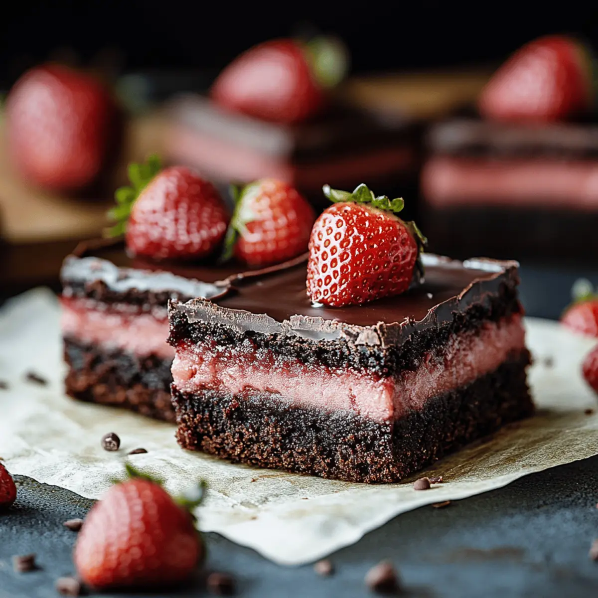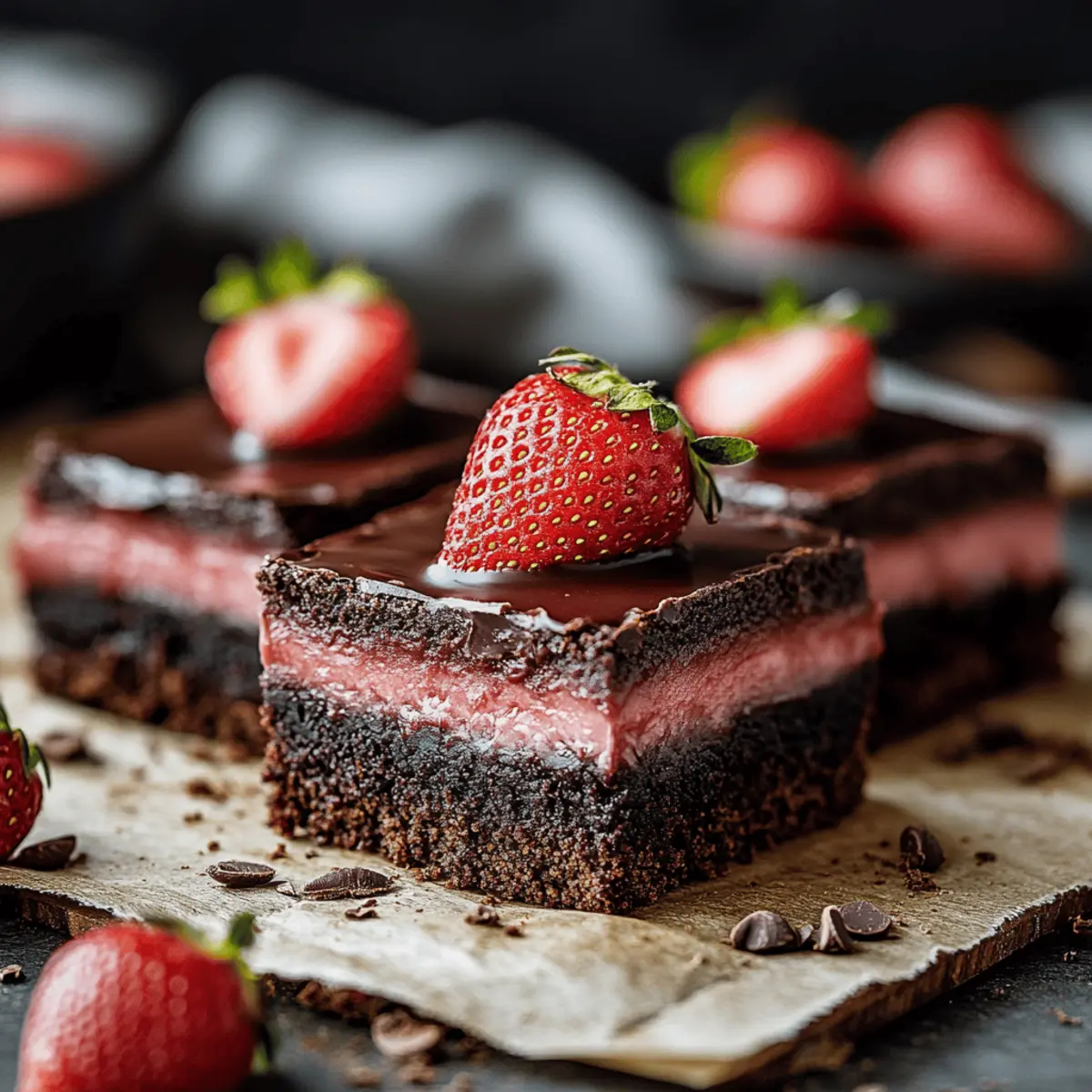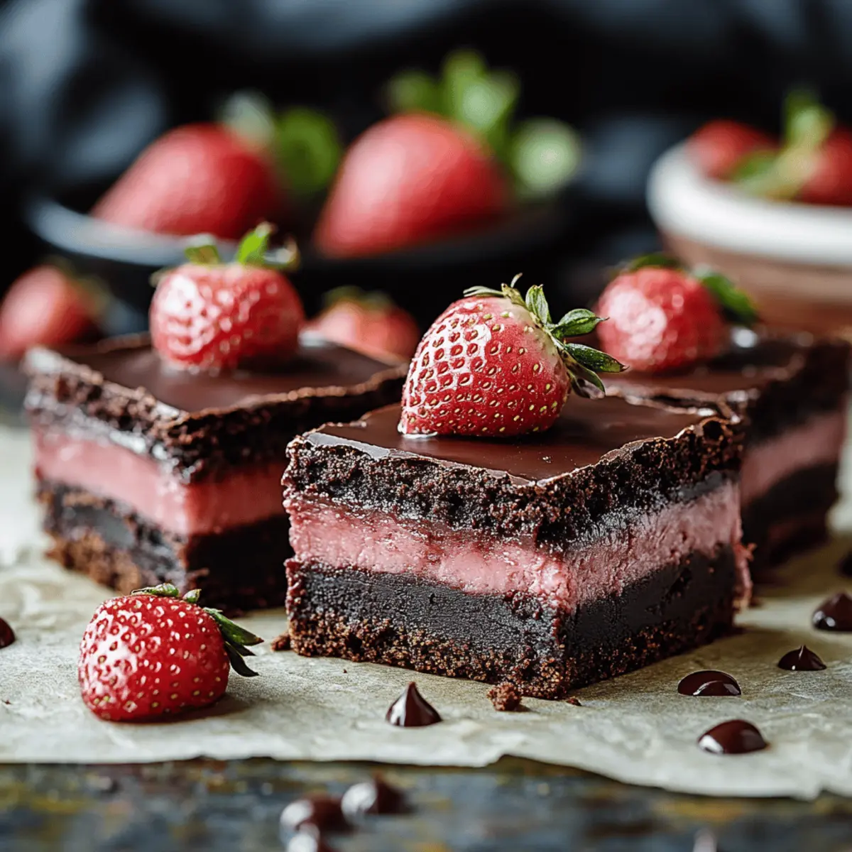 As the sweet aroma of chocolate envelops my kitchen, I can’t help but feel a wave of nostalgia wash over me. These Chocolate Strawberry Ganache Brownies are the answer to my relentless cravings for a cozy yet sophisticated dessert. Not only do they come together in a heartbeat—perfect for those busy weeknights—but their rich, fudgy texture harmonizes beautifully with the luscious strawberry ganache, creating that delightful balance we all seek. Plus, with easy swaps to make them gluten-free, these brownies cater to everyone, from dessert aficionados to those navigating dietary preferences. Ready to uncover the steps to this indulgent delight? Let’s dive into the world of chocolatey goodness together! Why choose Chocolate Strawberry Ganache Brownies? Decadent Delight: These brownies are a chocolate lover’s dream, boasting a rich, fudgy texture that’s truly irresistible. Versatile Options: Customize your experience with gluten-free alternatives or by switching up the fruit toppings to create your perfect dessert. Quick and Easy: Whip them up in no time, making them ideal for both surprise guests and cozy nights in. Showstopper Appeal: With their glossy ganache and vibrant strawberries, they look just as impressive as they taste, perfect for impressing at gatherings or celebrations. Comforting Indulgence: Each bite feels like a warm hug, combining familiar flavors with a sophisticated twist to satisfy your sweet tooth cravings. Chocolate Strawberry Ganache Brownies Ingredients For the Brownies High-Quality Dark Chocolate – Use at least 60% cacao for a deep chocolate flavor that’s key to these brownies. Unsalted Butter – Adds richness; substitute with coconut oil for a dairy-free option. Granulated Sugar – Sweetens and creates a tender texture; consider brown sugar for a deeper flavor. Eggs – Binds and adds moisture; use flax eggs or applesauce for a vegan version. All-Purpose Flour – Gives structure; swap with a gluten-free blend to stay on the healthier side. Vanilla Extract – Enhances flavor; always choose pure vanilla for the best aroma. For the Ganache Heavy Cream – The base for a smooth ganache; replace with coconut cream for a dairy-free treat. Fresh Strawberries – Infuse the ganache with fruity flavors; frozen strawberries work if thawed and drained properly. Step‑by‑Step Instructions for Chocolate Strawberry Ganache Brownies Step 1: Prepare Brownie Batter Start by preheating your oven to 350°F (175°C) and lining an 8×8-inch baking dish with parchment paper. In a medium saucepan, melt together 8 oz of high-quality dark chocolate and 1/2 cup of unsalted butter over low heat, stirring until smooth. In a separate bowl, whisk together 3 large eggs and 1 cup of granulated sugar until the mixture becomes pale and fluffy. Gradually combine both mixtures, then fold in 1/2 cup of all-purpose flour and 1 tsp of vanilla extract until just blended. Step 2: Bake Pour the fudge-like brownie batter into the prepared baking dish, spreading it evenly. Place the dish in the oven and bake for 20-25 minutes. You’ll know they’re done when the edges look set while the center remains fudgy and slightly underbaked. Once finished, remove from the oven and let the brownies cool completely in the pan on a wire rack. Step 3: Make Ganache While the brownies cool, prepare the luscious strawberry ganache. In a small saucepan, heat 1/2 cup of heavy cream over medium heat until it simmers gently—watch closely to avoid boiling. Remove from heat and stir in 1 cup of chopped fresh strawberries, letting them infuse for about 10 minutes. Afterward, strain the mixture to remove the strawberries and pour it over 8 oz of chopped dark chocolate in a bowl. Stir until the chocolate is fully melted and smooth. Step 4: Assemble Once the brownies are completely cooled, pour the silky strawberry ganache evenly over the top, spreading it to cover every inch. Place the assembled brownies in the refrigerator and chill for at least 1 hour, allowing the ganache to set into a perfect glossy layer. Step 5: Serve and Enjoy After the ganache has set, carefully lift the brownies out of the pan using the parchment paper. Slice into squares using a sharp knife (warmed under hot water for clean cuts) and serve. Optionally, garnish with additional fresh strawberries and a dollop of whipped cream for an indulgent touch. Your Chocolate Strawberry Ganache Brownies are now ready to impress! How to Store and Freeze Chocolate Strawberry Ganache Brownies Fridge: Keep your brownies fresh by storing them in an airtight container in the fridge for up to 4 days. This will help maintain their fudgy texture and rich flavor. Freezer: For longer storage, wrap the brownies tightly in plastic wrap and then aluminum foil. They can last in the freezer for up to 3 months. Reheating: When you’re ready to enjoy your frozen brownies, thaw them in the fridge overnight. For a warm treat, reheat gently in the microwave for 10-15 seconds. Airtight Tips: Always ensure your brownies are completely cooled before storing to prevent moisture buildup, which can affect the quality of your delicious Chocolate Strawberry Ganache Brownies. Expert Tips for Chocolate Strawberry Ganache Brownies Mix Gently: Avoid overmixing the brownie batter. Overmixing can lead to dense brownies rather than the desired fudgy texture. Use Quality Chocolate: Choose high-quality dark chocolate with at least 60% cacao. It makes all the difference in flavor and richness for your ganache brownies. Chill Before Slicing: Allow the brownies to cool completely before applying ganache. Chilling them for a bit makes slicing easier and keeps the layers intact. Customize Ingredients: Feel free to substitute flour with a gluten-free blend or experiment with different fruit toppings to craft your unique Chocolate Strawberry Ganache Brownies. Proper Storage: Store leftovers in an airtight container in the fridge to maintain their freshness and fudgy texture for up to 4 d