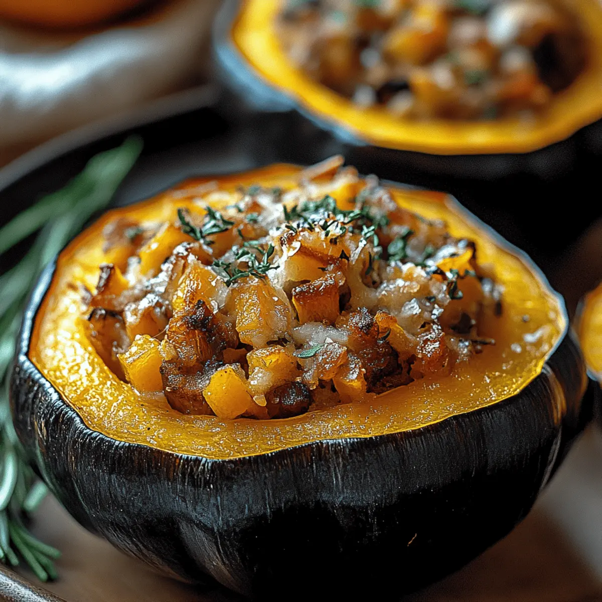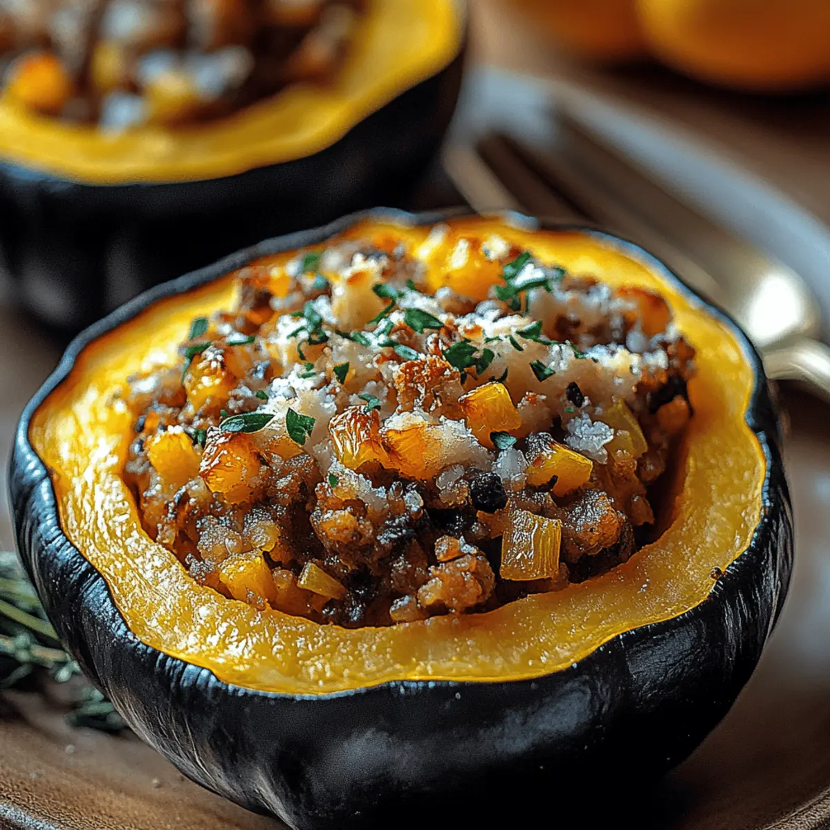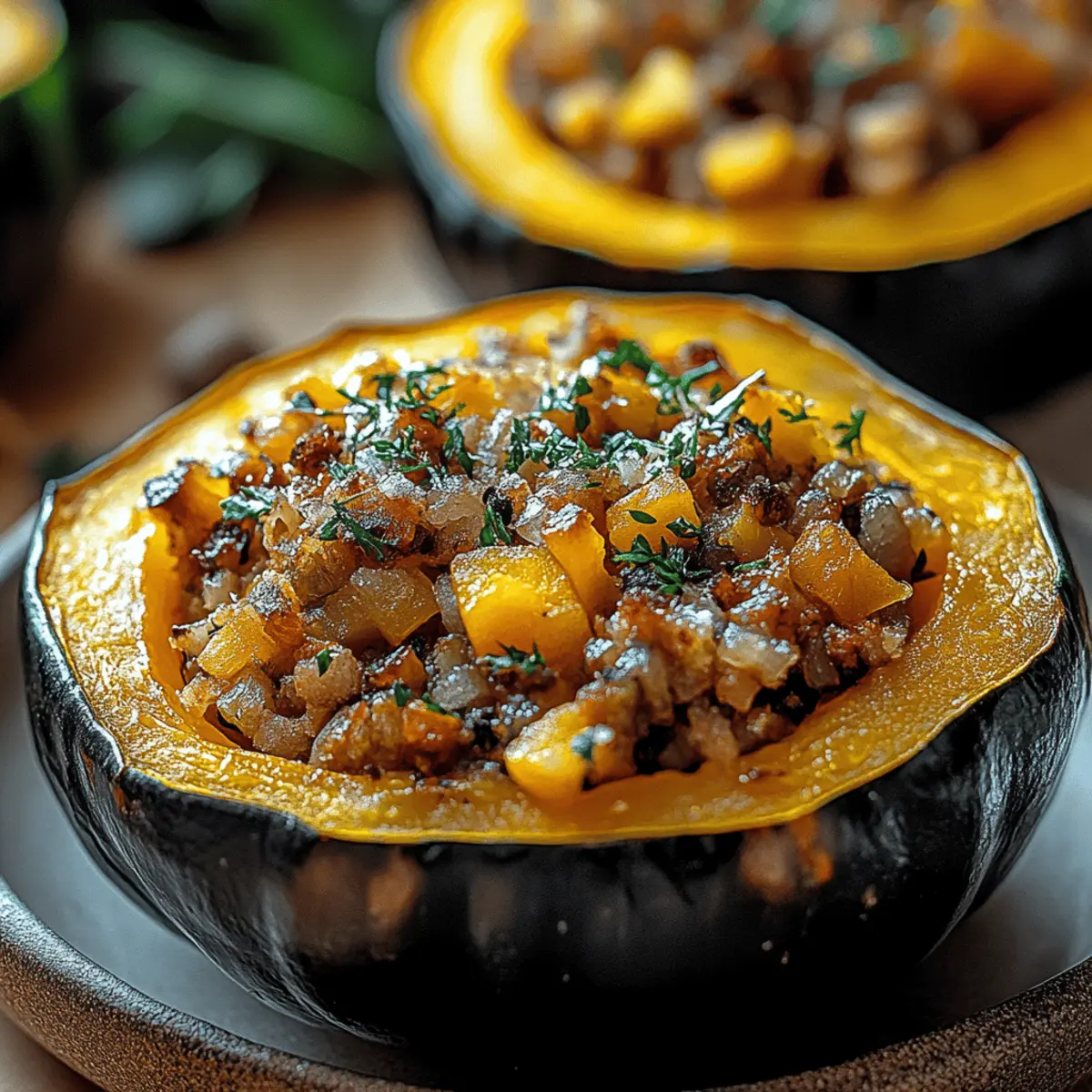 Every year, as we welcome the crispness of fall, my kitchen transforms into a haven of cozy recipes and warm aromas. That’s when I rediscover the beauty of Stuffed Acorn Squash. This dish captures the heart of the season with its inviting golden-brown exterior and a filling that’s as versatile as your imagination. Whether you prefer a savory meat-based option or a hearty vegetarian blend, this recipe delivers not just on flavor but also on nutrition, being perfect for those who crave wholesome meals. On busy weeknights, these stuffed squashes let me serve a satisfying, gluten-free dinner in a snap while impressing friends and family alike. Curious to see how you can customize this dish to fit your tastes? Let’s dive into the delicious details! Why Try Stuffed Acorn Squash? Nutritious and Wholesome: Packed with vitamins A and C, this dish is not only delicious but also a healthy option for anyone looking to nourish their body. Customizable to Your Taste: Whether you’re a fan of savory meat or delicious plant-based proteins, the filling options are endless and cater to every diet. Quick Weeknight Meal: Ready in less than an hour, this cozy dish saves time while delivering that homemade goodness you crave. Crowd-Pleasing Presentation: The vibrant colors and golden-brown edges make for an impressive centerpiece at gatherings, sure to wow your guests! Perfectly Balanced Flavors: Each bite combines sweet and savory, giving you a warm hug of flavor that’s perfect for autumn evenings. Dive deeper into the ease of cooking with seasonal ingredients and explore more suggestions for your dinner table! Stuffed Acorn Squash Ingredients For the Squash • Acorn Squash – The star of the dish; choose medium-sized for uniform roasting. • Olive Oil – Enhances flavor and moisture; melted butter or avocado oil can also work well. For the Filling • Onions – Adds a touch of sweetness and depth; shallots can be used for a milder taste. • Garlic – Infuses the filling with aromatic goodness; fresh is best, but powdered can substitute. • Ground Meat/Plant-Based Protein – Essential for protein; options include turkey, chicken, or lentils for a vegetarian twist. • Cooked Grains (e.g., quinoa, rice) – Adds bulk and fiber; couscous or barley are great alternatives. • Nuts/Seeds/Dried Fruit – Enhance texture and flavor; consider walnuts, pecans, or cranberries—omit if allergies are a concern. • Spices/Herbs – Elevate the taste; thyme, sage, or cumin work wonderfully in this stuffed acorn squash. For the Topping • Cheese (optional) – Contributes richness; shredded cheddar or a vegan cheese alternative can enrich the dish for dairy-free options. This Stuffed Acorn Squash recipe invites creativity and can be adjusted to suit your taste buds and dietary needs. Your cozy and customizable dinner awaits! Step‑by‑Step Instructions for Stuffed Acorn Squash Step 1: Preheat the Oven Begin by preheating your oven to 400°F (200°C). This step is crucial to ensure your Stuffed Acorn Squash achieves the perfect roasting temperature. While the oven warms up, gather your acorn squash and prepare for slicing. Step 2: Prepare the Acorn Squash Carefully slice the acorn squash in half from stem to bottom. Use a spoon to scoop out the seeds, creating a hollow space for the filling. Brush the cut sides with olive oil and season lightly with salt and pepper. Place the squash halves cut-side down on a baking sheet and roast them for 30-40 minutes or until they are tender and slightly caramelized. Step 3: Sauté the Vegetables While the squash roasts, heat 2 tablespoons of olive oil in a skillet over medium heat. Add diced onions and minced garlic, sautéing for about 5-7 minutes until they are soft and fragrant. Stir occasionally to prevent browning, and enjoy the warm aromas filling your kitchen while continuing with the Stuffed Acorn Squash preparation. Step 4: Cook the Filling Add your choice of ground meat or plant-based protein to the skillet with onions and garlic. Cook until the protein is fully browned, breaking it into small crumbles, which should take about 7-10 minutes. Once cooked, introduce your cooked grains, nuts, seeds, or dried fruit, along with chosen spices and herbs. Stir well and let the mixture simmer for an additional 2-3 minutes to meld the flavors beautifully. Step 5: Fill the Squash After roasting, carefully flip the acorn squash halves cut-side up on the baking sheet. Generously spoon the filling mixture into each half, packing it well. If desired, sprinkle shredded cheese on top for an extra touch of richness. This filling not only enhances the flavor but also adds visual appeal to the Stuffed Acorn Squash. Step 6: Bake Again Set the oven temperature to 375°F (190°C) and return the stuffed squash to the oven. Bake for an additional 15 minutes or until the cheese is melted and bubbly, creating a golden crust on top. These final minutes elevate the dish, infusing your space with delightful cooking scents. Step 7: Serve and Enjoy Once baked, allow the Stuffed Acorn Squash to cool for a few minutes before serving. Garnish with fresh herbs like parsley or cilantro for an extra pop of color and flavor. This warm, hearty dish is now ready to impress your family or guests with its cozy presentation and nourishing ingredients! How to Store and Freeze Stuffed Acorn Squash Fridge: Store leftover stuffed acorn squash in an airtight container for up to 3 days. This way, you can easily enjoy the cozy dish again without losing flavor or texture. Freezer: For longer storage, freeze the filling separately from the squash halves. Wrap the squash tightly in plastic wrap and place in a freezer bag; it can last for up to 3 months. Reheating: To reheat, thaw in the fridge overnight, then warm in the oven at 350°F (175°C) for about 20-25 minutes, ensuring the stuffed acorn squash is heated through without drying out. Room Temperature: Avoid leaving stuffed acorn squash at room tempera