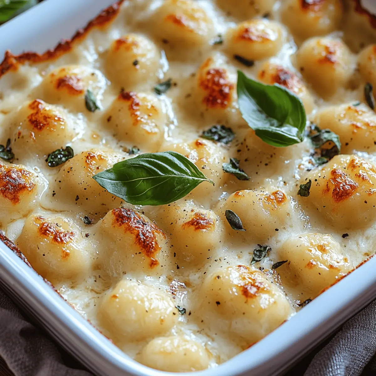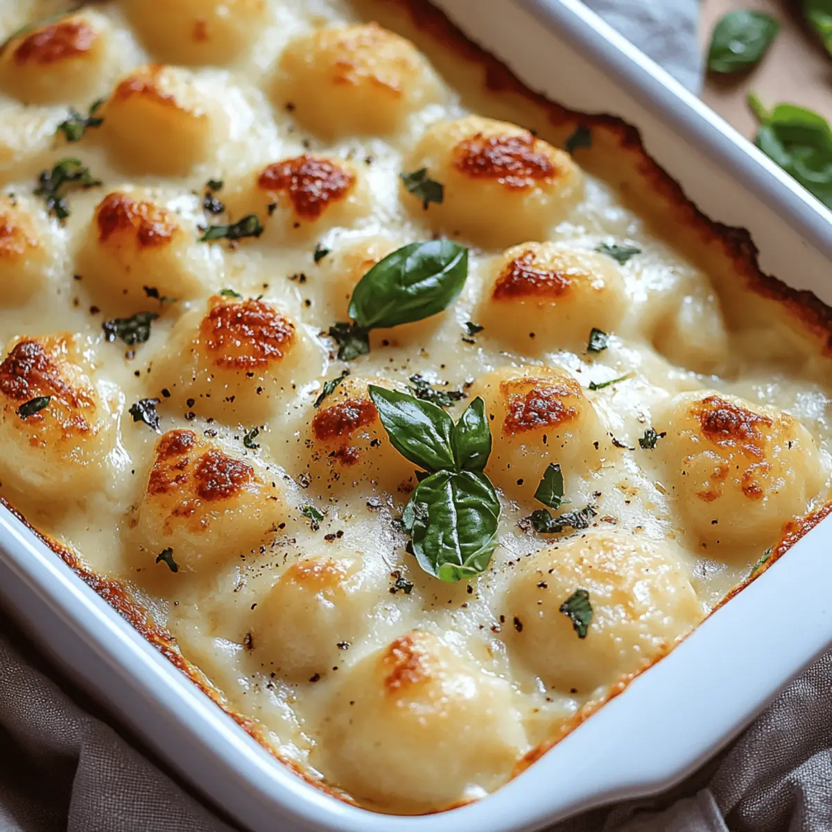 The aroma wafting from the oven was intoxicating—it was the kind of moment that makes cooking feel like magic. My Creamy Baked Gnocchi brings together pillowy gnocchi and an elegant herbed white sauce that creates a truly comforting dish perfect for any night of the week. This recipe not only promises a quick and easy weeknight dinner but also doubles as a crowd-pleaser for dinner parties. With just a handful of ingredients, you can impress your guests with its rich, cheesy profile and the opportunity for endless variations—think vibrant veggies or savory proteins. Are you ready to transform your weeknight meals into something extraordinary? Let’s dive into this delightful dish! Why is Creamy Baked Gnocchi a Must-Try? Comforting Indulgence: There’s nothing quite like this dish to warm your soul after a long day. Quick & Easy: This recipe comes together in under an hour, making it ideal for busy weeknights. Versatile Options: Customize with your favorite veggies or proteins to cater to different tastes. Rich, Cheesy Goodness: The combination of Fontal and Parmesan creates an irresistible sauce that clings to soft gnocchi. Dinner Party Delight: Impress your guests with a gourmet feel that requires minimal effort. Dive into this delicious idea that’s sure to become a household favorite! Creamy Baked Gnocchi Ingredients For the Gnocchi • Gnocchi – This soft and chewy pasta is the star of our creamy baked dish; store-bought is convenient but homemade elevates the experience. For the White Sauce • Butter – Adds richness and flavor needed in the smooth white sauce. • Milk – Use 2% or whole milk for that creamy texture—you can even swap in cream for extra indulgence. • Flour – Essential for thickening the sauce into a velvety consistency. • Salt – A small yet powerful ingredient that enhances all the flavors in the dish. For the Herbs • Basil – Introduces a fresh, aromatic note; feel free to substitute with other fresh herbs for variety. • Oregano – Offers an earthy flavor; both dried and fresh versions work beautifully in this recipe. For the Cheeses • Parmesan Cheese – This assertive cheese is best freshly grated for maximum meltiness. • Fontal Cheese – Adds creaminess to the dish; Gruyere, Provolone, or Gouda are excellent alternatives if needed. For the Garnish • Fresh Thyme – Sprinkle this on top before serving for an added herbaceous touch that enhances presentation. Now, let your culinary adventure begin with these essential ingredients for a truly comforting Creamy Baked Gnocchi! Step‑by‑Step Instructions for Creamy Baked Gnocchi Step 1: Preheat the Oven Begin by preheating your oven to 375°F (190°C). While the oven warms up, take a moment to lightly grease a baking dish with butter or cooking spray to ensure your Creamy Baked Gnocchi doesn’t stick. This step sets the stage for a perfectly baked dish with a bubbling, golden crust. Step 2: Cook the Gnocchi In a large pot of boiling salted water, cook the gnocchi according to the package instructions, usually about 2-3 minutes. You’ll know they are ready when they float to the surface. Carefully drain the cooked gnocchi using a colander and set them aside. This soft pasta is the heart of your creamy dish. Step 3: Make the White Sauce In a medium saucepan over medium heat, melt 4 tablespoons of butter. Once melted, whisk in 1/4 cup of flour to create a smooth roux, cooking for about 1 minute until it’s lightly golden. This forms the base of your luscious herbed sauce that will envelop the gnocchi. Step 4: Thicken the Sauce Gradually pour in 2 cups of milk while constantly whisking to prevent lumps. Cook the mixture for 3-5 minutes until it thickens and coats the back of a spoon. You’re aiming for a velvety texture that adds creaminess to your Creamy Baked Gnocchi, making it truly indulgent. Step 5: Season the Sauce Once thickened, season your sauce with a pinch of salt, 1 tablespoon of dried basil, and 1 teaspoon of dried oregano. Stir in half of the grated Parmesan and all of the Fontal cheese, combining until melted and smooth. This step infuses rich flavors and gives your sauce that luxurious quality. Step 6: Combine Gnocchi and Sauce Gently fold the cooked gnocchi into the creamy white sauce, ensuring every piece is well-coated with the rich goodness. Transfer this delicious mixture into your prepared baking dish. It’s crucial to ensure that every gnocchi is covered for that ultimate creamy satisfaction. Step 7: Prepare for Baking Sprinkle the remaining grated Parmesan over the top of the gnocchi and finish with fresh thyme for a delightful aroma and presentation. The cheese will form a comforting, crispy layer while baking, adding to the overall indulgence of your Creamy Baked Gnocchi. Step 8: Bake until Golden Place the baking dish in the preheated oven and bake for 20-25 minutes, or until the top is bubbly and golden brown. You’re looking for that enticing golden crust that promises comforting flavors and a satisfying texture in every bite of your dish. Step 9: Serve Warm Once baked, remove your Creamy Baked Gnocchi from the oven and let it cool for a few minutes before serving. Pair it with a fresh green salad or roasted vegetables for a balanced meal. Enjoy every comforting bite of this indulgent dish with family and friends! What to Serve with Creamy Baked Gnocchi Transform your Cozy Gnocchi into a memorable meal with these delightful accompaniments that balance flavors, textures, and freshness. Fresh Green Salad: A bright, crisp salad with mixed greens and a tangy vinaigrette adds a refreshing contrast to the richness of the gnocchi. Garlic Bread: Warm, buttery garlic bread perfectly complements the dish while providing a satisfying crunch for dipping into that creamy sauce. Roasted Vegetables: Tossed in olive oil and herbs, roasted vegetables bring a sweet, smoky flavor that enhances the comfort of the baked pasta. Grilled Asparagus: This vibrantly green veggi