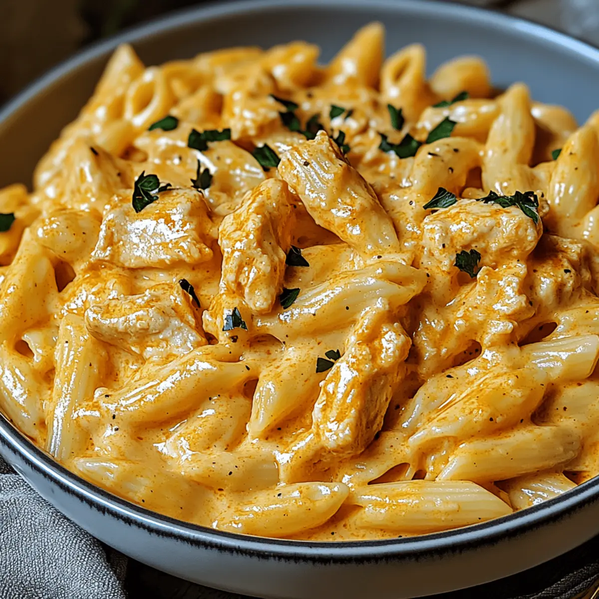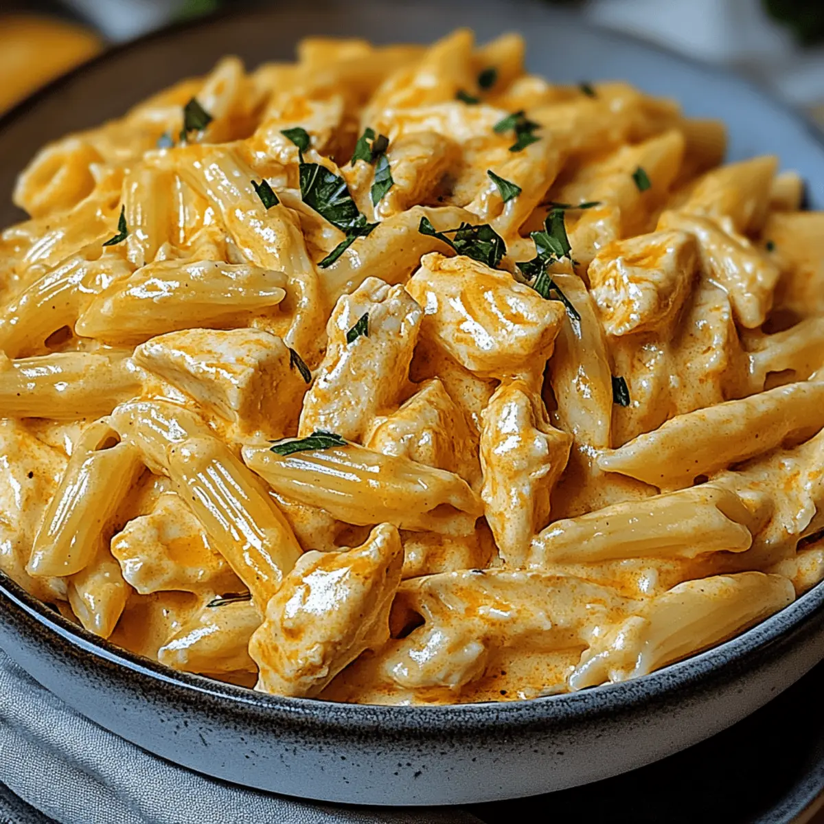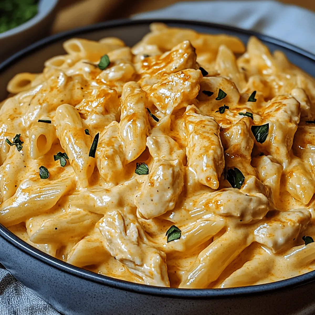 The rich, smoky aroma of garlic sizzling in butter filled the kitchen, instantly transporting me to a cozy family gathering where good food and laughter went hand-in-hand. That’s when I knew I was onto something special: Creamy Buffalo Chicken Pasta, a delightful dish that melds hearty comfort with a spicy kick. This one-pot wonder not only satisfies those weeknight cravings but also doubles as a crowd-pleaser during get-togethers. Plus, it’s incredibly adaptable, allowing anyone to tweak the heat level to their taste, and can easily be made gluten-free with the right pasta. Why not give your dinner routine a fun twist with this recipe that’s both creamy and bold? Isn’t it time to spice up your table? Why is Creamy Buffalo Chicken Pasta a Must-Try? Indulgence awaits you with this dish that perfectly balances creamy goodness and bold flavor. Customizable to your taste, you can adjust the spice level for the whole family to enjoy. One-pot convenience means less cleanup after a delicious meal, making it a time-saver you’ll love. For those seeking gluten-free options, simply swap out the pasta for a gluten-free variety. Join in on the fun by pairing this pasta with a fresh garden salad or serve it with celery sticks for a crunchy contrast. You deserve an exciting dinner that brings everyone together! Creamy Buffalo Chicken Pasta Ingredients • A delicious adventure awaits in every bite! For the Pasta Pasta – Choose your favorite shape; gluten-free pasta works beautifully for a dietary twist. For the Chicken Chicken – Diced chicken breasts or thighs provide heartiness to this creamy buffalo chicken pasta. For the Sauce Buffalo Sauce – Adjust the heat to your liking; this is what makes the dish so irresistible. Heavy Cream – Brings luscious creaminess; can be substituted with cream cheese for a tangy finish. For Added Flavor Garlic – Fresh minced garlic enhances the flavor profile; don’t skip this essential ingredient! Onion – Yellow or white onion adds sweetness; sautéing it brings even more depth. Butter – Essential for sautéing; it allows the flavors to meld beautifully. For the Finish Shredded Cheese – Mozzarella or cheddar works best for that gooey texture you crave. Fresh Parsley/Chives – Adds a pop of color and freshness to your creamy masterpiece. Optional Blue Cheese – Perfect for blue cheese lovers, intensifying the flavor of your buffalo sauce. Step‑by‑Step Instructions for Creamy Buffalo Chicken Pasta Step 1: Cook Pasta Begin by boiling a large pot of salted water over high heat. Add your favorite pasta and cook until al dente, usually about 8-10 minutes. Stir occasionally to prevent sticking. Once cooked, drain the pasta and set it aside, allowing the steam to escape while you prepare the rest of this creamy buffalo chicken pasta. Step 2: Sear Chicken In a large skillet, melt 2 tablespoons of butter over medium-high heat. Add diced chicken breasts or thighs and season lightly with salt and pepper. Sear the chicken for about 6-8 minutes, turning occasionally until golden brown and fully cooked. The chicken should reach an internal temperature of 165°F. Remove the chicken from the skillet and set it aside. Step 3: Sauté Aromatics In the same skillet, add a little more butter if needed, then toss in finely chopped onion and minced garlic. Sauté for about 3-4 minutes until the onion is translucent and the garlic is fragrant, stirring frequently. This step builds the rich flavor base for your creamy buffalo chicken pasta, enhancing the dish’s overall aroma. Step 4: Combine Sauces Pour in the buffalo sauce and heavy cream into the skillet with the sautéed aromatics. Stir well to combine all the ingredients, letting the mixture come to a gentle simmer for about 2-3 minutes. You want to see the sauce thicken slightly and become smooth, which will coat your pasta beautifully later on. Step 5: Mix Pasta Return the cooked pasta to the skillet, tossing gently to combine it with the creamy buffalo sauce and cooked chicken. Ensure each piece of pasta is well-coated in the sauce. Allow everything to warm together for an additional 2-3 minutes so the flavors meld, creating a deliciously rich and spicy dish. Step 6: Garnish & Serve Once combined, sprinkle a generous amount of shredded cheese over the top of the pasta, allowing it to melt into the dish. Remove from heat and sprinkle with fresh parsley or chives for color and added freshness. Serve the creamy buffalo chicken pasta immediately, enjoying every rich, comforting bite! Make Ahead Options These Creamy Buffalo Chicken Pasta preparations are perfect for busy weeknights! You can cook the pasta and store it in the refrigerator for up to 3 days in an airtight container. Additionally, the chicken can be sautéed and combined with the buffalo sauce and heavy cream, refrigerating this mixture for up to 24 hours before you’re ready to serve. When you’re ready to enjoy your meal, just reheat the chicken mixture gently on the stove, add the cooked pasta, and sprinkle shredded cheese on top until melted. This way, you’ll have a wonderfully rich and creamy dish that tastes just as delightful as when made fresh, giving you a quick and satisfying dinner option! Helpful Tricks for Creamy Buffalo Chicken Pasta Heat Level: Start with half the amount of buffalo sauce and taste as you go, ensuring the spice suits your family’s preferences. Pasta Selection: While penne works well, any short pasta like fusilli or rotini can hold the sauce beautifully. Sauté Right: Always sauté garlic and onions until fragrant; this enhances the flavors and avoids any raw taste in your creamy buffalo chicken pasta. Storage Savvy: Store leftovers in an airtight container; reheat gradually on low heat to maintain the creaminess without curdling. Cheese Variations: Mix different cheeses like pepper jack for a spicy twist or fontina for an ultra-creamy texture. What to Serve with Creamy Buffalo Chicken Pasta Imagine the warm, i