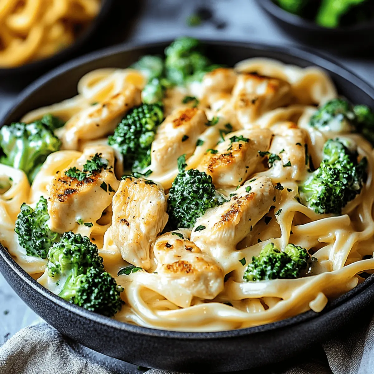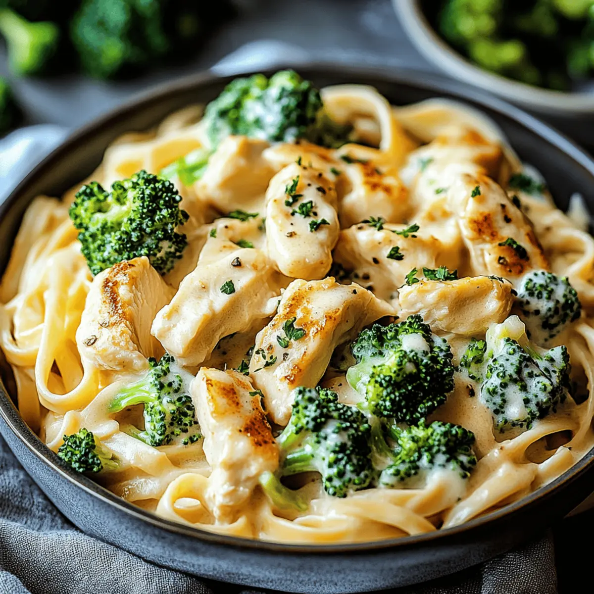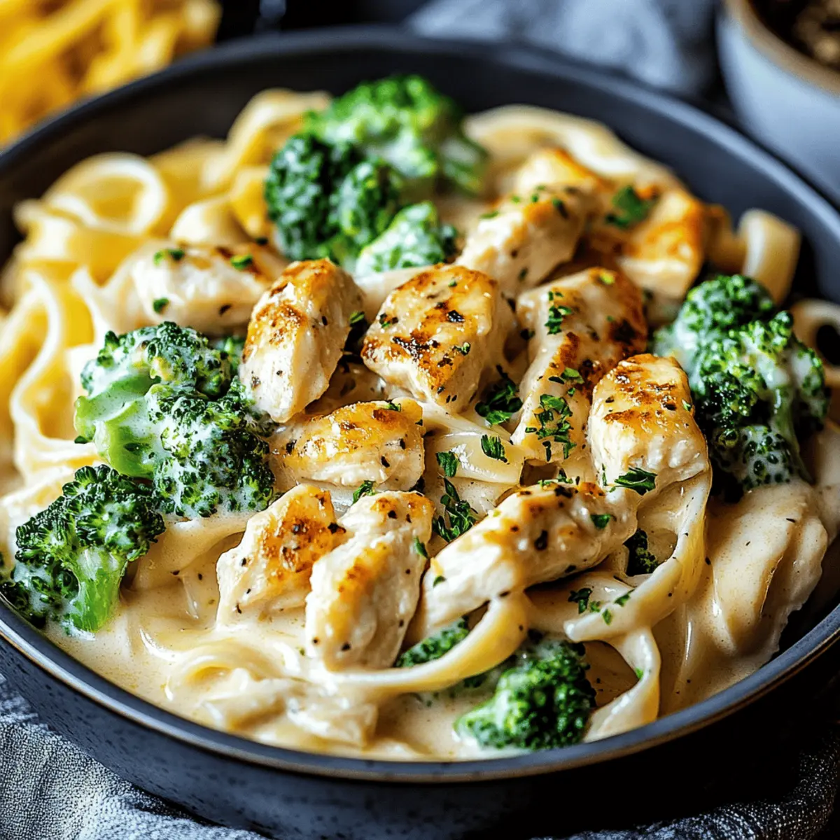 As the clock strikes 6 PM, the pressure mounts—yet here comes my secret weapon: 25-Minute Creamy Chicken Broccoli Alfredo! This dish transforms a rushed evening into a cozy feast in no time. It features tender chicken and vibrant broccoli enveloped in a rich, velvety Alfredo sauce that’s simply irresistible. Beyond its quick prep time—because who has hours to spend on dinner?—I love that this recipe is incredibly customizable, making it a perfect fit for any dietary need. Whether you’re gluten-free or craving a vegan twist, this dish has you covered. Just imagine getting everyone around the table with smiles all around—who could resist? Ready to learn how to whip this up effortlessly? Let’s dive into the details! Why is this Alfredo a game-changer? Quick and Easy: In just 25 minutes, you can serve a restaurant-quality meal that will impress family and friends. No more late-night takeout runs! Creamy Comfort: The rich Alfredo sauce beautifully intertwines with the tender chicken and bright broccoli for a satisfying experience that feels indulgent every time. Customizable: Whether you’re following a gluten-free diet or looking for a vegan alternative, this recipe easily adapts to fit your needs. Check out my tips for gluten-free modifications and more! Crowd-Pleaser: Perfect for family dinners or hosting friends, this dish brings comfort and joy to the table, ensuring everyone leaves happy and full. Minimal Cleanup: One skillet is all you need! Less fuss means more time to enjoy your delicious creation and the company you’re sharing it with. Creamy Chicken Broccoli Alfredo Ingredients • Get ready to gather the essential components of this delicious dish! For the Chicken and Broccoli Chicken Breast – Provides protein and heartiness; substitute with boneless thighs for a juicier option. Broccoli Florets – Adds color, texture, and nutrition; frozen broccoli can be used; add earlier for heating. For the Pasta Pasta (e.g., fettuccine) – Base of the dish with a comforting bite; swap for gluten-free pasta if needed. For the Sauce Olive Oil – Adds flavor and helps cook the chicken; can use any neutral cooking oil. Butter – Bases the Alfredo sauce, providing rich flavor. Garlic – Enhances aroma and flavor profile; use garlic powder if fresh is unavailable. Heavy Cream – Creates the creamy texture of the Alfredo sauce; can substitute with half-and-half or milk for lighter options. Parmesan Cheese – Offers a nutty, salty flavor that thickens the sauce; grate fresh for best results; can use nutritional yeast for a vegan option. Salt and Pepper – Essential for seasoning to enhance all flavors. Step‑by‑Step Instructions for Creamy Chicken Broccoli Alfredo Step 1: Prepare Ingredients Begin by bringing a large pot of salted water to a boil for the pasta. While waiting, chop the chicken breast into bite-sized pieces, and cut the broccoli florets into manageable bits. Mince 2 cloves of garlic, and finely grate about a cup of Parmesan cheese. Having everything ready ensures a smooth cooking process for your Creamy Chicken Broccoli Alfredo. Step 2: Cook Pasta Once the water is boiling, add your pasta of choice, such as fettuccine, and cook it for about 8-10 minutes until almost al dente. In the final 3 minutes of cooking, toss in the broccoli florets for quick steaming. This method ensures vibrant color and texture, essential for the Creamy Chicken Broccoli Alfredo, so drain the pasta and broccoli together, reserving a splash of pasta water. Step 3: Cook Chicken In a large skillet, heat 2 tablespoons of olive oil over medium heat until shimmering. Add the chopped chicken to the skillet, seasoning with salt and pepper. Sauté for about 5-7 minutes, turning occasionally, until the chicken is golden brown and cooked through. This step infuses the dish with savory flavor, making your Creamy Chicken Broccoli Alfredo heartier. Step 4: Make Sauce Reduce the heat to medium-low and add 3 tablespoons of butter to the same skillet, allowing it to melt. Once melted, stir in the minced garlic, cooking for around 30 seconds until fragrant but not burnt. Gradually whisk in 1 cup of heavy cream, letting it simmer for about 2-3 minutes until slightly thickened. This creamy base is the heart of your Creamy Chicken Broccoli Alfredo. Step 5: Combine Mix the grated Parmesan cheese into the creamy sauce, stirring continuously until melted and smooth. Next, add the drained pasta and broccoli to the skillet, tossing everything together until well coated in the rich Alfredo sauce. This stage brings all the flavors together, creating a comforting, cohesive dish that defines your Creamy Chicken Broccoli Alfredo. Step 6: Serve Spoon the Creamy Chicken Broccoli Alfredo onto plates, garnishing with fresh chopped parsley or basil and an extra sprinkle of Parmesan cheese on top. Serve immediately while the dish is warm and inviting. The creamy, indulgent flavors are sure to bring smiles around the table, making this meal a delightful ending to your busy day. Make Ahead Options These Creamy Chicken Broccoli Alfredo preparations will save you precious time on busy weeknights! You can chop the chicken and broccoli, mince the garlic, and grate the Parmesan cheese up to 24 hours in advance, storing them in airtight containers in the refrigerator to maintain freshness. Additionally, you can cook the pasta and chill it for up to 3 days as well, just be sure to add a sprinkle of olive oil to prevent sticking. When you’re ready to enjoy this delicious meal, simply sauté the chicken, make the sauce, and toss everything together with the prepared components. It’ll be just as creamy and satisfying as if you made it from scratch that evening! What to Serve with Creamy Chicken Broccoli Alfredo Transform your delicious dish into a complete meal with perfect pairings! Crisp Green Salad: A refreshing mix of greens with a tangy vinaigrette cuts through the rich sauce, adding brightness to your plate. Garlic Brea