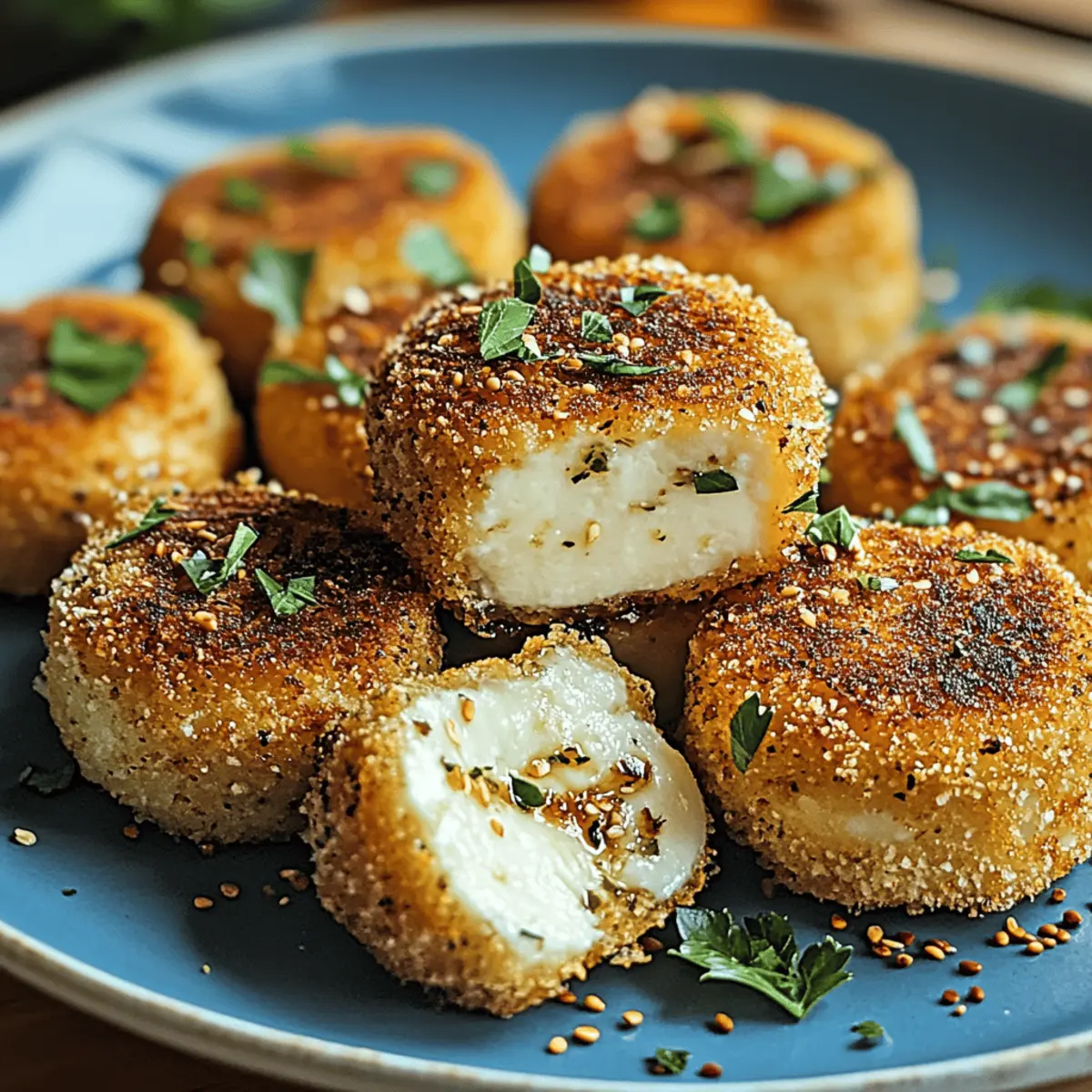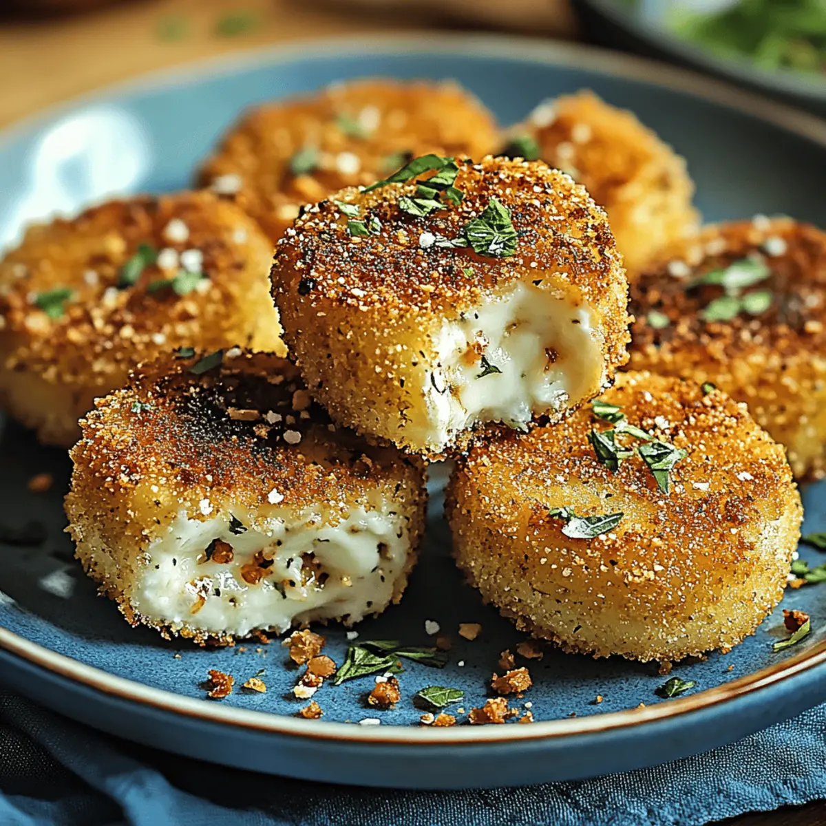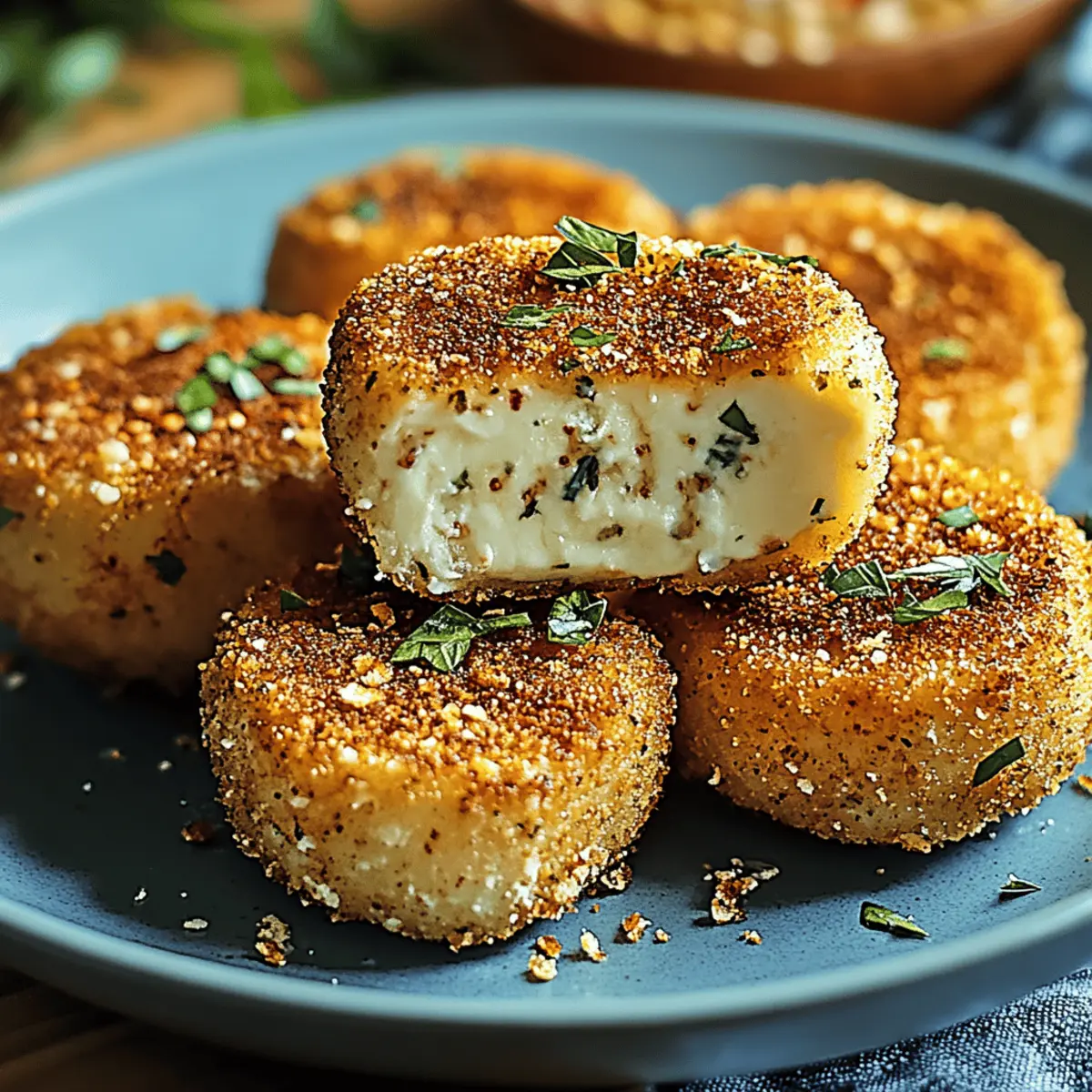 As I stood in my kitchen, the aroma of sizzling oil began to take over, and suddenly, a wave of excitement washed over me. Today, I’m making Crispy Fried Goat Cheese with Fresh Herbs, a divine appetizer that perfectly combines a crunchy, golden crust with luscious, creamy goat cheese. This dish is not only a hit at gatherings, but it’s also a great way to elevate your weeknight dinners with minimal effort. With just a handful of ingredients, you’ll whip up a gourmet experience right in your home! Plus, it’s gluten-free friendly, ensuring everyone at the table can indulge without worries. Are you ready to impress your friends and family with this delicious recipe? Let’s dive in! Why is this goat cheese recipe irresistible? Unique flavors collide in this dish, where creamy, tangy goat cheese embraces the freshness of herbs, creating a taste sensation that is simply unmatched. Simplicity reigns as this recipe features only a few ingredients, making it both approachable and delicious. Versatile options allow you to customize with your favorite herbs or even substitute cheeses, ensuring that this dish is your own! Whether you’re preparing for a crowd-pleasing appetizer or a cozy dinner, this Crispy Fried Goat Cheese with Fresh Herbs is your ticket to culinary delight. And if you enjoy variety, check out our options for gluten-free flour substitutions to suit all preferences! Crispy Fried Goat Cheese Ingredients • Get ready to create a flavor masterpiece with just a few simple ingredients! For the Cheese Goat Cheese – A rich and tangy option; softer varieties melt beautifully, creating a creaminess that pairs perfectly with herbs. Fresh Herbs – Experiment with parsley, thyme, chives, or basil for aromatic enhancements; they infuse the cheese with vibrant flavors. For the Coating Flour – Use as a base coating for crispy texture; opt for gluten-free flour to accommodate dietary needs. Eggs – Important for binding; no substitutes needed unless you want a vegan option, in which case a flax egg works well. Panko Breadcrumbs – Crucial for that extra crunch; gluten-free panko is available for a tasty alternative. For Frying Oil (for frying) – Choose high smoke point oils like canola or vegetable oil for a beautifully golden crust. Get ready to whip up this Crispy Fried Goat Cheese with Fresh Herbs that’ll surely delight your taste buds and impress everyone at your table! Step‑by‑Step Instructions for Crispy Fried Goat Cheese with Fresh Herbs Step 1: Prepare the Goat Cheese Begin by slicing the goat cheese into thick rounds, about 1/2 inch thick. Firmly press your choice of finely chopped fresh herbs—such as parsley, thyme, or chives—onto both sides of each cheese round. This step infuses the cheese with vibrant flavors, making your Crispy Fried Goat Cheese absolutely irresistible. Step 2: Set Up the Dredging Station Create a well-organized dredging station by placing three shallow bowls in a row. In the first bowl, add seasoned flour; in the second, beat a couple of eggs until smooth; and in the third, combine panko breadcrumbs with additional herbs for extra flavor. Having everything ready will make the coating process for your fried goat cheese quick and enjoyable. Step 3: Coat the Cheese Rounds Take each herb-coated goat cheese round and gently coat it in the seasoned flour, ensuring an even layer. Next, dip the floured cheese into the beaten egg, letting any excess drip off. Finally, roll the cheese in the panko breadcrumb mixture, pressing lightly to adhere. This creates a beautiful, crisp coating that will fry up to a golden perfection. Step 4: Chill the Coated Cheese Once coated, place the breaded cheese rounds on a plate or baking sheet. Refrigerate them for about 30 minutes. This chilling step is crucial for setting the coating and helps maintain the structure during frying, ensuring your Crispy Fried Goat Cheese stays beautifully intact. Step 5: Heat the Oil for Frying In a large skillet, pour enough oil (about 1/2 inch deep) to submerge the cheese rounds partway. Heat the oil over medium heat until it reaches about 350°F (175°C). You can test if the oil is ready by dropping in a small piece of breadcrumb; it should sizzle immediately. This temperature helps achieve that golden crust without absorbing excess oil. Step 6: Fry the Cheese Rounds Gently place the chilled, coated cheese rounds into the hot oil, being careful not to overcrowd the pan. Fry each round for about 2 minutes on each side or until they turn a rich, golden brown. The aroma will be irresistible, signaling that your Crispy Fried Goat Cheese is nearly ready to impress. Step 7: Drain and Serve Once golden and crispy, use a slotted spoon to transfer the fried cheese rounds onto a plate lined with paper towels to drain excess oil. Serve immediately while hot, garnished with more fresh herbs or a drizzle of honey if desired. Your guests will be delighted by this flavorful creation. What to Serve with Crispy Fried Goat Cheese with Fresh Herbs Elevate your appetizer experience by complementing the rich flavors and textures of fried goat cheese with these delightful pairings. Crisp Green Salad: A refreshing salad with mixed greens and a light vinaigrette cuts through the creaminess, balancing your dish. Roasted Vegetables: Sweet, caramelized seasonal veggies add depth and a satisfying contrast to the crispy goat cheese. Crusty Bread: Serve with slices of warm, crusty baguette to scoop up the cheese and add a wholesome texture. Spicy Aioli: This zesty dipping sauce enhances the savory elements of the goat cheese while adding a creamy touch to every bite. Honey Drizzle: A drizzle of honey brings out the tanginess of the goat cheese, creating a delightful sweet and savory contrast. Lemon-Infused Yogurt: This tangy dip perfectly complements the richness of the cheese, offering a cooling, creamy balance for your palate. Toasted Nuts: Adding crunchy toasted nuts, such as walnuts or almonds, introduc