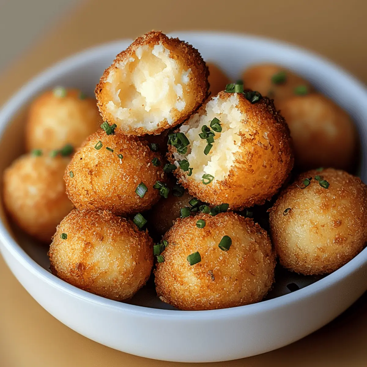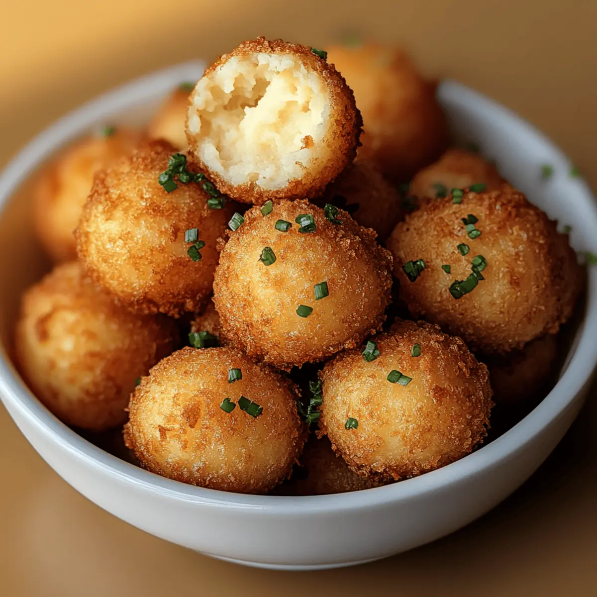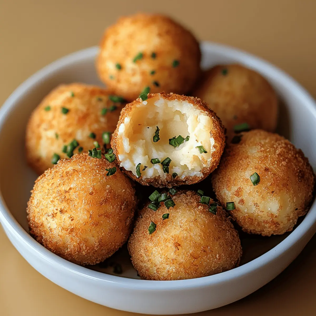 As I stood in the kitchen, the aroma of boiling potatoes filled the air, bringing back warm memories of family gatherings and comfort food. Today, I’m excited to share a playful twist: Crispy Fried Mashed Potato Balls! These delightful snacks boast a golden, crunchy exterior that leads to a creamy, savory center, making them the perfect comfort food. What I love most is their remarkable versatility—you can easily customize them to be gluten-free or vegan, catering to everyone at your table. Plus, they come together in a snap, ideal for parties or those cozy evenings when you want something satisfying without spending hours cooking. Ready to discover how to turn leftover mashed potatoes into these delectable bites? Let’s get started! Why Are These Potato Balls Amazing? Crispy Texture: The golden breaded exterior delivers an irresistible crunch that contrasts beautifully with the creamy interior. Customizable Delight: Perfect for all diets, these potato balls can easily meet gluten-free or vegan needs, ensuring everyone can enjoy. Quick to Make: With just a few simple steps, you’ll have delicious snacks ready in no time, making them an ideal choice for last-minute gatherings. Crowd-Pleasing: Who doesn’t love comfort food? These balls are sure to be a hit, perfect for parties or family movie nights. Flavorful Twist: Mix in unique ingredients like bacon or spices to keep things exciting and suit everyone’s palette. Try pairing your Crispy Fried Mashed Potato Balls with a zesty sauce or a fresh salad for a delightful snacking experience! Crispy Fried Mashed Potato Balls Ingredients Discover the tasty components behind these irresistible treats! For the Potato Mixture • Potatoes – Use starchy varieties like Russets for the perfect creamy texture. • Butter – Adds richness; swap with margarine for a dairy-free option. • Cheese – Cheddar enhances flavor; omit for a vegan version. • Egg – Binds ingredients together; substitute with flaxseed meal mixed with water for vegan use. For the Coating • Bread Crumbs – Provides a crunchy shell; gluten-free breadcrumbs work great for gluten-free lovers. • Seasonings (salt, pepper, herbs) – Elevate the taste; customize with garlic powder for an extra kick. Dipping Sauce Ideas • Garlic Aioli – A classic choice that complements the potato balls wonderfully. • Ketchup – For a nostalgic, sweet pairing that everyone loves. • Spicy Ranch – Adds a flavorful zing for those who enjoy a bit of heat. Make sure to gather these ingredients to whip up a batch of Crispy Fried Mashed Potato Balls that will make your taste buds smile! Step‑by‑Step Instructions for Crispy Fried Mashed Potato Balls Step 1: Prepare Mashed Potatoes Start by peeling and chopping about 2 to 3 large potatoes, then boil them in a pot of salted water until fork-tender, about 15–20 minutes. Drain well and return them to the pot, adding butter and cheese if desired. Mash until creamy but thick enough to shape, adding salt and pepper to taste. Allow the mashed potatoes to cool slightly before handling. Step 2: Shape Potato Balls Once your mashed potatoes have cooled, use a spoon or cookie scoop to take portions of the mixture and roll them into golf ball-sized spheres. Aim for smooth surfaces to ensure an even cook. Place the formed potato balls on a baking sheet lined with parchment paper as you shape the rest, covering them to prevent drying out while preparing to bread them. Step 3: Breading Process In a shallow bowl, beat one egg to create an egg wash. Prepare another plate with breadcrumbs—gluten-free options work well if necessary. Take each potato ball, dip it first into the egg wash, allowing excess to drip off, then roll it in the breadcrumbs until fully coated. This process will create a delicious crunch on your Crispy Fried Mashed Potato Balls. Step 4: Frying the Potato Balls Heat oil in a deep pan to 350°F (175°C), using a thermometer for accuracy. Carefully add the potato balls in batches, ensuring not to overcrowd the pan, and fry for about 3–4 minutes. Keep an eye on them as they should turn a beautiful golden brown. Once done, use a slotted spoon to remove the balls and drain them on paper towels to absorb excess oil. Step 5: Serve Present your deliciously Crispy Fried Mashed Potato Balls hot, paired with your favorite dipping sauces such as garlic aioli or ketchup. For a pop of color and freshness, consider garnishing with chopped parsley or chives before serving. These delightful snacks are sure to be a favorite at any gathering! Expert Tips for Crispy Fried Mashed Potato Balls Perfect Potato Texture: Ensure potatoes are well-drained and allow them to cool slightly before shaping to avoid soggy balls when frying. Oil Temperature Matters: Use a thermometer to maintain the oil at 350°F (175°C) for a crispy exterior. Too hot can burn the coating; too cool makes them greasy. Batch Frying: Fry potato balls in small batches to maintain even cooking and prevent overcrowding, which can drop the oil temperature. Add Flavor: Experiment with different seasonings in the mashed potatoes, including garlic, chives, or cheese, to enhance the taste of your Crispy Fried Mashed Potato Balls. Storage Safety: Refrigerate any leftovers in an airtight container for up to three days or freeze uncooked balls for up to a month before frying to enjoy them later. Storage Tips for Crispy Fried Mashed Potato Balls Room Temperature: Best enjoyed fresh, but if necessary, they can sit out for about 2 hours before safety becomes a concern. Fridge: Store leftover Crispy Fried Mashed Potato Balls in an airtight container for up to 3 days to maintain their flavor and texture. Freezer: For longer preservation, freeze uncooked potato balls on a baking sheet, then transfer to a freezer bag for up to 1 month. Fry them straight from frozen. Reheating: To retain crispiness, reheat the balls in the oven at 375°F (190°C) for 10-15 minutes, making them just as delightf