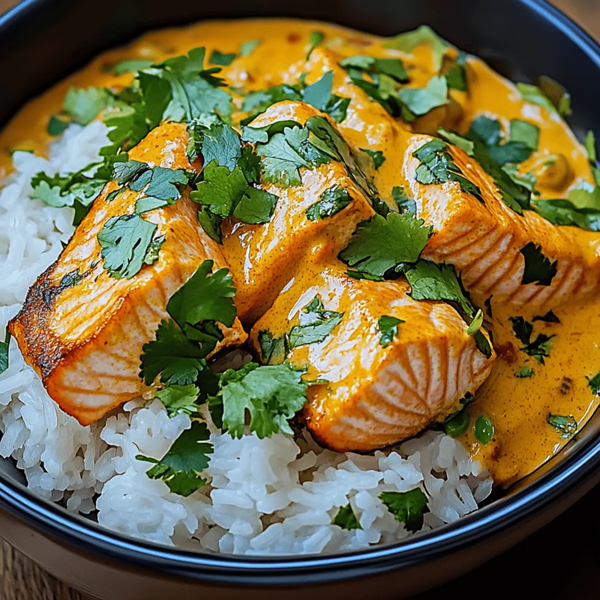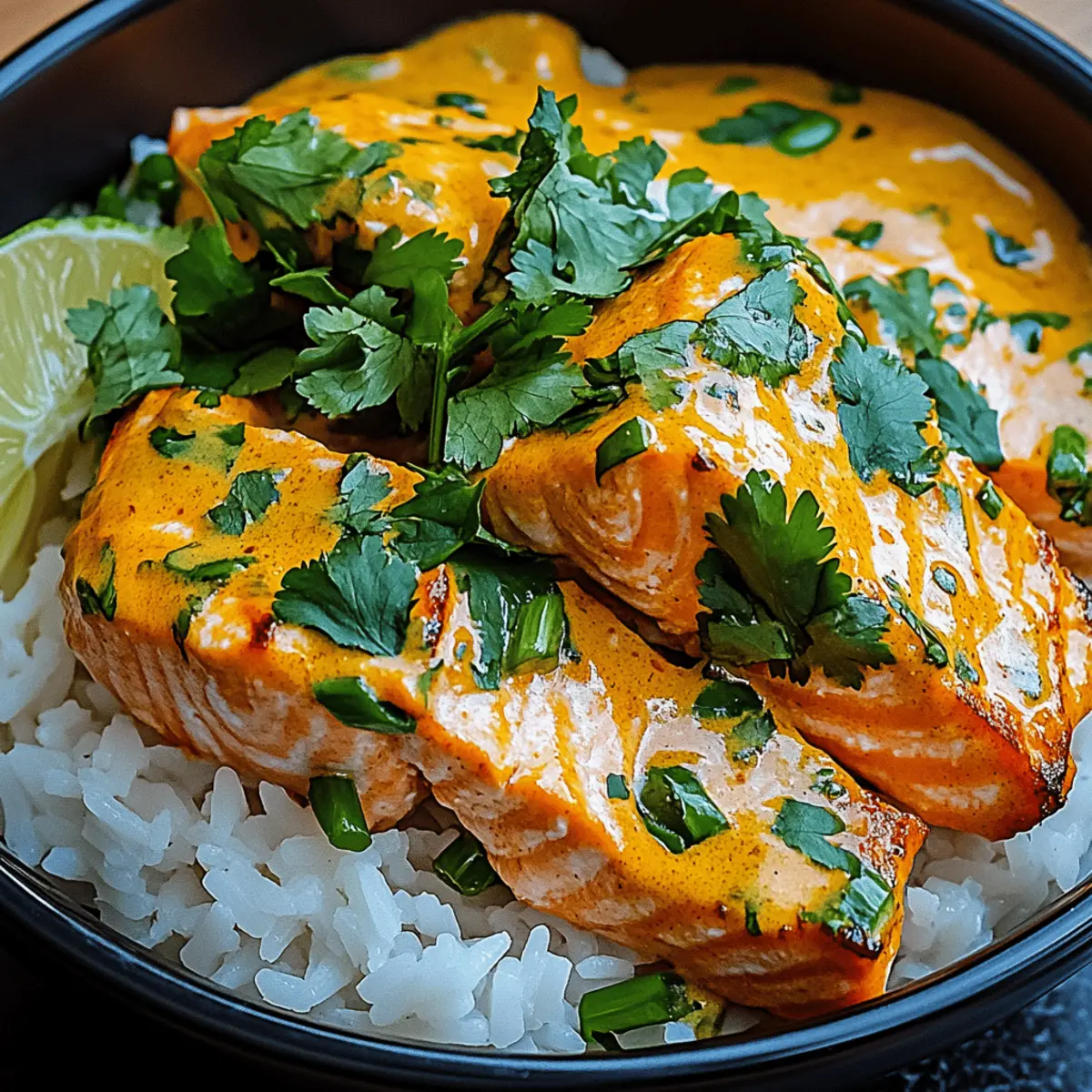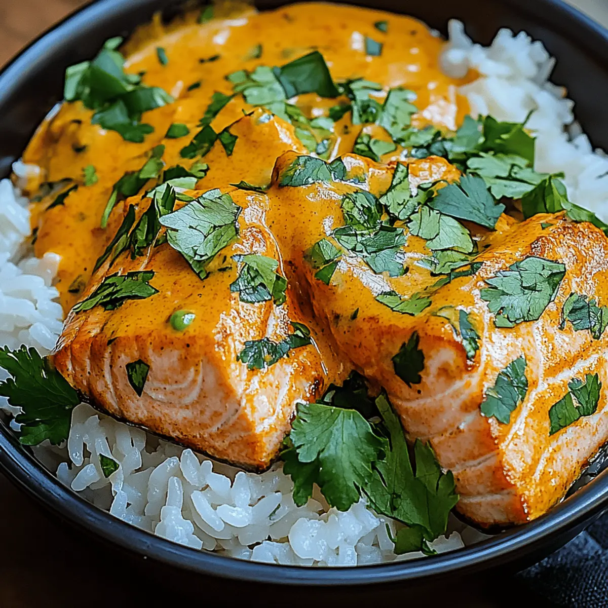 As I stood in my kitchen, the aromatic scent of coconut curry began to weave its magic in the air, instantly transporting me to a sunlit marketplace bursting with vibrant spices. That moment sparked the creation of my Curried Salmon Rice Bowl with Coconut Curry Sauce—a dish that transforms dinner time into a delightful experience. Perfect for those busy weeknights or cozy gatherings, this bowl not only comes together quickly but is also gluten-free and endlessly customizable to your taste. With tender salmon resting atop a bed of fluffy rice, all laced with a creamy, savory curry sauce, each mouthful offers an irresistible blend of flavors that feels like a warm hug. Are you ready to embark on this delicious culinary journey with me? Why is this Curried Salmon Rice Bowl special? Vibrant flavors come together in this dish, creating an explosion of taste that excites the palate. Quick and easy to prepare, it’s perfect for busy weeknights yet elegant enough for dinner parties. Customizable ingredients allow you to make it your own—swap in your favorite protein or veggies! Crowd-pleaser status is guaranteed as everyone will love the rich, coconut curry-infused goodness. Plus, it’s gluten-free, making it a delicious choice for diverse dietary needs. Grab your ingredients, and let’s get cooking! Curried Salmon Rice Bowl Ingredients • Discover what makes this dish delightful! For the Salmon Salmon Fillet – The star of the dish, choose skin-on fillets for optimal texture while searing. For the Rice Basmati or Jasmine Rice – Preferred for their fluffy texture and delightful aroma, providing the perfect base. For the Coconut Curry Sauce Coconut Milk – Brings creaminess to the sauce; light coconut milk can be used for a healthier option. Curry Powder – Adds vibrant flavor; adjust according to your spice preference for the perfect balance. Garlic – Provides aromatic depth; fresh cloves are best for a punch of flavor. Ginger – Enhances the sauce with warmth and zest; fresh is ideal for maximum flavor. For the Vegetables Bell Peppers – Offers crunch and color; any variety works nicely for extra nutrients. Spinach – Adds a pop of color and nutrition; can easily be swapped for seasonal greens. For Serving Lime – Squeezed over the dish for a burst of brightness; enhances the flavor profile beautifully. Cilantro & Green Onions – Fresh herbs for garnishing, adding a delightful finishing touch to this Curried Salmon Rice Bowl. Get ready to enjoy a bowl full of flavor that not only satisfies but also warms the heart! Step‑by‑Step Instructions for Curried Salmon Rice Bowl with Coconut Curry Sauce Step 1: Prepare the Rice Begin by rinsing the basmati or jasmine rice under cold water until it runs clear, helping to remove excess starch. In a medium pot, combine the rinsed rice with the appropriate amount of water (usually a 1:2 rice-to-water ratio). Bring to a boil over high heat, cover, and reduce to low for 15-20 minutes, or until the rice is fluffy and all the water has been absorbed. Step 2: Make the Coconut Curry Sauce In a large skillet, heat 1 tablespoon of oil over medium heat. Add minced garlic and freshly grated ginger, sautéing for 1-2 minutes until fragrant. Next, mix in your chosen curry powder and allow it to toast for about 30 seconds. Pour in a can of coconut milk, stirring well, then let the mixture simmer for 5-7 minutes on low until it thickens and develops a rich flavor, perfect for the Curried Salmon Rice Bowl. Step 3: Add the Vegetables Once your coconut curry sauce has thickened, toss in sliced bell peppers and fresh spinach. Stir everything together and let the vegetables cook for 3-4 minutes until they are tender and vibrant. Stirring occasionally ensures even cooking and helps the veggies absorb the delicious coconut curry sauce, enhancing the overall flavor of your Curried Salmon Rice Bowl. Step 4: Cook the Salmon In a separate pan, heat another tablespoon of oil over medium-high heat. While the oil heats up, season your skin-on salmon fillets with salt and pepper. Place the salmon skin-side down into the hot pan and sear for about 4-5 minutes until the skin is crispy and golden. Flip the salmon and cook for another 2-3 minutes until it’s cooked through and flakes easily with a fork, bringing the dish together. Step 5: Assemble the Bowls To assemble your Curried Salmon Rice Bowl, start by placing a generous scoop of fluffy rice in each bowl. Top with the vibrant coconut curry sauce and sautéed vegetables, ensuring to distribute evenly. Gently place the perfectly seared salmon on top, and finish off with a squeeze of fresh lime. Garnish with chopped cilantro and green onions for that final touch of flavor and freshness! Storage Tips for Curried Salmon Rice Bowl Fridge: Store leftover components in airtight containers for up to 3 days. Keeping salmon, rice, and coconut curry sauce separate helps maintain their textures. Freezer: You can freeze the coconut curry sauce and cooked rice for up to 2 months. Reheat on the stove or microwave, adding freshly cooked salmon when ready to serve. Reheating: To reheat, warm the rice and sauce separately in a pan over low heat until heated through. If needed, add a splash of water to the sauce for a creamy consistency. Room Temperature: Do not leave the Curried Salmon Rice Bowl out at room temperature for longer than 2 hours to ensure food safety. Expert Tips for Curried Salmon Rice Bowl Thaw Properly: Ensure the salmon is completely thawed before cooking; this helps achieve a perfectly seared exterior while keeping it tender. Rice Rinse: Rinse your rice until the water runs clear to remove excess starch, yielding fluffier rice that pairs beautifully with the coconut curry sauce. Adjust Spice: Taste and adjust the curry powder in your coconut curry sauce. Start with a little and gradually add more for just the right warmth for your Curried Salmon Rice Bowl. Vegetable Variety: Feel free to mix in seasonal vegeta