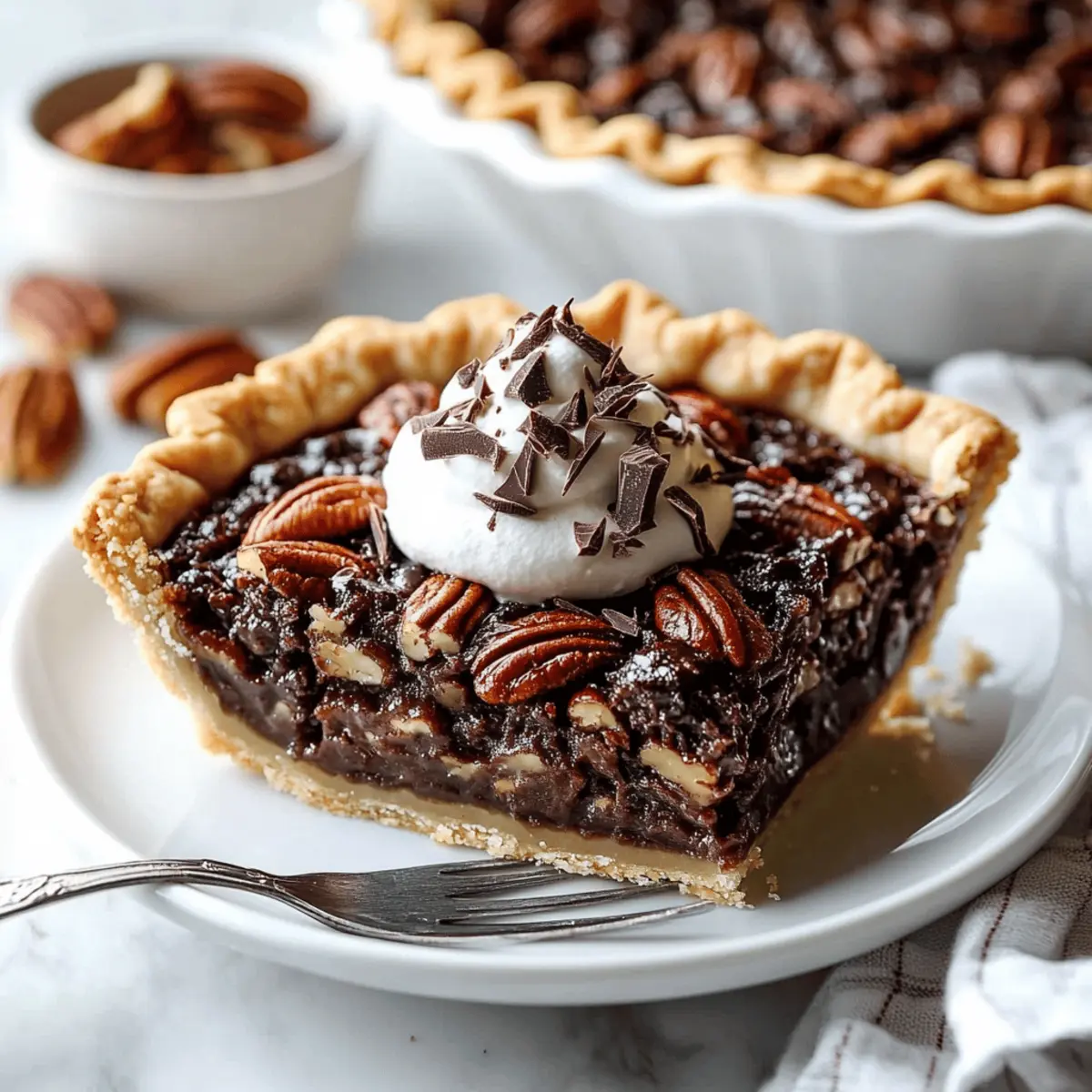 As I pulled the luscious Dark Chocolate Pecan Pie from the oven, the warm aroma of melted chocolate and toasted nuts enveloped my kitchen like a cozy hug. This delightful dessert puts a modern twist on a timeless classic, combining buttery pecans with a rich, velvety chocolate filling that will make your taste buds dance. Not only is this pie a showstopper for holiday gatherings and cozy family dinners, but it’s also a breeze to whip up—perfect for both seasoned bakers and those navigating their culinary journey. Enhanced with a sprinkle of flaky sea salt, this pie achieves the ideal balance of sweetness and crunch that keeps everyone reaching for seconds. Are you ready to indulge in a slice of heaven? Let’s dive into the details! Why is this pie a must-try? Decadent flavors: The combination of rich dark chocolate and buttery pecans creates a symphony of taste that will tantalize your palate. Easy to make: Even if you’re a beginner, this recipe is straightforward, ensuring a delicious outcome every time. Versatile option: You can easily swap ingredients to fit dietary preferences, like using a gluten-free crust for a wider appeal. Impressive dessert: Perfect for gatherings, this pie will wow your family and friends, leaving them begging for the recipe. Time-saving treat: With make-ahead options, you can prepare it in advance, allowing you more time to enjoy your guests. Dark Chocolate Pecan Pie Ingredients For the Filling Pecan Nuts – These add delightful crunch and nutty flavor; substitute with walnuts if desired. Dark Chocolate Chips (60-70% cacao) – They provide a rich, slightly bitter contrast; using chocolate with higher cacao content deepens flavor in the Dark Chocolate Pecan Pie. Brown Sugar & Corn Syrup – This blend sweetens and binds the filling; maple syrup can replace corn syrup for a distinct flavor twist. Eggs – Serving as a binding agent, they create a custard-like filling; ensure they are at room temperature for even mixing. Melted Butter – This adds richness and flavor; consider using coconut oil for a dairy-free alternative. Vanilla Extract – This enhances the overall flavor; pure vanilla yields the best results. Cinnamon – Adds warmth and spice to the filling; nutmeg can be used as a complementary flavor. Flaky Sea Salt – This balances the sweetness and enhances the chocolate flavor; opt for Maldon or fleur de sel for the best finish. For the Pie Crust All-purpose Flour – This forms the base of your crust; gluten-free flour can be used for a gluten-free option. Salt – A pinch enhances the crust’s flavor. Cold Butter – Keeps your crust flaky and tender; ensure it’s cold and cut into small cubes before incorporating. Ice Water – This helps form the dough without melting the butter; only use as needed to bind the ingredients. Feel free to gather fresh ingredients for this scrumptious Dark Chocolate Pecan Pie that your family will love! Step‑by‑Step Instructions for Dark Chocolate Pecan Pie Step 1: Prepare the Pie Crust Begin by making your favorite homemade pie crust, yielding enough for two crusts. Roll your dough to about 12 inches in diameter, ensuring an even thickness. Gently fit it into a 9-inch pie dish without prebaking, and let it rest while you prepare the filling for your Dark Chocolate Pecan Pie. Step 2: Layer Ingredients Spread the pecan nuts evenly across the bottom of the prepared crust, making sure to cover the surface well. Next, sprinkle the rich dark chocolate chips over the pecans, creating a delightful base for your filling. This layering will ensure every bite of your pie is bursting with flavor and texture. Step 3: Mix Filling In a mixing bowl, whisk together the eggs, corn syrup, brown sugar, melted butter, vanilla extract, salt, and cinnamon until smooth and well combined. This filling should be homogenous with a slight froth on top. Once mixed, pour the filling gently over the layered pecans and chocolate, ensuring everything is evenly coated for your Dark Chocolate Pecan Pie. Step 4: Bake the Pie Preheat your oven to 350°F (177°C) and carefully place the pie on the lower third rack to promote even cooking. Bake for 40 to 50 minutes, checking after 20 minutes to protect the crust’s edges, if necessary. You’ll know the pie is done when the center jiggles slightly, and the top has turned a lovely golden brown. Step 5: Cool and Serve Once baked, remove the pie from the oven and allow it to cool on a wire rack for at least an hour. This cooling period is essential for the filling to set properly. Before serving, sprinkle a touch of flaky sea salt on top for a delightful contrast to the sweetness, and consider pairing it with a dollop of whipped cream for an indulgent treat. Expert Tips for Dark Chocolate Pecan Pie Choose Quality Chocolate: Use high-quality dark chocolate (60-70% cacao) for the best flavor; cheap chocolate can lead to a less impressive Dark Chocolate Pecan Pie experience. Egg Temperature Matters: Ensure your eggs are at room temperature before mixing; this helps create a smooth filling and aids in even baking. Protect the Crust: Use a pie crust shield or aluminum foil around the edges while baking to prevent over-browning, which can ruin the overall look and taste. Cool Completely: Allow the pie to cool for at least an hour before slicing; this helps the filling set and prevents a runny Dark Chocolate Pecan Pie. Flavor Variations: Experiment by adding a splash of bourbon or vanilla extract to the filling for a delightful depth of flavor that enhances the nutty chocolate experience. How to Store and Freeze Dark Chocolate Pecan Pie Room Temperature: Keep the pie at room temperature for up to 1-2 days, covered lightly with plastic wrap or a clean kitchen towel to maintain its delightful flavors. Fridge: Store the pie in the refrigerator for up to 4-5 days; cover it tightly with plastic wrap or foil to keep it fresh and protect the texture of the Dark Chocolate Pecan Pie. Freezer: For longer st
