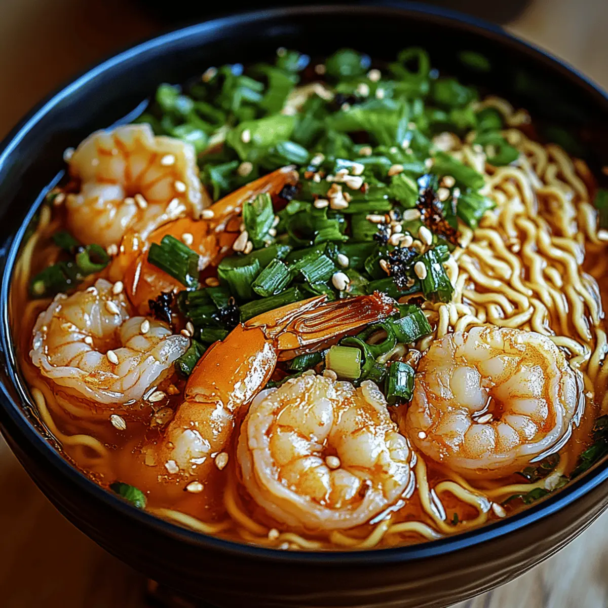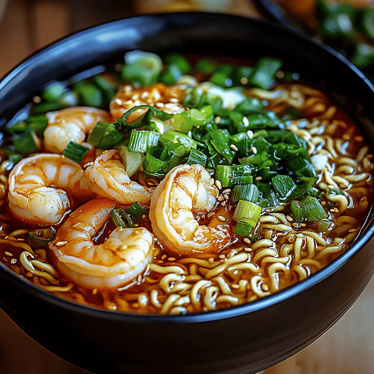 As I stirred the bubbling broth, a rush of fragrant garlic and zesty ginger enveloped my kitchen, instantly transporting me to my favorite ramen shop. This Spicy Shrimp Ramen is my go-to recipe when I need a quick meal that doesn’t compromise on flavor. In just 20 minutes, you can whip up a comforting bowl that’s filled with tender shrimp and noodles, all swimming in a rich, spicy broth. It’s customizable too; you can dial up the heat with chili paste or swap shrimp for tofu for a vegetarian twist. Perfect for any weeknight dinner, this dish offers both warmth and satisfaction without the guilt of fast food. Curious to see how simple and scrumptious this can be? Let’s dive in! Why is Spicy Shrimp Ramen a must-try? Quick preparation: This dish comes together in just 20 minutes, making it ideal for those busy weeknights when you crave delicious food without the fuss. Customizable heat: Adjust the spice level to suit your taste—whether you prefer a milder broth or crave a fiery kick, this recipe has got you covered. Versatile proteins: Swap out shrimp for tofu or mushrooms for a delightful vegetarian alternative that doesn’t skimp on flavor. Rich, savory broth: Every slurp transports you to a ramen house, with a broth that’s rich in umami thanks to ingredients like garlic and sesame oil. Crowd pleaser: This recipe impresses guests at dinner parties as a gourmet option that’s easy to make. Enjoy with a refreshing cucumber salad or steamed edamame on the side for a complete meal! Spicy Shrimp Ramen Ingredients For the Broth • Sesame Oil – Adds a nutty flavor and enhances the broth’s richness; vegetable oil can be used instead. • Garlic – Provides an aromatic base and depth of flavor; fresh is best, though powdered garlic can substitute in a pinch. • Ginger – Offers a warm, zesty note to the broth; fresh ginger enhances aroma, while ground ginger can be used as an alternative. • Chili Paste – Delivers heat and flavor; adjust the amount based on your desired spice level. • Broth (Chicken or Vegetable) – Forms the soup base; opt for low-sodium for a healthier option. • Soy Sauce – Adds umami and saltiness; tamari can replace it for a gluten-free alternative. For the Main Components • Shrimp – The main protein; using peeled and deveined shrimp saves time, but tofu or mushrooms work well for a vegetarian version. • Ramen Noodles – The core ingredient for texture; can substitute Udon or quick-cooking noodles. For Garnishing • Green Onions – Adds freshness and color as a garnish; chives or shallots can be used if preferred. • Lime Juice – Brightens flavors; optional, but it enhances the overall taste profile. This Spicy Shrimp Ramen will surely warm your soul and satisfy your cravings in no time! Step‑by‑Step Instructions for Spicy Shrimp Ramen Step 1: Heat the Base In a medium pot, heat 1 tablespoon of sesame oil over medium heat. Once the oil shimmers, add 2 minced garlic cloves and 1 tablespoon of freshly grated ginger. Sauté for about 30 seconds until fragrant, stirring frequently to prevent burning. The aroma will fill your kitchen, setting the stage for your Spicy Shrimp Ramen. Step 2: Add the Heat Stir in 1 tablespoon of chili paste, allowing it to bloom in the hot oil for about 1 minute. This step enhances the flavors, bringing out the heat and vivid color in your broth. As the mixture sizzles, keep an eye on it to avoid scorching, stirring continuously to meld the chili paste with the garlic and ginger. Step 3: Craft the Broth Pour in 4 cups of broth—either chicken or vegetable—along with 2 tablespoons of soy sauce. Increase the heat slightly and bring the mixture to a gentle simmer over medium heat, letting it cook for 2-3 minutes. This will help the flavors to combine, creating a rich foundation for your Spicy Shrimp Ramen. Step 4: Cook the Shrimp Add 1 pound of peeled and deveined shrimp to the simmering broth. Cook for about 2-3 minutes, stirring occasionally, until the shrimp turn pink and opaque. This is a crucial moment; avoid overcooking, as they should be tender and juicy. The vibrant color will make your ramen look irresistible. Step 5: Prepare the Noodles While the shrimp is cooking, prepare the ramen noodles separately according to the package instructions. Usually, this takes around 3-4 minutes. Drain the noodles once they’re cooked, ensuring they remain firm and chewy, as mushy noodles can ruin your Spicy Shrimp Ramen experience. Step 6: Assemble the Bowls In serving bowls, place a generous portion of the cooked ramen noodles. Ladle the hot, spicy broth along with the shrimp over the noodles, making sure to cover them generously. The colorful, aromatic broth will create a beautiful, comforting contrast against the noodles. Step 7: Garnish with Freshness Finally, sprinkle sliced green onions over the top for a burst of freshness, adding both flavor and color to your Spicy Shrimp Ramen. If desired, a squeeze of lime juice can brighten the dish further, enhancing the savory elements. Optional drizzles of sesame oil can also add an extra layer of richness. What to Serve with Spicy Shrimp Ramen? Elevate your meal by complementing the vibrant flavors of this bowl of Spicy Shrimp Ramen with delightful side dishes and drinks. Crisp Cucumber Salad: A refreshing side that balances the bold spiciness, providing a crunchy contrast to the warm soup. Steamed Edamame: Light and nutritious, these tender soybeans add a satisfying, toasted flavor that pairs beautifully with the rich broth. Garlic Green Beans: Sautéed with a touch of sesame oil and garlic, these green beans offer an umami-rich side that complements the shrimp. Savory Fish Tacos: The mild flavors of fish tacos can provide a light, fresh option that rounds off the meal without overpowering the ramen. Mango Sticky Rice: For a sweet ending, this dessert offers a luscious, tropical flavor that contrasts delightfully with the spicy broth. Iced Jasmine Tea: This frag
