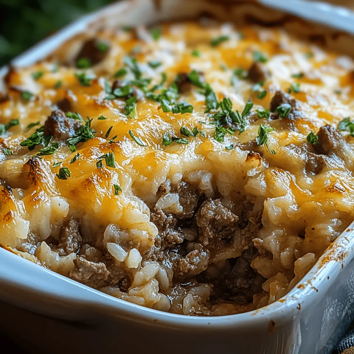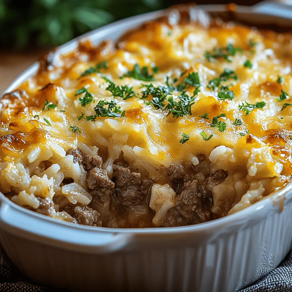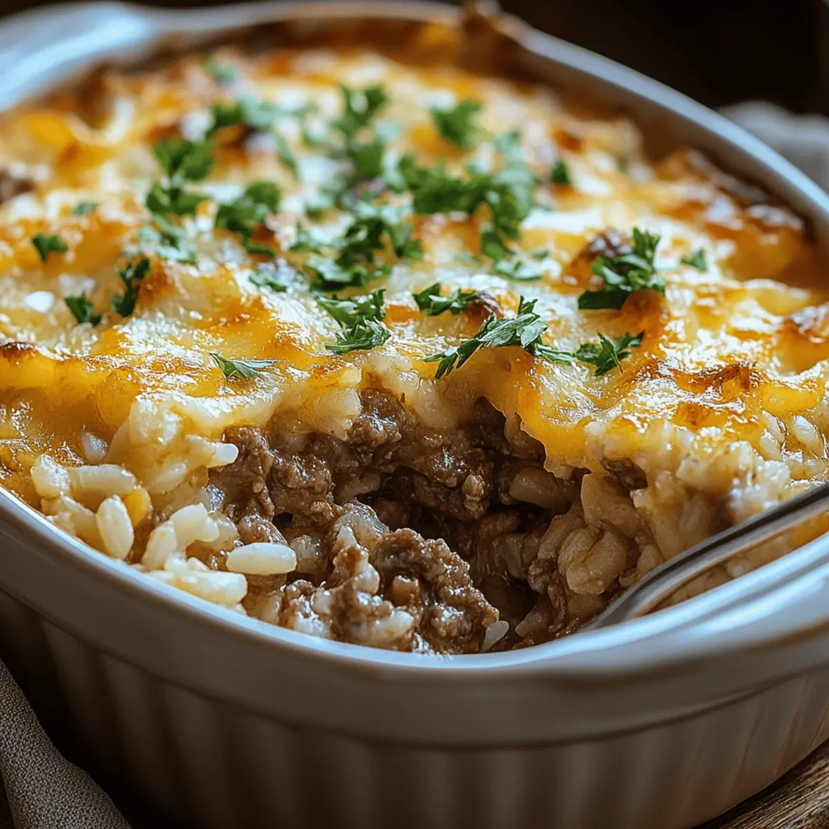 As I stood in the kitchen, the aroma of sizzling onions mingling with garlic filled the air, instantly transporting me back to cozy family dinners. There’s something magical about a Beef and Rice Casserole — it embodies comfort, warmth, and the kind of satisfaction that only a hearty, homemade meal can provide. Perfect for busy weeknights, this recipe not only comes together quickly but also allows for endless customization, catering to your family’s tastes and dietary needs. Whether you prefer a leaner protein or want to sneak in an extra serving of veggies, this dish adapts beautifully while remaining gluten-free and delicious. Curious how this easy one-pan meal can become your family’s new favorite? Let’s dive into the details! Why is Beef and Rice Casserole a Must-Try? Comforting Warmth: This Beef and Rice Casserole brings layers of flavor, making every bite a nostalgic experience. Easy to Customize: Tailor it to suit your family’s preferences by swapping ingredients and spices. Quick Prep Time: With minimal hands-on time, you can have dinner on the table in no time! Budget-Friendly: It’s made with affordable ingredients that won’t break the bank. Plus, for more variations, check out our variation ideas. Leftover Friendly: Enjoy delicious leftovers for days, making meal prep a breeze. Beef and Rice Casserole Ingredients For the Casserole • Ground Beef – Provides richness and protein; substitute with ground turkey for a leaner option. • Uncooked Rice – Acts as the base; opt for brown rice for added fiber. • Canned Tomatoes – Adds moisture and acidity; use diced or crushed for varied texture. • Beef Broth – Enhances the savory depth; choose gluten-free broth for a gluten-sensitive variation. • Onions – Contributes natural sweetness; finely chop for even cooking. • Garlic – Offers aromatic depth; minced garlic provides the best flavor. • Mixed Vegetables – Introduces nutrients and vibrant color; use fresh or frozen based on availability. • Shredded Cheese – Melts beautifully on top for a creamy finish; mozzarella or cheddar are favorites. • Spices (e.g., paprika, oregano) – Elevates flavor and can be customized based on personal taste preferences. For the Toppings • Fresh Garnishes – Whether parsley or green onions, they add brightness just before serving for a lovely presentation. This comforting Beef and Rice Casserole is versatile, making it easy to adapt to your family’s tastes and dietary needs! Step‑by‑Step Instructions for Easy Beef and Rice Casserole Step 1: Prepare the Beef Mixture In a large skillet, heat a drizzle of oil over medium heat. Add 1 pound of ground beef, cooking until browned, about 7-10 minutes. Mix in finely chopped onions and minced garlic, sautéing until the onions are translucent and fragrant, which takes an additional 3-4 minutes. Drain any excess fat to keep your Beef and Rice Casserole from becoming greasy. Step 2: Combine Ingredients Reduce the heat to low and stir in 1 cup of uncooked rice, 1 can of canned tomatoes, and 2 cups of beef broth. Add in your choice of mixed vegetables, whether fresh or frozen, along with your favorite spices like paprika and oregano. Mix thoroughly and allow these ingredients to meld for about 3-5 minutes until heated through and well-combined. Step 3: Transfer to Dish Preheat your oven to 375°F (190°C) while you pour the mixture into a greased 9×13-inch casserole dish. Spread it evenly across the bottom of the dish, ensuring the rice is submerged in the broth and liquid. Cover the dish tightly with aluminum foil to trap moisture, which helps the rice cook properly in the oven. Step 4: Bake Place the covered casserole in the preheated oven and bake for 35-40 minutes. Keep an eye on it; the casserole is done when the rice is tender and has absorbed most of the liquid. The aroma filling your kitchen will signal that your Beef and Rice Casserole is well on its way to perfection. Step 5: Add Cheese After baking, carefully remove the foil and sprinkle 1-2 cups of shredded cheese evenly over the top of the casserole. Return the dish to the oven uncovered and bake for an additional 5-10 minutes until the cheese is melted, bubbly, and slightly golden. This step adds that delicious creamy layer which makes the casserole irresistible. Step 6: Garnish and Serve Once your Beef and Rice Casserole has reached that golden bubbly stage, take it out of the oven and let it rest for a few minutes. For a fresh finishing touch, add your choice of chopped parsley or green onions as a garnish. Serve it warm, either in individual portions or family-style, and enjoy the comforting flavors that bring everyone together! Beef and Rice Casserole Variations Embrace your culinary creativity! Let’s explore delightful ways to customize this comforting dish. Dairy-Free: Use a dairy-free cheese alternative or omit cheese entirely for a lighter version. It still retains its delicious flavor! Vegetarian: Swap the ground beef for lentils or black beans and use vegetable broth instead of beef broth. It’s hearty, wholesome, and packed with nutrients! Spicy Twist: Add diced jalapeños or a sprinkle of cayenne pepper to the beef mixture for a kick of heat. This creates a delightful contrast to the creamy texture. Add More Veggies: Toss in chopped spinach or kale alongside mixed vegetables to boost nutrition and color. This not only enhances the dish visually but also adds vibrant flavors. Quinoa Alternative: Replace rice with quinoa for a protein boost and nuttier flavor. Adjust the cooking time as quinoa cooks faster than traditional rice! Flavor Infusion: Experiment with smoked paprika or chipotle powder to deepen the flavor of the casserole. The smokiness brings a whole new dimension to this family favorite. Nutty Crunch: Top with a sprinkle of toasted breadcrumbs or crushed nuts before serving for a delightful crunch that adds texture. This simple addition elevates each bite! Family Style: Bake