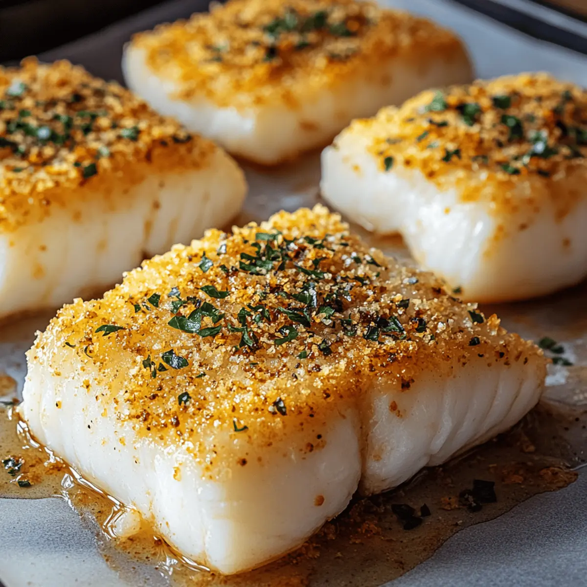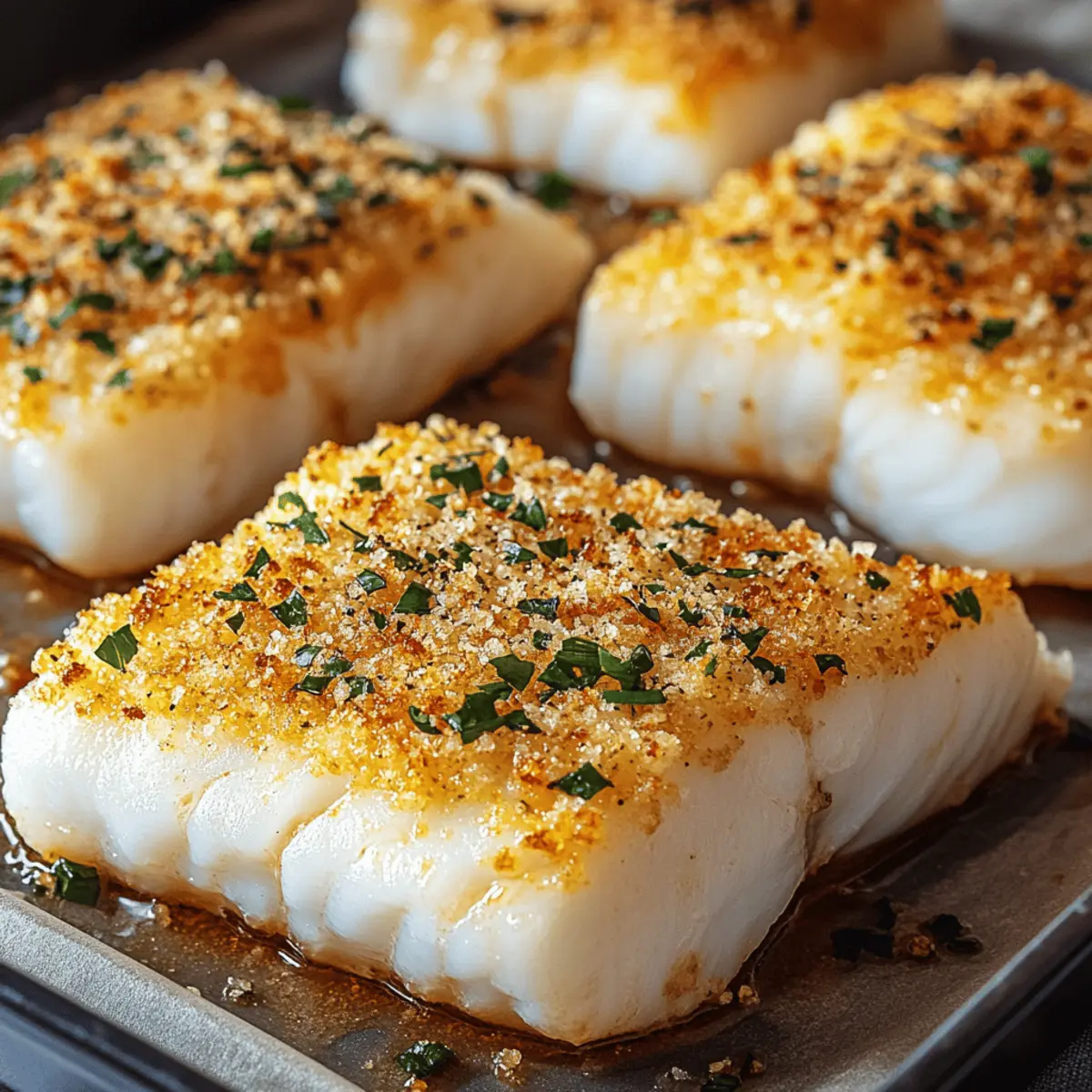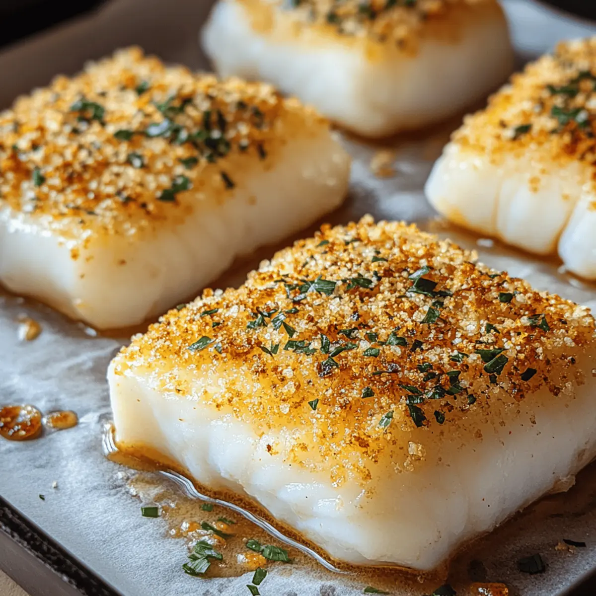 As the evening sun begins to set, I find myself yearning for a dinner that feels both special and effortless. Enter the Easy Parmesan Crusted Cod, my go-to for those nights when I want to impress without spending hours in the kitchen. With a crispy, cheesy crust enveloping tender, flaky cod, this dish strikes the perfect balance between comfort and elegance. Plus, it’s gluten-free when you choose the right breadcrumbs, making it a fabulous choice for everyone gathered around the table. The best part? You can whip it up in no time, making it an ideal option for those busy weeknights or an intimate dinner party. Curious how to create this culinary delight that’s bound to be a family favorite? Let’s dive in! Why is Parmesan Crusted Cod a Must-Try? Deliciously Simple: This recipe requires minimal prep and just a few ingredients, making it a breeze even for busy cooks. Crispy, Cheesy Goodness: The Parmesan and panko coating creates a satisfyingly crunchy exterior that pairs beautifully with the flaky cod. Versatile Options: Feel free to swap out cod for other white fish like haddock or halibut, tailoring it to your taste and what’s fresh. Gluten-Free Friendly: Opt for gluten-free panko to ensure everyone can enjoy this delightful dish without compromise. Quick Cooking: In under 30 minutes, you can serve up restaurant-quality cod, perfect for impressing guests or a cozy family dinner. Crowd-Pleaser: With its irresistible flavor and appealing texture, it’s sure to become a favorite at your table! Easy Parmesan Crusted Cod Ingredients • • Ready to make your next meal? Here’s everything you need to create a delicious Parmesan Crusted Cod! For the Coating Parmesan Cheese – Adds a rich, savory flavor and creates that coveted crispy crust. Panko Breadcrumbs – Provides an extra crunch; opt for gluten-free panko if you want to keep it gluten-free! Garlic Powder – Enhances the flavor; feel free to substitute with fresh minced garlic for a bolder taste. Lemon Zest – Brightens up the dish, complementing the flavor of the fish beautifully. Salt – Essential for enhancing the overall taste of the dish. Pepper – Imparts a mild spice, balancing the flavors perfectly. For the Fish Cod Fillets – The star of the dish, offering a tender, flaky texture when baked; try haddock or tilapia as well if you prefer. Olive Oil or Melted Butter – Helps the coating stick to the fish while adding moisture; both options work well to keep it delicious! Step‑by‑Step Instructions for Easy Parmesan Crusted Cod Step 1: Prepare the Coating In a shallow bowl, combine freshly grated Parmesan cheese, panko breadcrumbs, garlic powder, lemon zest, salt, and pepper. Mix thoroughly until uniform. This mixture will form the crispy, cheesy crust for your Parmesan Crusted Cod. Set the bowl aside and prepare your cod for a delicious coating. Step 2: Prep the Cod Start by patting the cod fillets dry using paper towels to ensure that the coating adheres well. Then, brush each side of the fillets with olive oil or melted butter, ensuring they are fully coated. This step not only adds flavor but also helps the crunchy mixture stick beautifully to the cod. Step 3: Coat the Cod Next, take the oiled cod fillets and carefully dredge them in the Parmesan breadcrumb mixture, pressing down lightly to ensure an even coating on both sides. The goal is to achieve a generous and even crust that will become delightfully crispy when baked. Step 4: Bake Preheat your oven to 425°F (220°C) while you prepare your baking sheet. Line it with parchment paper to prevent sticking. Once the oven is hot, place the coated cod fillets on the sheet and bake for 12-15 minutes, until the crust is golden brown and the fish flakes easily with a fork. Step 5: Rest and Serve After baking, let the Parmesan Crusted Cod rest for a few minutes to lock in the moisture. Garnish with fresh herbs for a pop of color and flavor. Serve it alongside roasted vegetables or a refreshing salad for a complete meal that’s bound to impress everyone at the table. Expert Tips for Parmesan Crusted Cod Crispiness Keeper: To maintain the crunchy texture, avoid reheating in the microwave; instead, warm it up in a 350°F oven. Testing Doneness: The cod is perfectly cooked when it flakes easily with a fork and appears opaque throughout. Advanced Prep: Consider preparing the breadcrumb mixture a day in advance to save time on busy evenings. Drying Matters: Ensure the cod fillets are thoroughly patted dry to improve the adherence of the Parmesan crust. Experimenting Flavors: Feel free to spice up the topping by adding herbs or spices like paprika or Italian seasoning for extra flavor. What to Serve with Easy Parmesan Crusted Cod Elevate your dinner experience with delightful pairings that complement the crispy fish and enhance your meal. Lemon-Infused Couscous: The citrus notes harmonize with the cod’s flavor, offering a light, fluffy texture that balances the dish beautifully. It’s an easy side to prepare as the cod bakes! Garlic Roasted Asparagus: Tender asparagus roasted with garlic provides a vibrant contrast in both taste and color, bringing freshness to your plate. Arugula Salad with Cherry Tomatoes: This peppery salad adds a refreshing crunch, light acidity, and vibrant color to your meal, enhancing the overall experience. Creamy Mashed Potatoes: The rich, creamy texture of mashed potatoes creates a comforting contrast to the crunchy cod, making for a classic pairing everyone loves. Zucchini Noodles: For a lighter, gluten-free side, sautéed zucchini noodles bring freshness and a lovely pop of color, complementing the savory fish perfectly. Chardonnay: A chilled glass of Chardonnay beautifully complements the flavors of the cod, with its crispness and subtle oakiness enhancing every bite. Key Lime Pie: Conclude your meal with a slice of tangy key lime pie, providing a refreshing and sweet finish that pairs wonderfully with the savory cod. Make Ahead Options