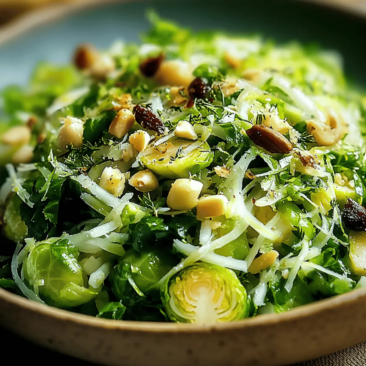 As I was rummaging through my fridge, I stumbled upon a heap of Brussels sprouts, and suddenly, a lightbulb went off! This Easy Shaved Brussels Sprout Salad with Lemon-Dijon Dressing turned out to be the key to transforming those neglected greens into a vibrant, crunchy delight. With no cooking required, this salad offers a speedy solution to your lunch dilemmas or makes a stunning side for any gathering. Tossed in a zesty dressing and bolstered by the satisfying crunch of toasted nuts, it’s not just delicious—it’s also a nourishing option that will make you forget about fast food. Feeling curious about how to elevate your veggie game? Let’s dive into this delightful recipe! Why is This Salad a Must-Try? Vibrant, this Shaved Brussels Sprout Salad brings life to your plate with its refreshing crunch and zesty flavors. No-Cook Awesomeness: With zero cooking involved, it’s perfect for busy days or when you want something light yet satisfying. Nutrient-Dense: Packed with vitamins and minerals, this salad nourishes while tantalizing your taste buds. Versatile Delight: Dress it up for a dinner party or serve it as a quick lunch; it’s truly adaptable! Plus, you can easily customize it with your favorite toppings or proteins, making it a go-to side for anything from grilled chicken to quinoa. Shaved Brussels Sprout Salad Ingredients • Discover how to make this refreshing salad! For the Salad Brussels Sprouts – The star ingredient providing a satisfying crunch and nutritional benefits; ensure they’re trimmed and shaved thin for the best texture. Toasted Nuts (Almonds or Walnuts) – A crunchy addition that boosts flavor and sustenance; feel free to skip for a nut-free variant. Parmesan Cheese – Adds a rich, creamy element; substitute with Pecorino Romano or omit for a vegan delight. Fresh Herbs (Parsley or Chives) – A final touch for brightness and color; use as desired for extra freshness. For the Dressing Extra Virgin Olive Oil – High-quality oil enhances all flavors; remember to use it generously for a luscious finish. Fresh Lemon Juice – Infuses the dressing with zesty brightness; can be swapped with vinegar in a pinch for a different tang. Dijon Mustard – Gives the dressing a nice kick while helping to bind ingredients; yellow mustard can be used instead for milder flavor. Salt & Pepper – Essential seasonings that elevate the flavors; adjust to your liking for the perfect taste. Step‑by‑Step Instructions for Shaved Brussels Sprout Salad Step 1: Prepare the Brussels Sprouts Start by thoroughly washing the Brussels sprouts under cool water. Trim the ends and remove any yellow or damaged outer leaves. Using a sharp knife or a mandoline, shave the Brussels sprouts into thin ribbons, aiming for a uniform thickness. This ensures even texture throughout your Shaved Brussels Sprout Salad. Place the shaved sprouts in a large bowl, ready for mixing. Step 2: Make the Dressing In a medium bowl, whisk together 1/4 cup of extra virgin olive oil, the juice of one fresh lemon, and 1 tablespoon of Dijon mustard. Add a generous pinch of salt and freshly ground black pepper to taste. Continue whisking until the dressing is smooth and well-emulsified, with a creamy consistency. This vibrant dressing will bring your Shaved Brussels Sprout Salad to life, creating a perfect tangy base. Step 3: Combine Ingredients Pour the dressing over the bowl of shaved Brussels sprouts, making sure to coat every piece. Gently toss the sprouts with tongs or a large spoon for about one minute, ensuring they are evenly dressed and glistening. This step not only flavors the Brussels sprouts but also helps to soften their crunch slightly, enhancing the overall texture of your salad. Step 4: Add the Crunch Once the sprouts are well-coated, fold in 1/2 cup of toasted nuts, such as almonds or walnuts, along with 1/4 cup of grated Parmesan cheese. Gently mix everything together to combine the ingredients without crushing the sprouts. The toasted nuts bring a satisfying crunch to your Shaved Brussels Sprout Salad, while the cheese adds a rich creaminess that complements the tangy dressing beautifully. Step 5: Adjust to Taste Take a moment to taste your Shaved Brussels Sprout Salad and see if it needs any additional salt or pepper. If desired, let the salad sit for about 10 minutes to allow the flavors to meld and the sprouts to absorb the dressing. This short waiting period enhances the overall flavor profile while still retaining that delightful crunch. Step 6: Garnish and Serve Before serving, sprinkle the salad with freshly chopped herbs like parsley or chives for an extra burst of flavor and color. If desired, add more grated Parmesan or a sprinkle of seeds for visual appeal. Your Shaved Brussels Sprout Salad is now ready to be served fresh as a light lunch or as a stunning side dish at your next gathering. Expert Tips for Shaved Brussels Sprout Salad Quality Ingredients: Use fresh, high-quality Brussels sprouts and olive oil to enhance the overall flavor of your salad. Proper Shaving: Ensure uniform thickness when shaving the sprouts, as this guarantees an even texture—too thick can result in a tough bite. Dressing Timing: Keep the dressing separate until just before serving to maintain the salad’s crispness; it preserves that delightful crunch in your Shaved Brussels Sprout Salad. Adjust Seasoning: Always taste and adjust salt and pepper to your liking; these basic seasonings can transform the salad from ordinary to extraordinary. Herb Freshness: Don’t skip the fresh herbs for garnish—they add a burst of flavor and vibrant color, elevating both presentation and taste. Mind the Nuts: If you’re using nuts, toast them lightly for extra flavor and crunch, but be cautious not to overdo it to prevent burning. Storage Tips for Shaved Brussels Sprout Salad Fridge: Store any leftover salad in an airtight container for up to 2 days. For best results, keep the dressing separate until serving to maint