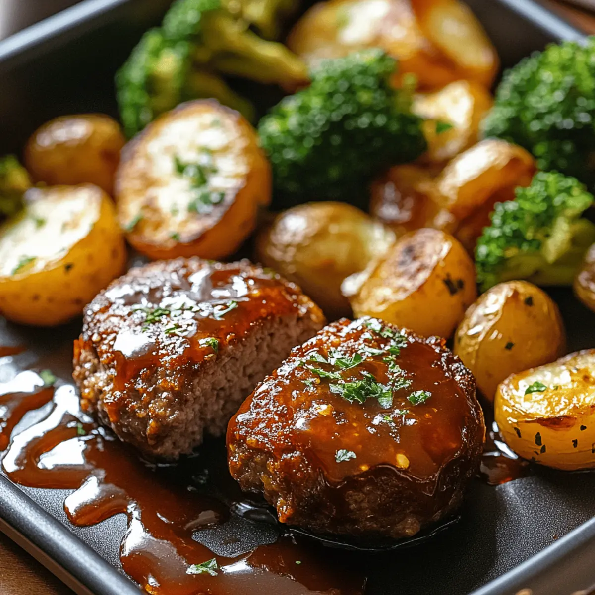 As I shuffled through my kitchen, the aroma of sizzling garlic and fresh herbs wafted through the air, igniting memories of family dinners. This Easy Sheet Pan Mini Meatloaf with Roasted Vegetables has quickly become a staple in my home—not only for its heartwarming flavors but also for its effortless preparation. The beauty of this dish lies in its versatility; whether you’re catering to picky eaters or utilizing what you have on hand, it adapts beautifully to your culinary whims. Plus, the one-pan cleanup makes busy weeknights a bit more manageable, while the juicy mini meatloaves paired with vibrant veggies create a colorful plate that’s both nutritious and satisfying. Ready to transform your dinner routine? Let’s dive into this delightful recipe! Why is this recipe a game changer? One-Pan Wonder: The Sheet Pan Mini Meatloaf with Roasted Vegetables is not just easy to make, but it also means you won’t leave a trail of dirty dishes behind – perfect for busy nights! Flavorful Blend: The combination of juicy meatloaf and vibrant veggies creates a delightful balance of tastes in every bite. Endless Variations: With its versatile ingredients, you can easily adapt this recipe to fit different dietary needs or whatever is in your pantry. Quick Prep Time: Get this comforting meal on the table in under an hour, making it ideal for hectic weeknights. Meal Prep Friendly: Make it ahead of time! Double the batch and freeze for a quick and hearty dinner when you need it most. Enjoy this recipe that not only satisfies but also brings joy back into home cooking! Sheet Pan Mini Meatloaf Ingredients For the Meatloaf • Ground Beef – Provides protein and structure; substitute with ground turkey for a leaner option. • Bread Crumbs – Adds texture and helps bind the meatloaf; for gluten-free, use gluten-free bread crumbs. • Milk – Moistens the mixture; can substitute with non-dairy milk for lactose sensitivities. • Egg – Binds the ingredients together; replace with a flax egg (1 tbsp flaxseed meal + 3 tbsp water) for a vegan option. • Onion – Adds flavor; use shallots or leeks for a milder taste. • Garlic – Enhances flavor; substitute with garlic powder if fresh garlic is unavailable. • Worcestershire Sauce – Provides umami depth; use soy sauce or tamari for a gluten-free option. • Ketchup – Glazes the meatloaf for sweetness; try barbecue sauce or a homemade glaze for variety. For the Vegetables • Carrots – Contributes color and nutrition; swap in seasonal veggies like Brussels sprouts or sweet potatoes. • Bell Peppers – Adds crunch and sweetness; any color works for a vibrant dish. • Zucchini – Offers moisture and texture; can also use summer squash as a substitute. • Olive Oil – Used for roasting vegetables; can replace with cooking spray for a lower-calorie option. • Salt and Pepper – Enhances flavor; adjust seasoning based on personal preference. • Dried Herbs – Adds flavor complexity; fresh herbs like thyme or basil make for a vibrant twist. Step‑by‑Step Instructions for Sheet Pan Mini Meatloaf with Roasted Vegetables Step 1: Prepare Meatloaf Mixture In a large mixing bowl, combine ground beef, bread crumbs, milk, egg, finely chopped onion, minced garlic, Worcestershire sauce, ketchup, salt, pepper, and your choice of dried herbs. Mix everything gently until just combined to keep the meatloaf tender. Shape the mixture into small, even loaves, placing them on a greased sheet pan to prepare for baking. Step 2: Prepare Vegetables Next, wash and chop carrots, bell peppers, and zucchini into bite-sized pieces. In a large bowl, toss the chopped vegetables with olive oil, salt, pepper, and additional herbs to coat them evenly. Their vibrant colors will add not only nutrition but also a delicious contrast to the mini meatloaves in the Sheet Pan Mini Meatloaf with Roasted Vegetables. Step 3: Assemble the Sheet Pan Carefully position the formed mini meatloaves on the greased sheet pan, ensuring some space between them for even cooking. Arrange the seasoned vegetables around the meatloaves, filling the spaces. For an added touch of flavor and sweetness, brush the tops of the mini meatloaves with a bit more ketchup before baking. Step 4: Bake to Perfection Preheat your oven to 400°F (200°C). Once heated, place the sheet pan in the center of the oven and bake for 25-30 minutes. You’ll know they’re done when the mini meatloaves reach an internal temperature of 160°F (71°C) and the vegetables are tender and lightly caramelized, which adds delightful depth to the overall dish. Step 5: Rest and Serve After baking, remove the sheet pan from the oven and let the mini meatloaves rest for about 5 minutes. This resting period allows the juices to redistribute, ensuring each bite remains juicy and flavorful. Serve warm alongside the roasted vegetables, garnished with a sprinkle of chopped parsley or fresh basil for an extra pop of color and freshness. Helpful Tricks for Sheet Pan Mini Meatloaf Avoid Overmixing: Keep the meat mixture tender by mixing just until combined. Overmixing can lead to a dense meatloaf that lacks juiciness. Use a Meat Thermometer: To ensure perfectly cooked mini meatloaves, check the internal temperature with a meat thermometer. Aim for 160°F (71°C) to avoid dryness. Customize Veggie Choices: Feel free to swap in any seasonal vegetables you love or have on hand. The more colorful the medley, the more appealing your Sheet Pan Mini Meatloaf with Roasted Vegetables will be! Caramelized Glaze: For a beautiful finish, brush the tops of the mini meatloaves with ketchup during the last few minutes of baking to achieve a lightly caramelized glaze. Storage Solutions: Leftovers can be stored in an airtight container in the fridge for 3-4 days or frozen for up to 3 months. Reheat gently in the oven for best results. What to Serve with Easy Sheet Pan Mini Meatloaf with Roasted Vegetables Creating the perfect dinner is all about bala