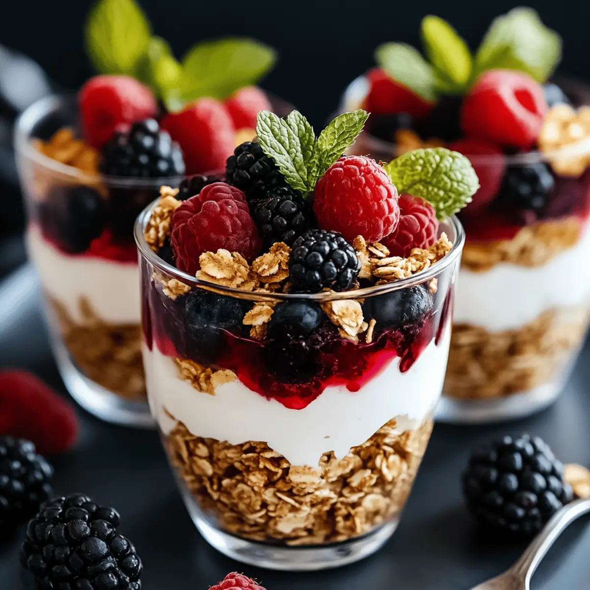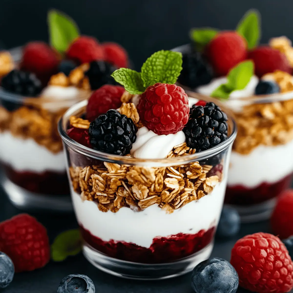 As I stood in my kitchen, the sun streaming through the window, the vibrant colors of fresh berries caught my eye, inspiring a delicious idea for breakfast. Enter Greek Yogurt Berry Parfaits: a delightful and healthy treat that’s as pleasing to the eye as it is to the palate. With their creamy yogurt base and the juicy pop of berries, these parfaits not only make for a quick and energizing breakfast but are versatile enough for a refreshing snack or a light dessert. Plus, they’re easily customizable to fit your dietary preferences, whether you opt for gluten-free granola or a hint of maple syrup. Are you ready to layer up some deliciousness? Let’s dive in! Why are Greek Yogurt Berry Parfaits a must-try? Nutrient-Packed Delight: These parfaits are a fantastic source of protein, perfect for a healthy start to your day. Visual Appeal: Layered with vibrant berries and creamy yogurt, they make breakfast feel special. Quick Preparation: You can whip these up in just minutes, saving time on busy mornings. Endless Customization: Swap in your favorite fruits or sweeteners for a personal touch! Crowd-Pleasing Treat: Ideal for gatherings, everyone will love this fresh and satisfying dish. For more scrumptious ideas, check out my guide on healthy breakfast options. Greek Yogurt Berry Parfaits Ingredients For the Parfaits Greek Yogurt – Adds creaminess and protein; flavored yogurt can enhance sweetness but check for sugar content. Fresh Berries (strawberries, blueberries, raspberries, blackberries) – Provide natural sweetness and tang; feel free to substitute with any mix of seasonal berries. Granola – Adds crunch and fiber; choose gluten-free granola for a gluten-free version. Honey or Maple Syrup – Optional drizzle for extra sweetness; adjust the amount based on the yogurt’s natural sweetness. For Toppings Mint Leaves – Adds a refreshing aroma and enhances visual appeal. Chia Seeds – Boosts nutritional value and adds a delightful texture. Cinnamon – A sprinkle for warmth and flavor enhancement, making your Greek Yogurt Berry Parfaits even more enticing. Step‑by‑Step Instructions for Greek Yogurt Berry Parfaits Step 1: Prepare the Berries Begin by washing all fresh berries thoroughly under cool running water. For larger berries like strawberries, slice them into smaller pieces for easier layering. Pat them dry gently with a paper towel. This step ensures your Greek Yogurt Berry Parfaits are fresh and vibrant, ready to shine in your delicious creation. Step 2: Spoon the Yogurt Grab a tall glass or jar and spoon a generous layer of Greek yogurt into the bottom. Aim for about a third of the glass capacity to allow room for layering. The creamy yogurt forms the perfect base for your parfait, providing both protein and a rich texture that complements the sweetness of the berries. Step 3: Add the Berries Next, layer the prepared fresh berries over the yogurt, creating a colorful and inviting display. Use a mix of strawberries, blueberries, and raspberries for a delightful blend of flavors. The vibrant colors not only enhance the visual appeal of your Greek Yogurt Berry Parfaits but also add natural sweetness and nutrition to each bite. Step 4: Layer the Granola Sprinkle a layer of crunchy granola on top of the berries. This adds texture and fiber to your parfait, along with a satisfying crunch. Choose gluten-free granola if necessary. Make sure to spread it evenly to ensure every spoonful of your Greek Yogurt Berry Parfaits has a delightful blend of flavors and textures. Step 5: Repeat the Layers Continue repeating the layers: spoon in yogurt, add berries, and sprinkle granola until the glass is full, finishing with a generous layer of berries on top. This layering technique not only creates an appealing look but also ensures a perfect balance of creamy, crunchy, and fruity goodness in each mouthful of your delicious Greek Yogurt Berry Parfaits. Step 6: Drizzle with Sweetness If desired, drizzle some honey or maple syrup over the top layer of berries to enhance sweetness. Depending on your yogurt’s flavor profile, adjust the amount to your taste preference. This final touch elevates the flavor of your Greek Yogurt Berry Parfaits and ties all the elements together harmoniously. Step 7: Garnish and Serve For an extra touch of elegance, garnish your parfaits with fresh mint leaves or a sprinkle of chia seeds. Serve immediately to enjoy the perfect combination of textures and flavors. If you’re making them ahead of time, cover them and refrigerate, but keep the granola separate until serving to maintain its crunch. Expert Tips for Greek Yogurt Berry Parfaits Choose Quality Yogurt: Select high-quality Greek yogurt for creaminess and protein; avoid low-fat options that may lack flavor. Avoid Sogginess: To keep your parfaits fresh, layer granola only before serving. This keeps it crunchy and enjoyable. Berry Varieties: Don’t hesitate to mix and match berries! Explore seasonal options like peaches or mango for a delightful twist in your Greek Yogurt Berry Parfaits. Sweetness Control: Adjust the sweetness by tasting as you layer; remember, some flavored yogurts are already sweetened, so use less honey or syrup. Prep Ahead: You can prepare the yogurt and berries a day in advance, but store each component separately to maintain the best textures. Greek Yogurt Berry Parfaits Variations Feel free to explore different ingredient twists and swaps to make this recipe your own! Dairy-Free: Use coconut or almond yogurt in place of Greek yogurt for a creamy vegan option. Nutty Crunch: Add chopped nuts like almonds or walnuts for extra flavor and a delightful crunch. Sweetness Upgrade: Drizzle with homemade fruit compote instead of honey for a fruity explosion! Spiced Delight: Sprinkle a hint of nutmeg or cardamom along with cinnamon for an aromatic twist. Chocolate Fix: Layer in cocoa nibs or dark chocolate shavings for a rich chocolatey experience. Citrus Zing: Include a squeeze of fresh lem