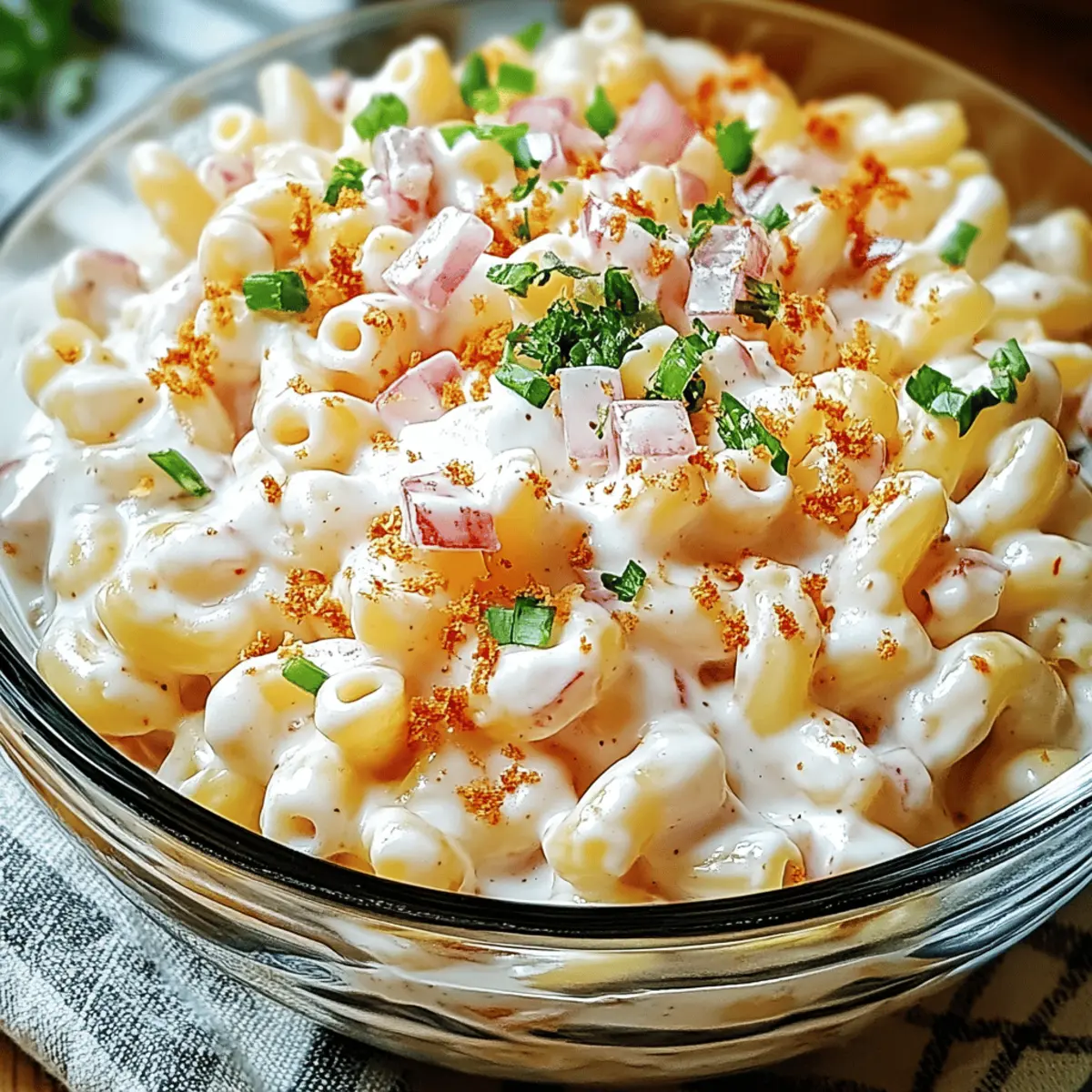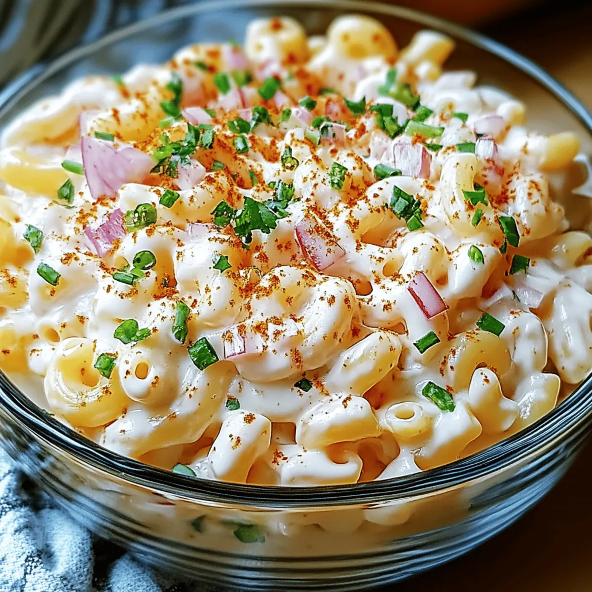 As I stood in my kitchen, the tropical aromas wafting through the air, I knew I was about to create something special. Hawaiian Macaroni Salad is more than just a side dish; it’s a creamy and tangy delight that can transport you straight to beautiful beachside gatherings. This quick and easy recipe combines tender elbow macaroni with a luscious dressing, making it a perfect crowd-pleaser for potlucks and barbecues. Plus, it’s incredibly versatile—customize it to fit your dietary needs or add your favorite veggies for a fun twist! So, are you ready to bring a taste of the tropics to your table? Let’s dive into this tropical treat! Why is Hawaiian Macaroni Salad a Must-Try? Creamy Delight: The luscious dressing clings perfectly to each piece of pasta, creating a rich, indulgent experience. Tropical Flavor: With hints of sweetness from carrots and a tangy kick from the vinegar, this dish captures the spirit of sunny beach days. Customizable Options: You can easily make it gluten-free or vegan by swapping out ingredients, making it accessible for everyone. Quick and Easy: Ready in under 30 minutes, it’s a go-to recipe for those busy weeknights or last-minute gatherings. Crowd-Pleaser: Whether at a family BBQ or potluck, this creamy salad is guaranteed to impress and satisfy a variety of taste buds. Try pairing it with grilled meats like kalua pork or explore serving suggestions for stunning presentation ideas! Hawaiian Macaroni Salad Ingredients For the Pasta • Elbow Macaroni – Essential for that classic creamy texture; feel free to substitute with gluten-free pasta for a gluten-free option. For the Dressing • Mayonnaise – The cornerstone of creaminess; Greek yogurt can lighten up this dish if you’re looking for a healthier twist. • Rice Vinegar – Adds the necessary tang; apple cider vinegar works well as a substitute if needed. For the Veggies • Carrots – Bring sweetness and color to the salad; finely shred them for easier mixing or swap with crunchy diced bell peppers. • Onions – Offer a subtle flavor; green onions are a lovely alternative or you can skip them for a milder taste. For Seasoning • Salt, Pepper, Sugar – Essential for balancing flavors; adjust them according to your personal taste preferences. Get ready to whip up your own tropical delight with these ingredients for Hawaiian Macaroni Salad! Step‑by‑Step Instructions for Hawaiian Macaroni Salad Step 1: Cook the Pasta Start by bringing a large pot of salted water to a rolling boil. Add the elbow macaroni and cook it for about 7-8 minutes or until al dente, stirring occasionally. Once done, drain the pasta in a colander and rinse it with cold water to stop the cooking process. This ensures the macaroni stays firm and separate in your Hawaiian Macaroni Salad. Step 2: Prepare the Veggies While the macaroni cools, grab your cutting board and finely shred the carrots, aiming for a texture that combines sweetness and color. Next, dice the onions as finely as possible; this ensures they blend perfectly without overpowering the salad. Set these aside as you prepare the creamy dressing, which will tie all the elements of the Hawaiian Macaroni Salad together. Step 3: Make the Dressing In a large mixing bowl, combine the mayonnaise, rice vinegar, salt, pepper, and a pinch of sugar. Whisk everything together until smooth and creamy. Taste the dressing and adjust the seasoning as needed—remember, you want that perfect balance of tang and creaminess that makes Hawaiian Macaroni Salad so delightful. Step 4: Combine Ingredients Once the macaroni has cooled completely, add it to the bowl with the dressing. Toss the macaroni gently to coat it completely in the dressing, ensuring every piece is enveloped. Next, add the shredded carrots and diced onions into the mix. Stir everything together until fully combined, allowing the flavors of the Hawaiian Macaroni Salad to start melding. Step 5: Chill Before Serving Cover the bowl with plastic wrap or a lid and refrigerate the salad for at least 1 hour. This chilling time is essential as it lets the flavors merge beautifully, enhancing the overall taste. Ideally, letting it sit longer or even overnight will yield an even more delicious result for your Hawaiian Macaroni Salad! Step 6: Serve and Garnish Before serving, give the salad a gentle stir to redistribute the dressing. For an added touch, consider garnishing with fresh herbs, toasted sesame seeds, or crushed macadamia nuts. These finishing touches not only elevate the flavor but also provide a delightful crunch, making your Hawaiian Macaroni Salad a hit at any gathering. Expert Tips for Hawaiian Macaroni Salad • Cool the Pasta: Ensure the macaroni is completely cooled before mixing to avoid wilting the salad and maintain the perfect texture. • Chill for Flavor: Allow the Hawaiian Macaroni Salad to rest in the fridge for a few hours or overnight; this enhances the flavors and creates a more delicious dish. • Adjust Ingredients: Don’t hesitate to customize with your favorite veggies or proteins. Diced ham or shredded chicken can turn this salad into a satisfying main course! • Balance the Dressing: Taste your dressing as you go; adjusting salt, pepper, and sugar ensures the perfect creamy and tangy balance that makes this salad shine. • Serve Just Right: Best enjoyed cold; let the salad sit at room temperature for 10-15 minutes before serving if it’s too chilled, allowing the flavors to open up. Make Ahead Options Hawaiian Macaroni Salad is a lifesaver for busy home cooks looking to streamline meal prep! You can easily prepare the dressing and cook the macaroni up to 24 hours in advance, storing them separately in the refrigerator to maintain freshness. Simply mix the cooled macaroni with the dressing before serving, adding in the shredded carrots and diced onions for a burst of flavor. For optimal texture, refrigerate the salad after combining all ingredients and let it chill for at least 1 hou