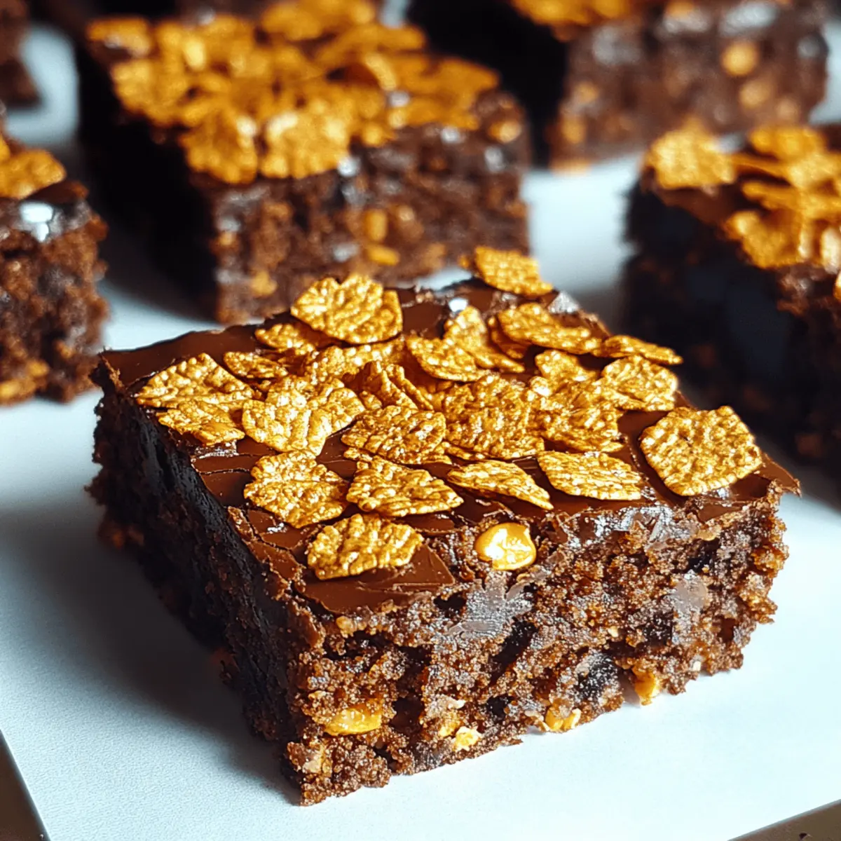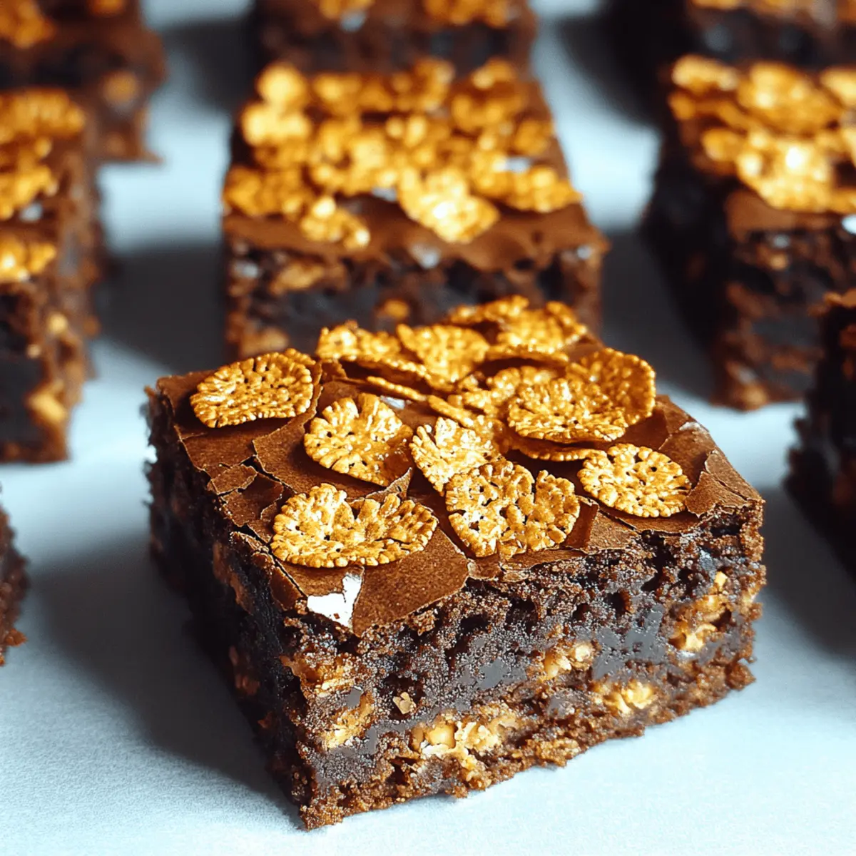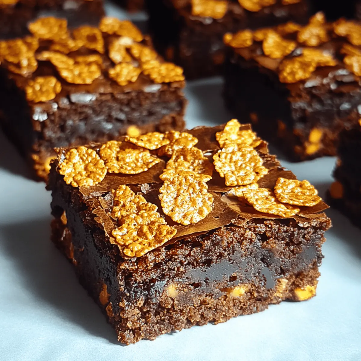 Stirring up a little nostalgia in the kitchen, I recently stumbled upon a recipe that instantly transported me back to my childhood—Honey Roasted Cornflake Brownies. These treats combine the rich, fudgy goodness of traditional brownies with a delightful crunch from golden honey roasted cornflakes. It’s like a crunchy chocolate hug, perfect for those of us who crave that crispy texture alongside our sweet indulgence. What I love most about this easy dessert is that it caters to everyone—whether you’re a casual baker or a seasoned pro. Plus, with options for gluten-free and dairy-free versions, everyone can join the brownie party! Are you ready to elevate your dessert game with this fun twist, or perhaps throw in a variation that sparks your creativity? Let’s dive in! Why Are These Brownies So Unique? Deliciously Crunchy: The honey roasted cornflakes add a satisfying crunch that makes each bite extraordinary, setting these brownies apart from the rest. Effortless Preparation: With only a few easy steps, you can whip up these delectable brownies in no time, even on a busy day. Customizable Options: Whether you prefer gluten-free or dairy-free, this recipe has you covered, allowing everyone to indulge without compromise. Perfect for Sharing: Ideal for any gathering or celebration, these brownies will impress your friends and family with their delightful texture and flavor. Nostalgic Twist: Bringing back sweet memories, these brownies resonate with the warmth of home baking, making them a treat everyone will love. Enjoy them warm with a scoop of vanilla ice cream for an unforgettable experience! Honey Roasted Cornflake Brownies Ingredients • Get ready for a crunchy twist! For the Brownies Unsalted Butter – Adds richness and moisture; substitute with vegan butter or coconut oil for a dairy-free option. Granulated Sugar – Provides sweetness and aids in browning; no direct substitutions recommended. Brown Sugar – Adds moisture and a deeper flavor; can be replaced with coconut sugar for a twist. Eggs – Acts as a binder; vegan alternatives include flax eggs or applesauce. Vanilla Extract – Enhances flavor; almond extract can be a delightful alternative. Cocoa Powder – Gives that rich chocolate flavor; ensure it’s unsweetened for the best results. All-Purpose Flour – Provides structure; substitute with a gluten-free blend for a gluten-free version. Baking Powder – Helps the brownies rise; ensure it’s fresh for maximum effectiveness. Salt – Balances the sweetness; you can omit it for low-sodium diets. For the Crunchy Top Honey Roasted Cornflakes – Adds that irresistible crunch and sweetness; regular cornflakes mixed with honey makes a fine substitute. These Honey Roasted Cornflake Brownies promise to be a delightful addition to your dessert repertoire, catering to various dietary preferences without sacrificing taste! Step‑by‑Step Instructions for Honey Roasted Cornflake Brownies Step 1: Preheat Oven Start by preheating your oven to 350°F (175°C). While it’s warming up, grease an 8×8-inch baking pan or line it with parchment paper for easy removal later. This little preparation step ensures your brownies turn out beautifully and stick-free! Step 2: Melt Butter In a microwave-safe bowl, melt ½ cup of unsalted butter until it’s completely liquid. Stir in equal parts granulated sugar and brown sugar until the mixture becomes glossy and well-combined, taking about 2-3 minutes. This creates a rich, sweet base that’s fundamental for your Honey Roasted Cornflake Brownies. Step 3: Add Eggs and Vanilla Once the butter and sugar mixture has cooled slightly, add in 2 large eggs, beating them in one at a time, thoroughly mixing after each addition. Then, stir in 1 teaspoon of vanilla extract. The mixture should appear smooth and lustrous, adding depth to the flavor of your brownies. Step 4: Sift Dry Ingredients In a separate bowl, sift together ⅓ cup of cocoa powder, ¾ cup of all-purpose flour, ½ teaspoon of baking powder, and a pinch of salt. This step is crucial as it aerates the dry ingredients, ensuring they blend seamlessly into the wet mixture for a fudgy texture in your brownies. Step 5: Combine Mixtures Carefully fold the dry ingredients into the wet mixture, mix until just combined. Be sure to avoid overmixing, as this can toughen your batter. The goal is a thick, luscious batter that incorporates all the flavors for the Honey Roasted Cornflake Brownies without losing its fudgy quality. Step 6: Fold in Cornflakes Gently fold in 2 cups of honey roasted cornflakes, making sure they’re evenly distributed throughout the brownie batter. Reserve a handful of cornflakes for topping. Their sweet crunch will bring a delightful contrast to the rich, chocolatey goodness of your brownies when baked. Step 7: Bake Pour the batter into your prepared baking pan, smoothing the top with a spatula. Bake in the preheated oven for 25-30 minutes, or until a toothpick inserted into the center comes out with moist crumbs. The edges should look set while the center retains a slight jiggle, ensuring a fudgy delight consistency. Step 8: Cool & Serve Once baked, remove the pan from the oven and allow the brownies to cool completely in the pan on a wire rack. Once cooled, cut them into squares and serve. For an extra touch, dust with powdered sugar or a drizzle of chocolate. Enjoy these delightful Honey Roasted Cornflake Brownies warm or at room temperature! Expert Tips for Honey Roasted Cornflake Brownies Avoid Overmixing: Don’t stir the batter too much when combining wet and dry ingredients; it can lead to dense brownies instead of that desired fudgy texture. Shortcut Cornflakes: For a quick alternative, regular cornflakes mixed with a drizzle of honey work wonderfully, ensuring the sweet crunch is still present. Cooling Time: Be patient and allow the brownies to cool completely. This step helps set their structure, making cutting much easier and prettier! Topping Ideas: 