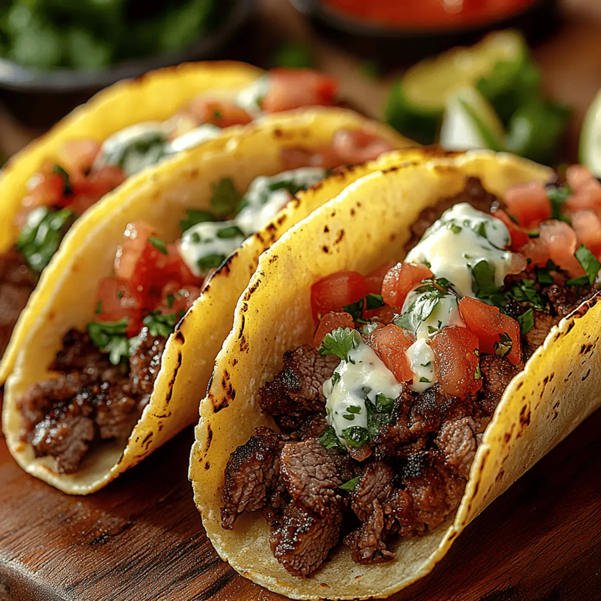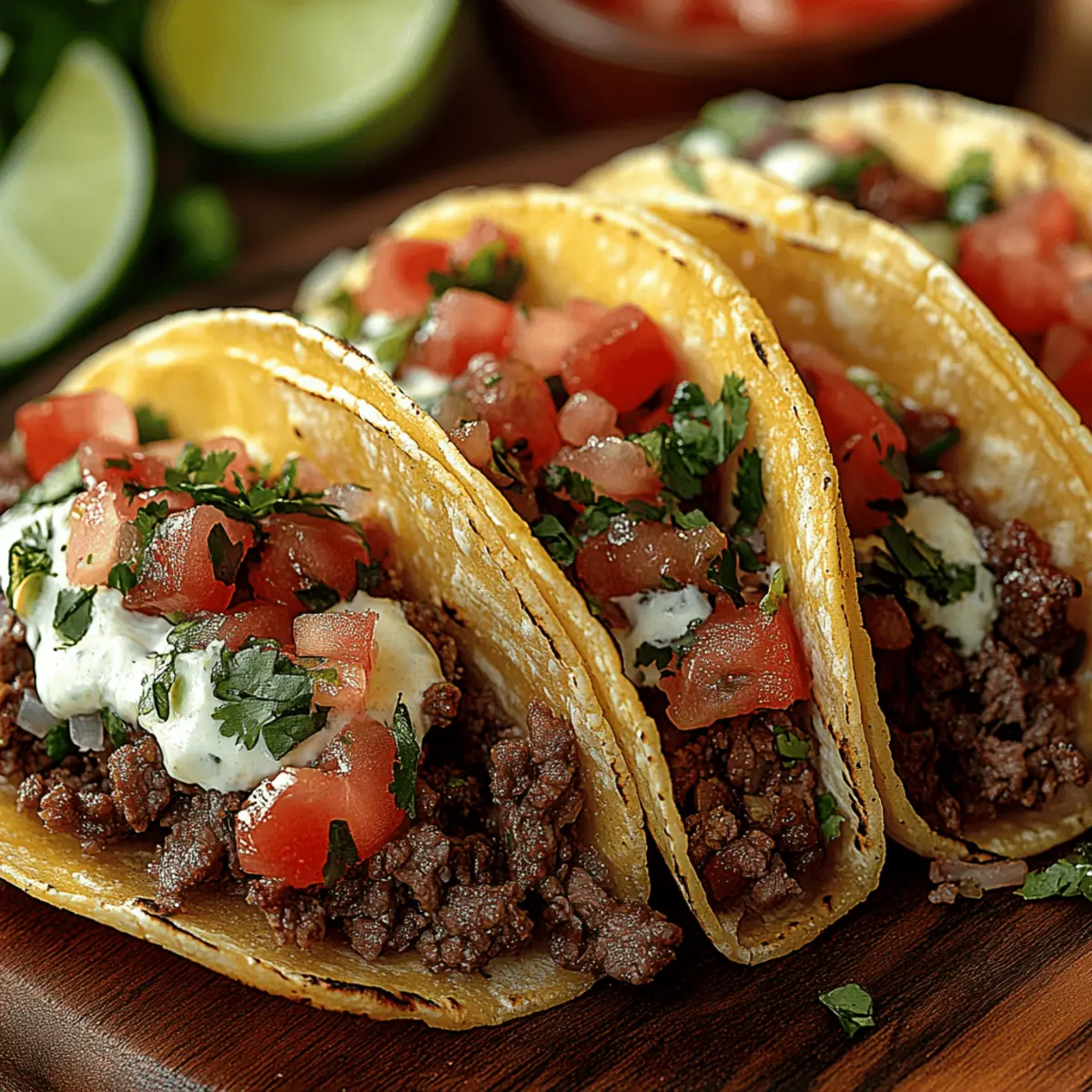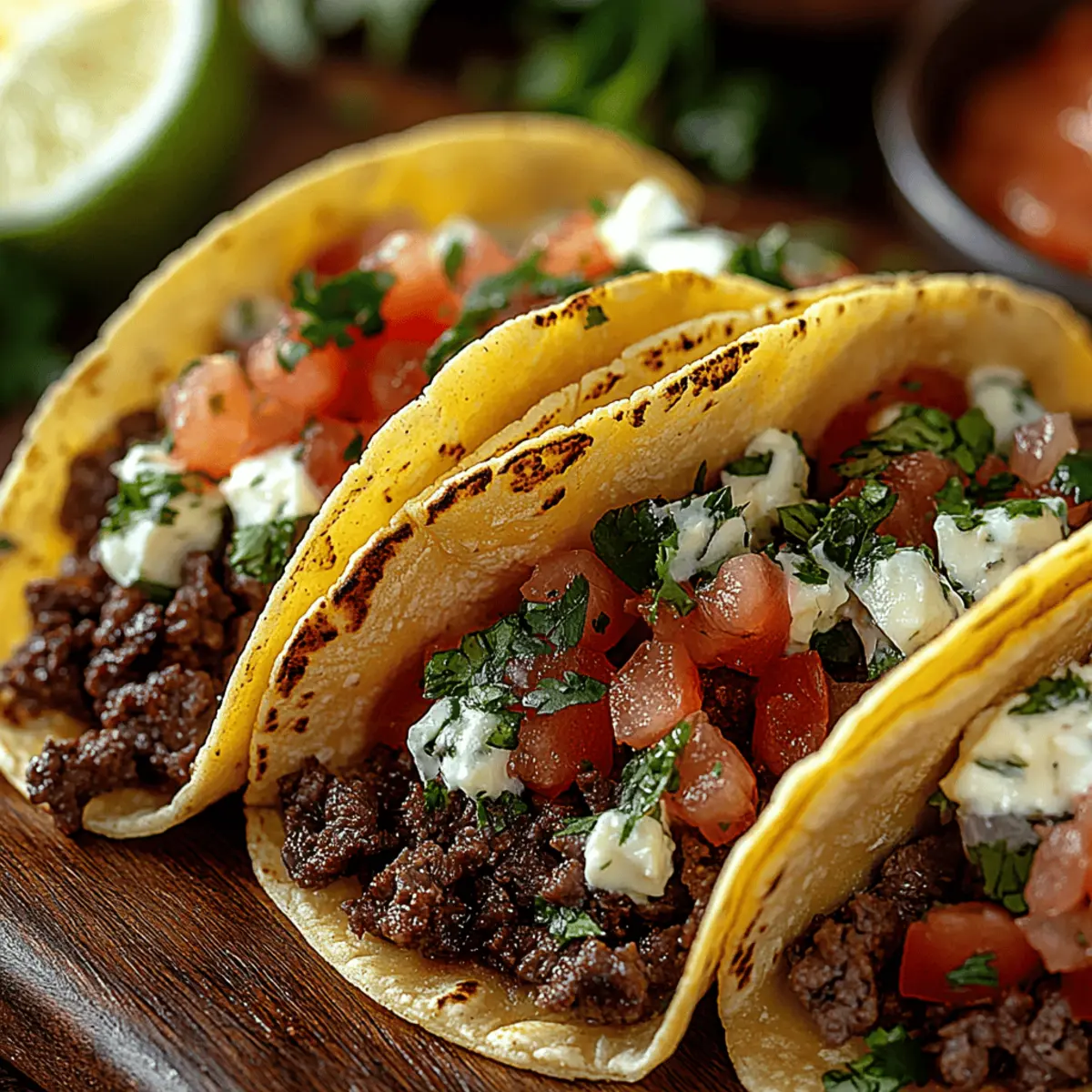 I’ll never forget the vibrant colors and tantalizing aromas wafting from the kitchen as my family prepared for taco night. There’s something magical about hearty Easy Beef Tacos that just brings everyone together. This quick, gluten-free recipe takes less than 30 minutes to whip up, making it perfect for busy weeknight dinners or festive gatherings. With tender, seasoned ground beef wrapped in your choice of crispy shells or soft tortillas, every bite feels like a flavorful celebration. You can easily customize these tacos by swapping ingredients or piling on your favorite toppings for a truly personal touch. Ready to impress your family and friends with a delicious homemade taco experience? Let’s dive into this simple yet satisfying recipe! Why are Beef Tacos a Family Favorite? Simplicity, these Easy Beef Tacos come together in under 30 minutes, making them perfect for those busy weeknights. Flavorful seasoning transforms the ground beef into a fiesta of tastes, rich with spices and topped with fresh ingredients. Versatility shines through as you can mix and match toppings to satisfy everyone’s cravings. Gluten-Free options ensure that everyone at the table can indulge without worry. Plus, crowd appeal is guaranteed; who doesn’t love a DIY taco bar during festive gatherings? If you want to explore more variations, check out our customization ideas for additional inspiration! Beef Tacos Ingredients • • Discover the essentials for crafting delicious beef tacos! For the Beef Filling Ground Beef – The main protein source, providing a savory base for the tacos; consider using ground turkey or cauliflower crumbles for a lighter twist. Onion – Adds sweetness and depth; opt for red or yellow onion depending on your flavor preference. Garlic – Provides aromatic richness; fresh minced garlic enhances the overall flavor profile. Taco Seasoning – The magic blend that brings every bite to life; homemade or store-bought varieties lend a delightful kick. Tomato Sauce – Adds moisture and balances the spices; swapping with diced tomatoes brightens the flavor if you prefer a chunkier texture. For Assembling Taco Shells/Tortillas – Your sturdy vessel; choose crispy corn shells for crunch or soft flour tortillas for a classic touch. Toppings (lettuce, tomatoes, cheese, sour cream) – Bring freshness and texture; customize with avocados or radishes for an extra zing. Feel free to explore the delightful world of beef tacos and discover how easy it is to make these vibrant, gluten-free delights at home! Step‑by‑Step Instructions for Easy Beef Tacos Step 1: Sauté Aromatics In a medium skillet, heat 1 tablespoon of vegetable oil over medium heat. Add 1 diced onion and 2 minced garlic cloves, sautéing until the onion becomes translucent and soft, about 3-4 minutes. Stir occasionally to ensure even cooking and to release those fantastic aromas, making the kitchen feel inviting. Step 2: Brown the Beef Increase the heat to medium-high, then add 1 pound of ground beef to the skillet. Use a wooden spoon to break the meat apart as it cooks, stirring until it’s browned, which should take about 6-8 minutes. Look for no pink spots and a slightly crispy texture on the edges for deliciously seasoned beef tacos. Step 3: Season the Beef Once browned, introduce your taco seasoning, stirring it into the meat to coat evenly. Next, pour in 1 cup of tomato sauce, allowing the mixture to come to a simmer. Reduce the heat to medium-low and let it cook for about 5 minutes, stirring occasionally until everything is well-combined and flavorful. Step 4: Prepare Shells While the beef is simmering, preheat the oven to 350°F (175°C) to warm your taco shells. If using soft tortillas, wrap them in foil and place them in the oven for about 10 minutes, or warm them directly on a skillet for 1-2 minutes on each side until pliable and warm. Crisp corn shells can bake for about 5 minutes until golden. Step 5: Assemble Tacos Once everything is prepared, it’s time to build those tasty Easy Beef Tacos! Start by spooning the seasoned beef into your taco shells or tortillas. Layer on your favorite toppings—fresh shredded lettuce, diced tomatoes, grated cheese, and a dollop of sour cream elevate your tacos, each addition enhancing the taste and texture. Step 6: Garnish For that extra burst of flavor, don’t forget the garnishes! Add chopped cilantro for freshness and serve with lime wedges. A drizzle of salsa or your favorite hot sauce can bring a delightful kick, tailored just to your taste buds. Step 7: Serve Present your delicious Easy Beef Tacos on a platter, offering sides like Mexican rice or refried beans for a complete meal experience. Invite friends or family to personalize their tacos at a DIY taco bar, making dinner not just a meal, but a fun, interactive experience! Expert Tips for Beef Tacos • Don’t Rush Browning: Ensure the beef is well-browned for rich flavor; undercooking can lead to bland tacos. • Customize Seasoning: Adjust taco seasoning to your taste; use homemade blends to control heat levels and spice. • Warm Your Shells: Always warm taco shells or tortillas before filling; this enhances texture and flavor, making them more enjoyable. • Layer Smartly: Start with a layer of cheese in the shell to create a barrier that absorbs moisture from toppings, keeping tacos crispy. • Mix Toppings: Diversity is key! Experiment with toppings like jalapeños, pickled onions, or corn for a delightful twist on classic beef tacos. • Save for Later: Leftover beef filling can be refrigerated for 3 days or frozen for longer storage, making future dinners a breeze. Storage Tips for Beef Tacos Fridge: Store leftover beef filling in an airtight container for up to 3 days. Make sure the beef is completely cooled before sealing to retain its moisture. Freezer: For extended storage, freeze the beef filling in a freezer-safe container for up to 3 months. Label it with the date for easy tracking. Reheat