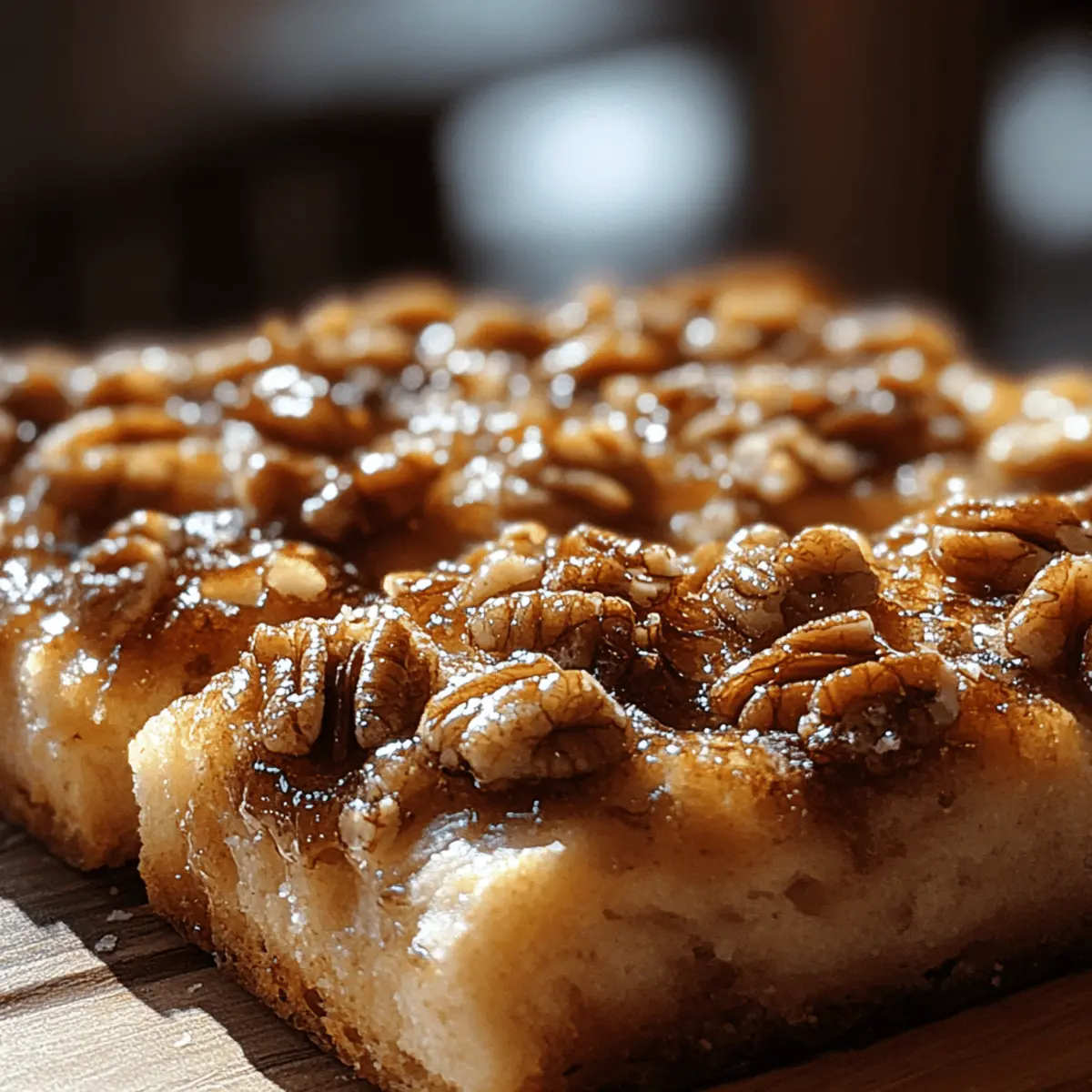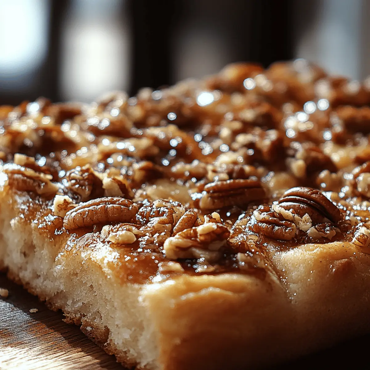 The sweetness of freshly baked bread fills the air as I pull my Sticky Pecan Focaccia from the oven. This delightful creation combines the comforting softness of focaccia with a luscious, caramelized pecan topping that will make your taste buds dance. Not only is this recipe a crowd-pleaser, but it’s also incredibly adaptable—perfect for anyone who’s exploring vegan or gluten-free options! Whether you’re serving it as a standout dessert or a luxurious treat alongside your morning coffee, this Sticky Pecan Focaccia is sure to become a cherished recipe in your home. Curious about how to elevate your baking game with this scrumptious delight? Let’s dive into the details! Why is Sticky Pecan Focaccia a Must-Try? Irresistible Sweetness: This focaccia blends soft, fluffy bread with a sticky, gooey pecan topping, creating a mouthwatering treat. Versatile Options: Easily adaptable for vegans with simple ingredient swaps, or make it gluten-free with the right flour! Quick and Simple: Perfect for busy bakers, with straightforward steps that yield delightful results in less than two hours! Perfect for Sharing: Ideal for brunch, coffee breaks, or dessert—everyone will adore this unique twist on a classic favorite! Unique Dessert Experience: This recipe is a delightful departure from ordinary desserts, offering a sweet and nutty flavor profile that stands out. Get ready to impress your friends and family with your baking prowess! If you’re curious about more delicious variations, check out our tips on making it vegan or storing leftovers! Sticky Pecan Focaccia Ingredients For the Dough Active Dry Yeast – Essential for helping the dough rise; make sure it’s fresh for the best results. Warm Water – Activates the yeast; keep it between 100°F – 110°F for optimum activation. Sugar – Sweetens the dough and nourishes the yeast; you can reduce it if you prefer less sweetness. Flour – Provides the structure; for a chewier version, opt for bread flour. Salt – Enhances flavor; it’s crucial for balancing out the sweetness. Olive Oil – Adds moisture and a rich flavor; you can substitute melted coconut oil for a vegan alternative. For the Topping Butter – Creates the indulgent sticky pecan topping; feel free to use vegan butter or coconut oil for a dairy-free option. Brown Sugar – Adds depth and a delightful caramel flavor; coconut sugar is a great substitute for a healthier choice. Vanilla Extract – Enhances the overall flavor; it’s optional if you prefer a simpler taste. Chopped Pecans – Provides the signature crunch and nutty taste; walnuts, almonds, or hazelnuts can be substituted for variety. Step‑by‑Step Instructions for Sticky Pecan Focaccia Step 1: Prepare Yeast Begin by dissolving active dry yeast and sugar in ¾ cup of warm water, ideally between 100°F and 110°F. Allow this mixture to bloom for about 5 to 10 minutes, or until it becomes frothy and bubbly. This step is crucial for activating the yeast and ensuring your Sticky Pecan Focaccia rises beautifully. Step 2: Make Dough In a large mixing bowl, combine 2 cups of flour, 1 tablespoon of sugar, and 1 teaspoon of salt. Once evenly mixed, pour in the activated yeast mixture and 2 tablespoons of olive oil. Stir with a wooden spoon or spatula until a sticky dough forms and begins to pull away from the sides of the bowl, setting the stage for a delicious focaccia. Step 3: Knead Dough Transfer the dough onto a lightly floured surface and knead for about 8 to 10 minutes. As you knead, aim for a smooth, elastic texture that no longer sticks to your hands. If necessary, sprinkle a little more flour to prevent sticking. This step develops gluten, essential for the fluffy texture of your Sticky Pecan Focaccia. Step 4: First Rise Shape the dough into a ball and place it in a lightly oiled bowl, turning it to coat. Cover the bowl with a damp cloth or plastic wrap, and let it rise in a warm, draft-free spot for 1 to 1.5 hours, until it has doubled in size. This is the magic moment that brings your focaccia to life! Step 5: Shape Dough After the dough has risen, gently punch it down to release any air bubbles. Transfer it to a greased baking pan, stretching it to fit the dimensions of the pan. Use your fingers to dimple the surface, creating small indentations that will hold the sticky topping. Allow the shaped dough to rise again for 30 to 45 minutes, covering it lightly to retain warmth. Step 6: Prepare Topping While the dough is in its second rise, melt ¼ cup of butter, along with ½ cup of brown sugar and 1 teaspoon of vanilla extract, in a saucepan over medium heat. Stir continuously until the sugar is dissolved and the mixture is bubbly and smooth. Add 1 cup of chopped pecans and mix well. Set this delightful sticky topping aside. Step 7: Bake Base Preheat your oven to 375°F (190°C). Once the dough has finished its second rise, place the pan in the preheated oven and bake the focaccia for about 20 minutes, or until it turns a lovely golden color. This gives the base a warm, inviting texture to complement the sticky topping. Step 8: Add Topping Carefully remove the focaccia from the oven and spoon the hot sticky pecan mixture evenly over the top. Make sure to cover the dimpled areas so the deliciousness seeps into the dough. Return the focaccia to the oven for an additional 8 to 10 minutes, allowing the pecans to caramelize beautifully while infusing the bread with flavor. Step 9: Cool and Serve Once the Sticky Pecan Focaccia is richly golden and bubbling, take it out of the oven. Let it cool for about 10 minutes in the pan before slicing. This cooling period helps set the topping, ensuring each slice is a delightful mix of dough and caramelized pecans. Now, you’re ready to serve this irresistible treat! Sticky Pecan Focaccia Variations Feel free to tweak this recipe to match your cravings and dietary needs—let your kitchen creativity shine! Nut-Free: Swap out the pecans entirely for seeds like sunflower 