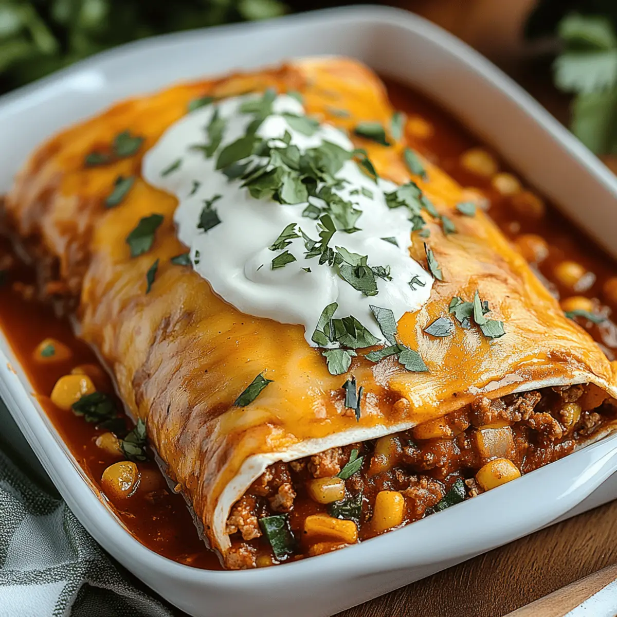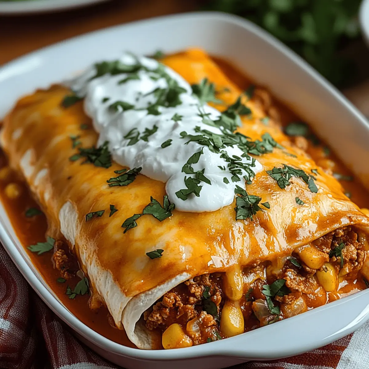 As the oven warms, a comforting aroma fills my kitchen, instantly transporting me to family gatherings where delicious food and laughter coexist. Let me introduce you to a delightful favorite: Easy Baked Wet Burritos. These hearty burritos feature tender fillings wrapped in soft flour tortillas, drenched in zesty salsa or enchilada sauce, and topped with a gooey layer of melted cheese. Not only are they a crowd-pleaser ready in under an hour, but they’re also incredibly customizable, allowing you to tailor them to suit everyone’s tastes, including vegetarian options. Imagine serving up a dish that satisfies those comfort food cravings while keeping meal prep quick and enjoyable! Are you ready to discover how to create this cozy masterpiece? Why You’ll Crave Baked Wet Burritos? Comforting Delight: Each bite of these Baked Wet Burritos offers a warm embrace of flavors that can turn any evening into a cherished affair. Customize to Perfection: The filling possibilities are endless—you can mix and match proteins or create a rich vegetarian delight that everyone will love. 30-Minute Wonder: With just under 30 minutes in the oven, you’re ready to serve a hearty meal that doesn’t skimp on taste or comfort. Crowd-Pleasing Appeal: Perfect for family dinners, game nights, or casual gatherings, these burritos will make everyone feel right at home. Mix It Up: Feeling adventurous? Add in jalapeños for some heat or swap cheese kinds to fit your family’s preferences. Whether you choose traditional flavors or put a twist on them, vegetarian substitutions can easily keep everyone satisfied! Baked Wet Burritos Ingredients • Perfect for customizing flavors! For the Filling Ground Meat (or Protein of Choice) – Main filling; substitute with beans, sautéed veggies, or plant-based proteins for a delicious vegetarian option. Onion and Garlic – Flavor foundation; any onions (yellow, white, or red) and fresh garlic enhance the aroma. Beans – Adds texture and nutrition; black beans or pinto beans are great choices for added heartiness. Spices (e.g., chili powder, cumin) – For seasoning; adjust according to personal heat preferences. For the Wrap Tortillas – The cozy base for wrapping; use soft flour tortillas for the best results, or be gentle if using corn tortillas. For the Topping Cheese (Cheddar and Monterey Jack blend) – Melting agent and flavor enhancer; mozzarella can be a milder substitute or try pepper jack for extra spice. Salsa or Enchilada Sauce – Covers burritos, adding moisture and flavor; feel free to use store-bought or your own homemade version. For Garnishing Toppings – Fresh cilantro, green onions, avocado, or sour cream add perfect finishing touches for flavor and texture. With these ingredients in hand, you’re well on your way to creating the most satisfying Baked Wet Burritos that everyone will adore! Step‑by‑Step Instructions for Baked Wet Burritos Step 1: Prepare the Filling In a large skillet, heat a drizzle of oil over medium heat. Add chopped onions and minced garlic, sautéing until they become fragrant and translucent, about 3-4 minutes. Stir in your choice of ground meat, cooking until browned and fully cooked, approximately 5-7 minutes. Next, mix in the beans and spices, allowing the mixture to thicken for another 2-3 minutes while stirring continuously. Step 2: Warm the Tortillas To prevent cracking, gently warm the flour tortillas in a dry skillet over low heat for about 1 minute on each side, just until pliable. Alternatively, you can wrap them in a damp cloth and microwave for 15-20 seconds. Softening the tortillas makes it easier to roll your Baked Wet Burritos without tearing, ensuring a perfect wrap around your delicious filling. Step 3: Assemble the Burritos On each warmed tortilla, add a generous scoop of your savory filling, followed by a sprinkle of cheese. Carefully fold in the sides and roll the tortilla tightly from the bottom, placing each burrito seam-side down into a greased baking dish. Continue until all the filling is used up, creating a cozy lineup of Baked Wet Burritos ready for their topping. Step 4: Add Sauce and Cheese Once all burritos are snugly in the dish, pour your chosen salsa or enchilada sauce evenly over the top, ensuring they are well covered. This adds flavor and moisture while the burritos bake. Finish by sprinkling a generous layer of additional cheese over the sauce for that irresistible gooey finish that will melt beautifully in the oven. Step 5: Bake Preheat your oven to 375°F (190°C). Slide the baking dish into the oven and bake for 25-30 minutes, or until the cheese is bubbly and golden brown. Keep an eye on them to prevent over-browning. The magic happens as everything melds together, creating the comforting flavors of Baked Wet Burritos that you’ll love. Step 6: Serve Once baked, remove the dish from the oven and let it sit for a few minutes to set. Top your Baked Wet Burritos with fresh cilantro, sliced green onions, avocado, or a dollop of sour cream for added flavor and freshness. Serve alongside Mexican rice or a crisp green salad to fully enjoy this hearty meal that’s perfect for any gathering. What to Serve with Baked Wet Burritos? Elevate your meal experience by pairing your comforting Baked Wet Burritos with complementary sides that delight both the palate and the eyes. Mexican Rice: The classic side that adds a vibrant splash of color and a fluffy texture, perfectly balancing the flavors of the burritos. Refried Beans: Creamy and rich, this hearty addition brings an extra layer of comfort that pairs beautifully with the zesty sauce of the burritos. Fresh Salsa: A burst of freshness, this tangy salsa not only brightens up the plate but also adds a refreshing crunch and depth to each bite. Guacamole: Creamy and rich, guacamole enhances the flavors of burritos while providing that satisfying buttery texture alongside the zesty filling. Crisp Green Salad: Light and refreshing, a salad with