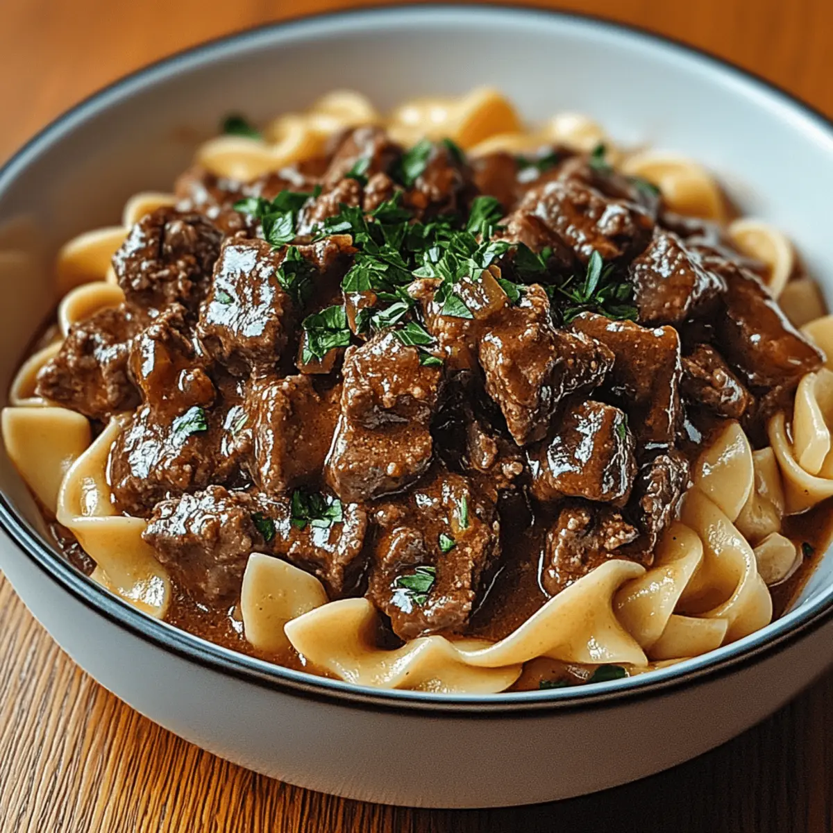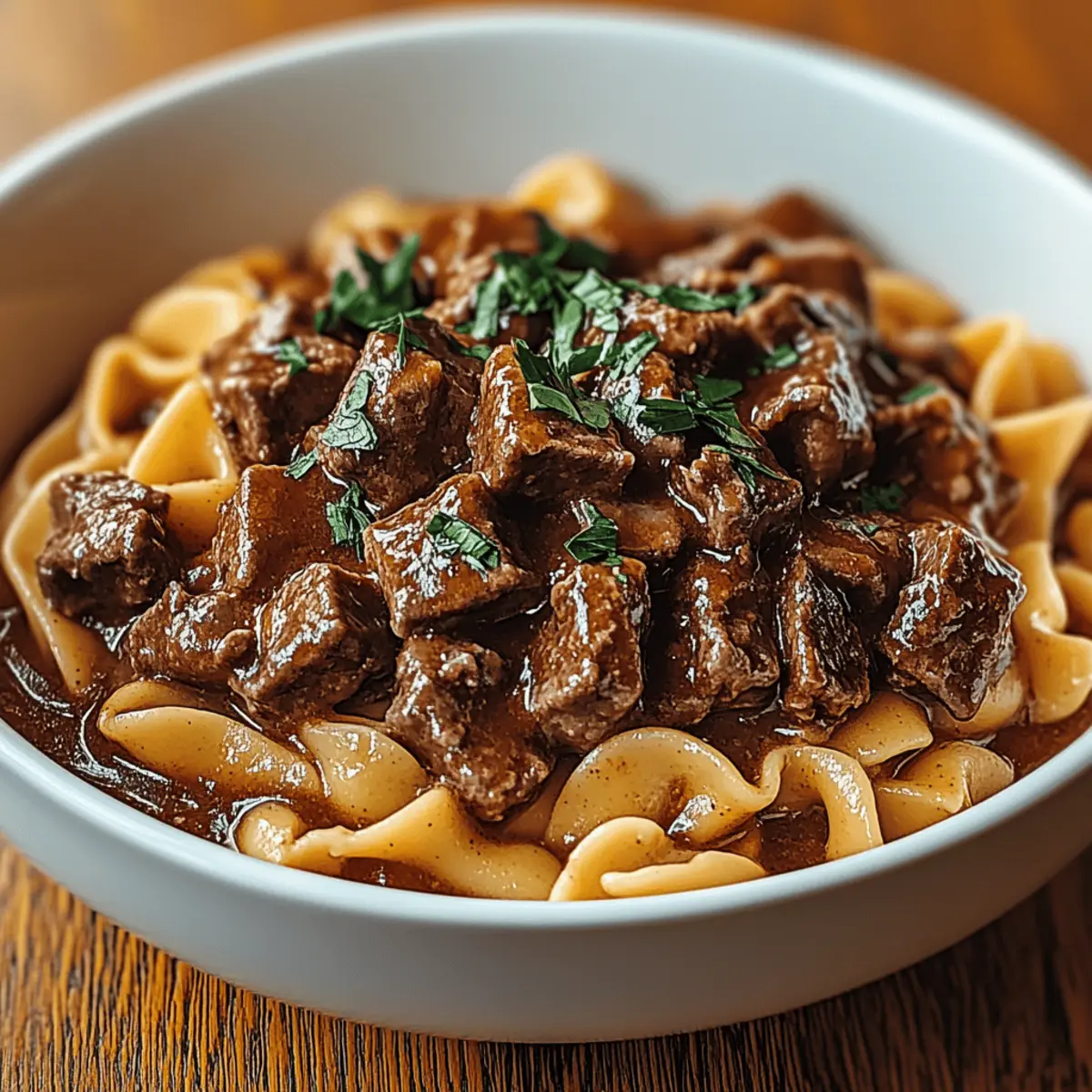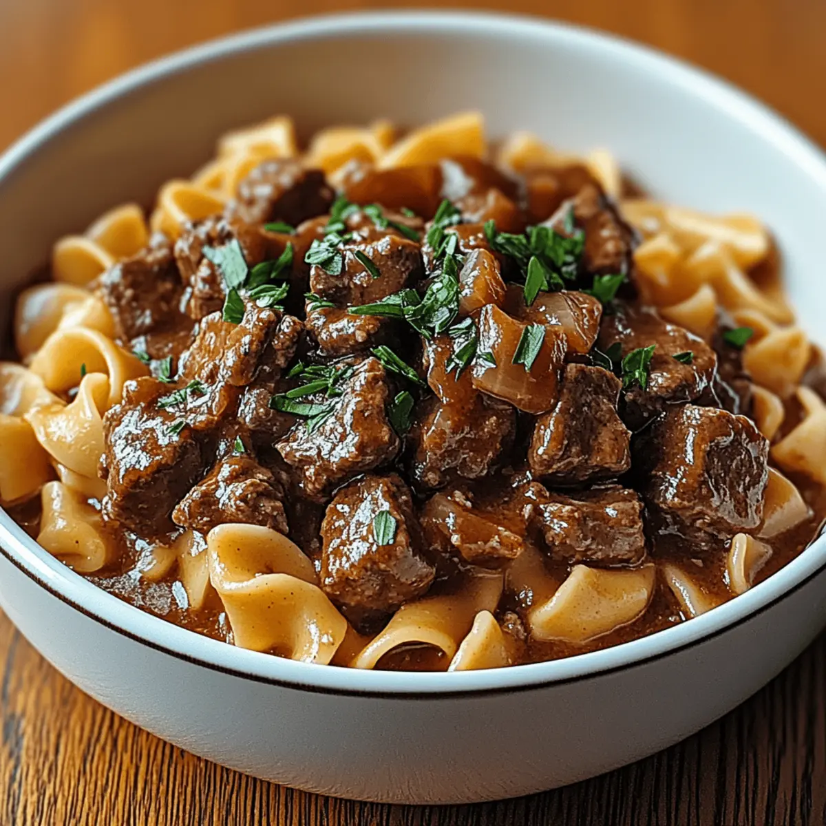 As the crisp air invades my kitchen, I can’t help but think of the comfort that comes from a warm, hearty dish. Enter the Hearty Amish Beef & Noodles, a recipe that dances with nostalgia and nourishes the soul. This delightful homestyle meal features tender, slow-cooked beef smothered in a rich, savory gravy over silky egg noodles, delivering flavors that coax you into a cozy embrace. Not only is this dish a surefire crowd-pleaser, but it’s also incredibly adaptable for those navigating gluten or dairy restrictions. Whether you’re prepping for a family gathering or simply indulging in some self-care, this recipe promises satisfaction in every bite. Ready to take your taste buds on a delightful journey? Why You’ll Crave This Dish? Comforting Warmth: Each bowl of Hearty Amish Beef & Noodles wraps you in a cozy hug, perfect for chilly evenings. Flavor Explosion: The savory gravy combined with tender beef creates an irresistible flavor profile that will have everyone asking for seconds. Versatile Ingredients: Easily adapt this recipe to meet various dietary needs by using gluten-free or dairy-free options without sacrificing taste. Time-Saving Ease: Prep is minimal, letting you spend more time enjoying with loved ones and less time in the kitchen. Check out our expert tips for additional shortcuts! Crowd-Pleasing Deliciousness: Whether for family dinners or gatherings, this dish is sure to impress and satisfy everyone at the table. Hearty Amish Beef & Noodles Ingredients For the Beef • Beef Chuck – Main protein providing richness and flavor; can also use brisket or bottom round with adjusted cooking times. For the Sauce • Salt and Pepper – Essential for seasoning; adjust quantities to taste for a personalized flavor. • Onion – Adds sweetness and depth; should be diced finely for even cooking. • Garlic – Enhances aroma and taste; using fresh garlic will yield the best flavor profile. • Beef Broth – Creates the base for the gravy; low-sodium broth can be used for a healthier option. • Butter – Used to make the roux for thickening the gravy; dairy-free butter can be utilized for a dairy-free version. • Flour – Thickens the gravy; gluten-free flour can be substituted if necessary. For the Noodles • Egg Noodles – Traditional pasta for the dish, delivering enticing texture; wide pasta or gluten-free noodles can be used as alternatives. For Garnish • Fresh Parsley/Chives – Adds a touch of freshness and visual appeal; optional but enhances the presentation. This delightful combination yields a Hearty Amish Beef & Noodles dish that delivers comfort and home-cooked warmth with every serving! Step‑by‑Step Instructions for Hearty Amish Beef & Noodles Step 1: Prepare & Brown Beef Begin by cutting the beef chuck into 1-inch chunks, then season generously with salt and pepper. Heat a large skillet over medium-high heat and add a splash of oil. Sear the beef in batches for about 4-5 minutes per side, until each piece develops a beautiful brown crust. This step enhances the flavor of the Hearty Amish Beef & Noodles. Step 2: Sauté Aromatics In the same pot, reduce the heat to medium and add diced onions and minced garlic. Sauté for 3-4 minutes, stirring frequently until the onions have softened and turned translucent, releasing their sweet aroma. This will create a wonderful base for your beef and gravy mixture, enhancing the overall flavor of your Hearty Amish Beef & Noodles. Step 3: Simmer Beef Return the browned beef to the pot and pour in enough beef broth to cover the beef completely. Bring the mixture to a gentle boil, then reduce the heat to low. Cover and let it simmer for 2-3 hours, stirring occasionally, until the beef is fork-tender and the flavors have melded beautifully. The meat should be juicy and easily shredded. Step 4: Make Gravy In a separate saucepan, melt 4 tablespoons of butter over medium heat. Whisk in an equal amount of flour to form a roux, stirring constantly for 2-3 minutes until it becomes a light golden color. Gradually pour in some of the cooking liquid from the beef, whisking continuously until the gravy thickens and is smooth, about 5-7 minutes. Step 5: Combine Gravy & Beef Pour the thickened roux back into the pot with the beef mixture, stirring well to coat all the meat evenly with the rich gravy. Allow this combined mixture to cook for an additional 10 minutes on low heat, letting the flavors intensify even further. The Hearty Amish Beef & Noodles will become luxuriously rich and flavorful. Step 6: Cook Noodles While the beef simmers, bring a large pot of salted water to a rolling boil. Add the egg noodles and cook according to package directions until al dente, usually around 6-8 minutes. Once cooked, drain the noodles and set aside, allowing them to retain their texture and ensure they soak up the savory goodness from the beef and gravy. Step 7: Serve To serve, gently fold the cooked noodles into the beef and gravy mixture, ensuring every strand is well coated. Taste and adjust the seasoning with more salt and pepper, if needed. Garnish with freshly chopped parsley or chives for an inviting presentation. Distribute the Hearty Amish Beef & Noodles into bowls and enjoy the warmth of this comforting meal. Storage Tips for Hearty Amish Beef & Noodles Fridge: Store leftovers in an airtight container for up to 4 days, keeping your Hearty Amish Beef & Noodles fresh and flavor-packed. Freezer: For extended preservation, freeze portions in airtight containers for up to 3 months. Remember to label them with a date for easy tracking! Reheating: When ready to enjoy, defrost overnight in the fridge, and reheat on the stovetop over low heat. Add a splash of broth to prevent the noodles from drying out. Preventing Spoilage: Make sure to cool the dish to room temperature before refrigerating or freezing to maintain its deliciousness and quality! Make Ahead Options These Hearty Amish Beef & Noodles are perfect for busy weeknights, allowing