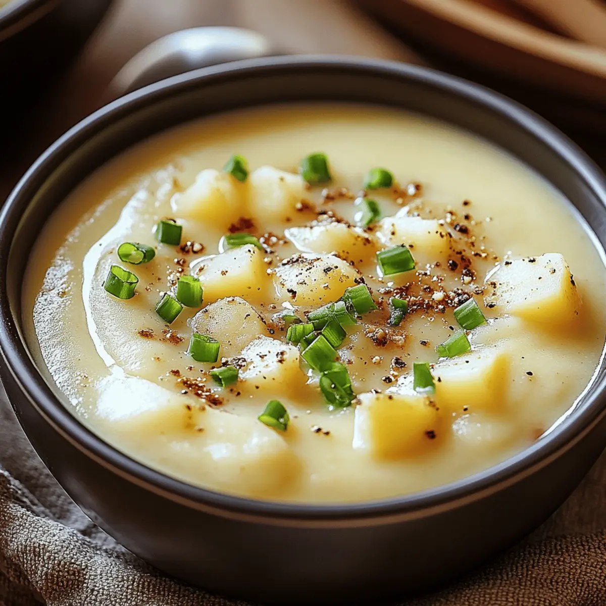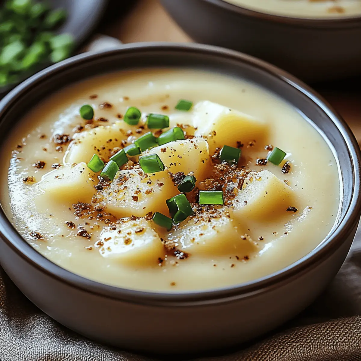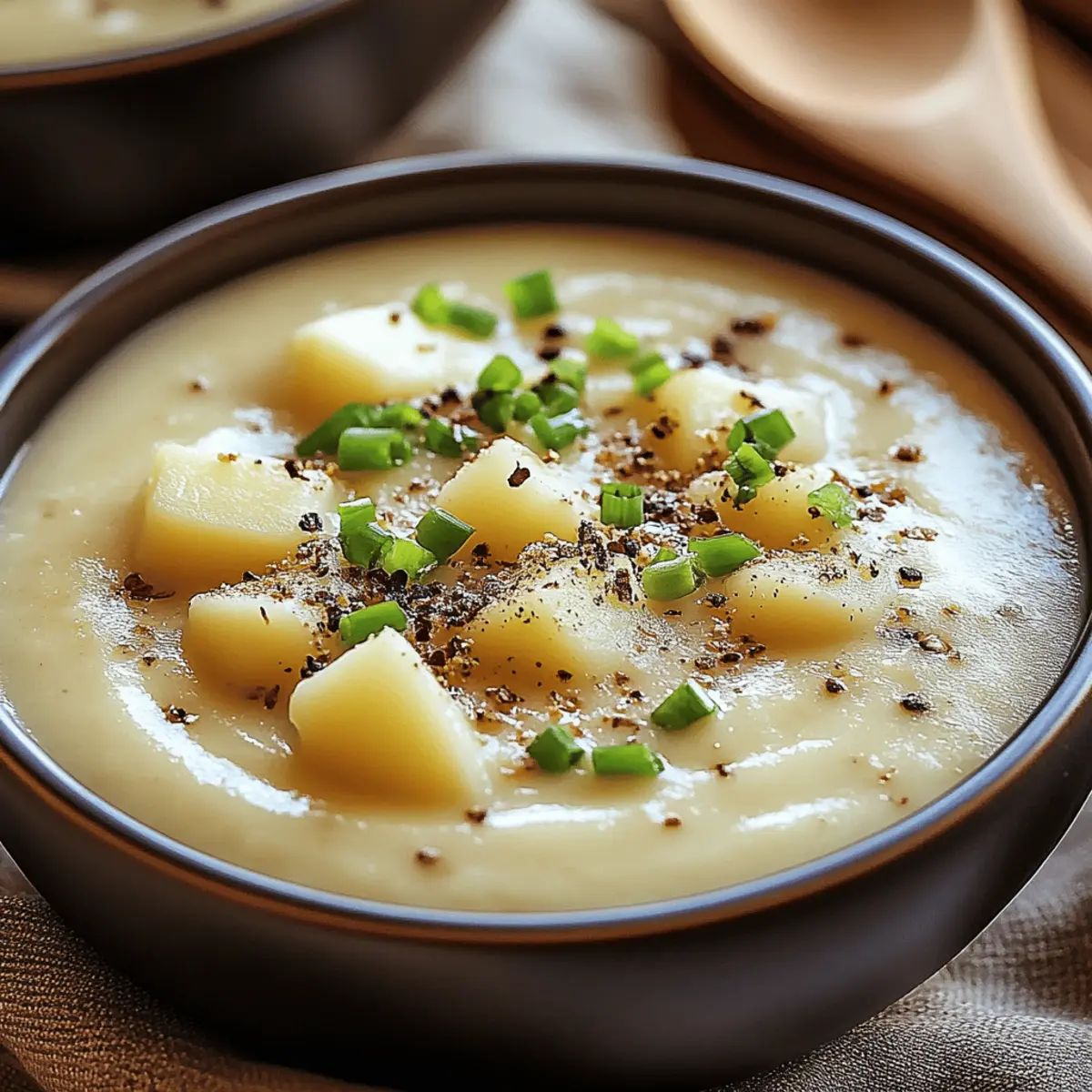 As the first chill of autumn creeps in, there’s nothing quite like the soothing aroma of homemade soup wafting through the kitchen. Today, I’m excited to share my go-to recipe for Creamy Potato Soup. This velvety delight brings together tender russet potatoes and smooth cream for a genuinely comforting bowl of goodness that warms both body and soul. One of the best parts? It’s incredibly customizable, allowing you to add your favorite ingredients or toppings, making it perfect for family dinners or a cozy night in. Plus, this gluten-free recipe ensures everyone can enjoy a bowl without worry. Ready to dive into a bowl of comfort? Let’s get cooking! Why is Creamy Potato Soup a Must-Try? Comforting Warmth: This creamy potato soup envelops you in warmth, making it the perfect dish as the weather cools. Irresistibly Rich: With a velvety texture and luxurious flavor from smooth cream, it’s a rich delight you won’t forget. Customizable Goodness: Tailor this recipe to suit your taste—experiment with toppings like crispy bacon or fresh herbs for a unique twist! Quick and Easy: A straightforward process means you can enjoy homemade goodness in just about 30 minutes. Healthy Choice: Gluten-free and packed with nutrients, this soup is guilt-free comfort food that satisfies your cravings while being nourishing. Family Favorite: Whether it’s a rainy day or a busy weeknight, this creamy potato soup always pleases the crowd! Creamy Potato Soup Ingredients For the Soup Base Russet Potatoes – Main ingredient providing structure; Yukon gold potatoes can be used for a slightly different texture. Butter – Enhances flavor when sautéing; olive oil can be swapped for a dairy-free option. Onion – Provides depth of flavor as the aromatic base; shallots can be used for a milder taste. Garlic – Adds a warm kick; fresh garlic is preferred, but garlic powder works in a pinch. For the Liquid Broth (Vegetable or Chicken) – Adds liquid and flavor; opt for low-sodium broth for a healthier option. Heavy Cream or Milk – Contributes to the soup’s delicious creaminess; substitute with coconut milk or almond milk for a dairy-free version. For Seasoning Salt and Pepper – Essential for flavor; adjust according to the broth’s saltiness. This creamy potato soup is the epitome of warmth and comfort, inviting you to blend and savor each spoonful. Enjoy the process of making it uniquely yours! Step‑by‑Step Instructions for Creamy Potato Soup Step 1: Prepare Ingredients Begin by peeling and dicing about 2 pounds of russet potatoes into small cubes for even cooking. Chop one medium onion and mince three cloves of garlic to infuse the soup with flavor. Keep your ingredients organized and ready, as this will make the cooking process smoother and more enjoyable as you dive into creating your creamy potato soup. Step 2: Sauté Aromatics In a large pot, melt 4 tablespoons of butter over medium heat. Once melted, add the chopped onion and minced garlic, stirring frequently for about 5 minutes until the onion is tender and translucent. This aromatic base is essential for your creamy potato soup, providing depth of flavor that will enhance the overall dish. Step 3: Cook Potatoes Add the diced russet potatoes to the pot and stir everything together, allowing the potatoes to soak up the delightful flavors. Pour in 4 cups of vegetable or chicken broth, turning the heat up to bring it to a boil. Once boiling, reduce the heat and let it simmer for 15-20 minutes until the potatoes are fork-tender, creating a rich and comforting soup base. Step 4: Blend Soup Once the potatoes are tender, it’s time to blend the soup. Use an immersion blender directly in the pot for convenience, or carefully transfer the mixture to a blender in batches. Blend until the soup reaches a smooth and velvety consistency, ensuring that all the flavors are well combined without any lumps. Step 5: Add Cream Return the blended soup to the pot, if needed, and gradually stir in 1 cup of heavy cream or milk. Allow the mixture to warm gently over low heat, but be careful not to let it boil to prevent curdling. Season your creamy potato soup with salt and pepper to taste, adjusting the flavors according to your preference. Step 6: Serve Ladle the creamy potato soup into bowls, and get creative with garnishes! Consider topping with crispy bacon, shredded cheese, or fresh chives for an added punch. For a fun twist, serve your soup in hollowed-out bread bowls, making each bite even more satisfying. Enjoy the delightful warmth of your homemade creamy potato soup! Expert Tips for Creamy Potato Soup Avoid Curdling: Stir in cream gently and avoid boiling the soup after adding it to keep your creamy potato soup velvety. Texture Adjustment: For a thicker soup, mash some potatoes before blending. This method adds body while keeping it smooth. Flavor Variations: Experiment with herbs like thyme or rosemary for added depth, ensuring your creamy potato soup feels unique and satisfying. Add More Veggies: Consider adding carrots or celery for extra nutrients and flavor; just be sure to adjust cooking times as needed. Proper Storage: Refrigerate leftovers in an airtight container and enjoy them within 3 days to maintain the creamy texture and flavor. Creamy Potato Soup Variations Customize your creamy potato soup and make it uniquely yours with these exciting twists and substitutions! Dairy-Free: Substitute heavy cream with coconut milk or almond milk for a luscious vegan version that doesn’t skimp on creaminess. Herb-Infused: Add fresh herbs like thyme or rosemary to elevate flavors, creating a fragrant aroma that delights the senses. Spicy Kick: Stir in a pinch of cayenne pepper or crushed red pepper flakes for a warming heat that complements the creamy texture beautifully. Veggie Boost: Toss in diced carrots, celery, or leeks while cooking for extra nutrition and flavor depth—each added vegetable brings a new layer of comfort! Cheesy Goodness: Stir i