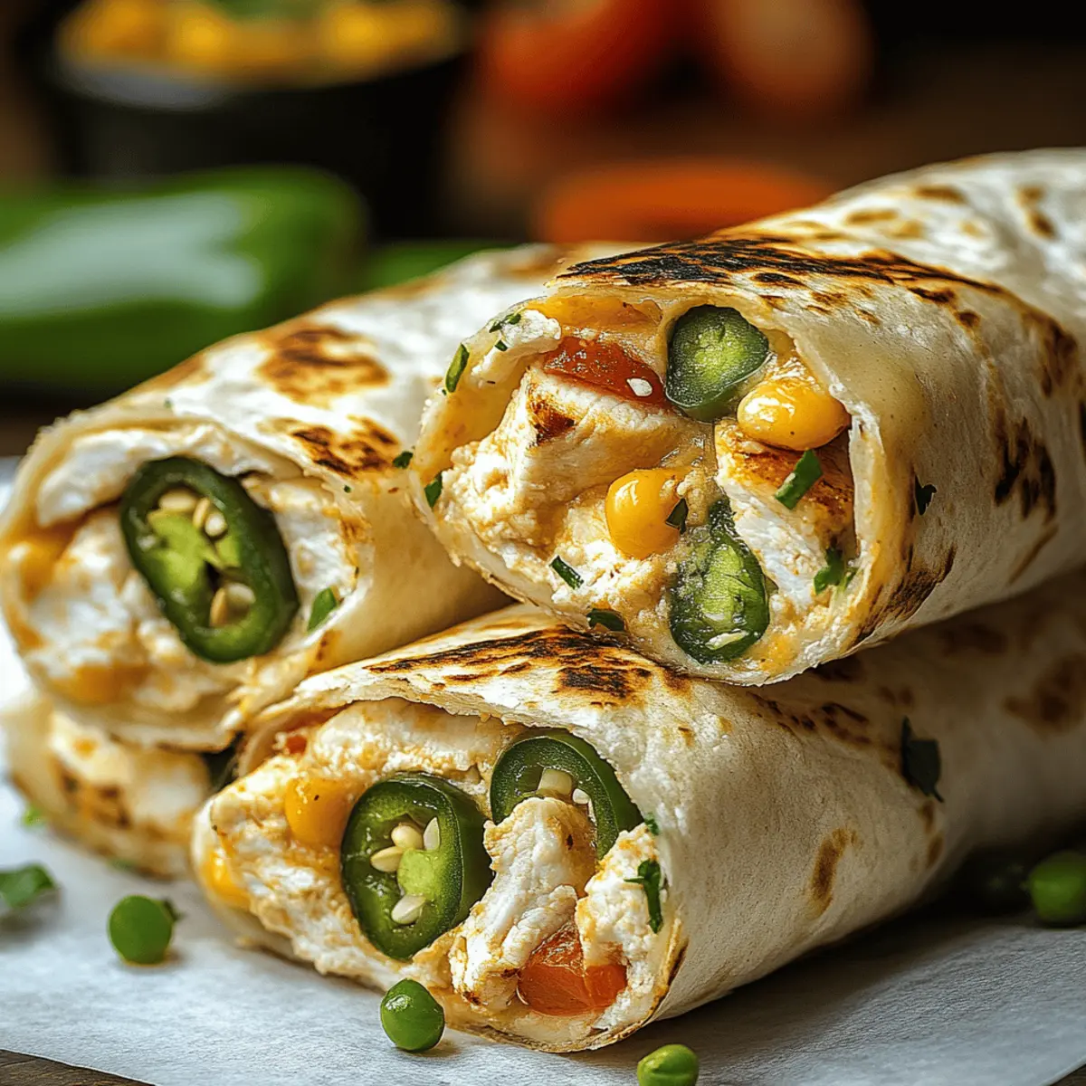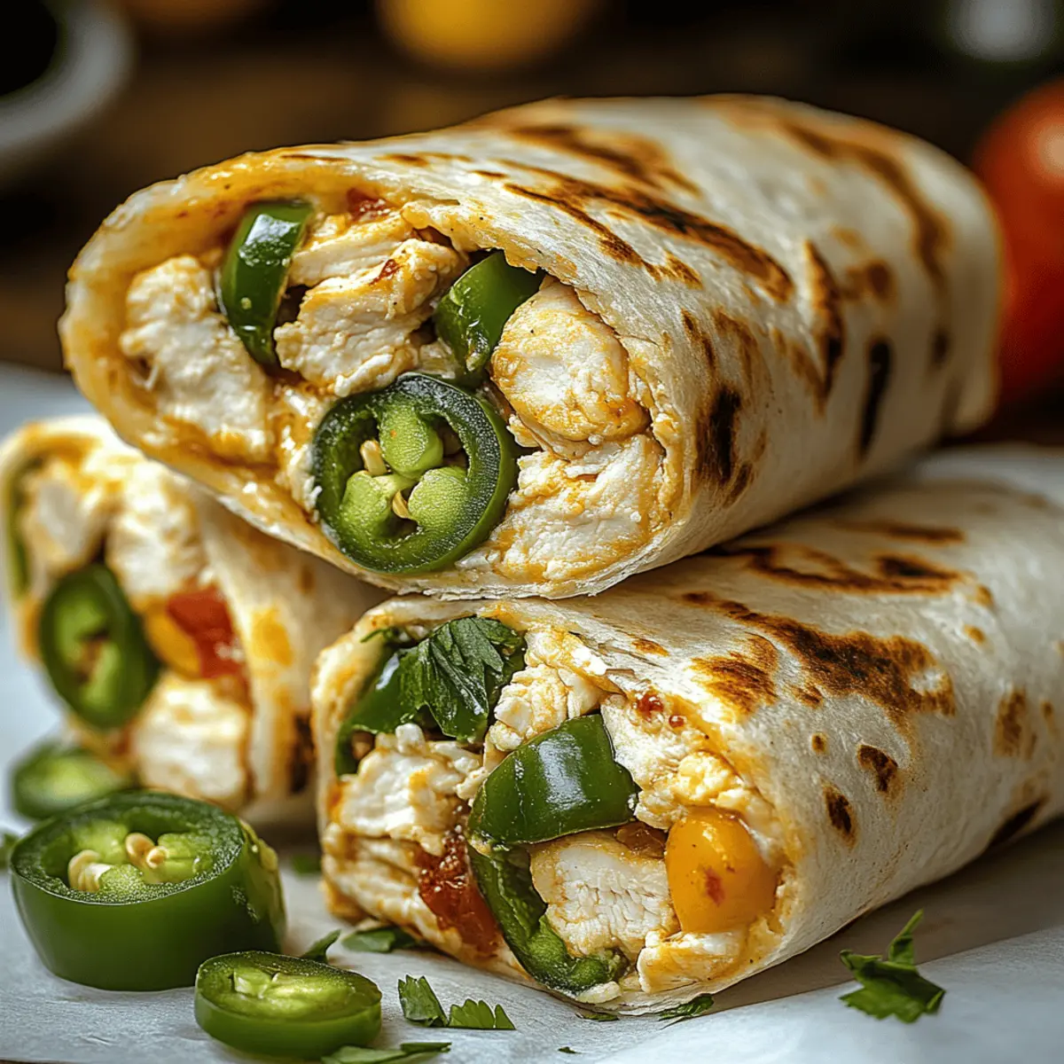 As I rummaged through my fridge one afternoon, a lightbulb moment struck me—I had all the makings for Spicy Jalapeño Popper Chicken Wraps! The thought of tender chicken mingling with creamy cheeses and crispy bacon wrapped snugly in a soft tortilla was just too enticing to resist. This fun recipe isn’t only a quick and effortless way to satisfy your snack cravings; it’s also a delightful treat for those who enjoy a little spice in their life. Perfect for busy weeknights or as a show-stopping appetizer at your next gathering, these wraps can easily be adjusted to match your desired level of heat. Ready to treat yourself to a flavor explosion? Let’s dive into making these zesty wraps that are destined to become a new favorite! Why Are These Wraps So Popular? Quick and Easy: These Jalapeño Popper Chicken Wraps can be whipped up in no time, making them perfect for a busy weeknight or spontaneous snack. Flavor Explosion: Each bite balances spicy jalapeños with creamy cheeses and crispy bacon, satisfying every craving! Customizable: Feel free to adjust the heat level by modifying the jalapeño quantity or trying different cheese blends for exciting twists. Crowd-Pleaser: Whether it’s game day or a cozy gathering, these wraps will disappear fast—everyone will be coming back for more! Gluten-Free Option: Simply swap in gluten-free tortillas to cater to dietary needs without sacrificing flavor. Jalapeño Popper Chicken Wraps Ingredients For the Filling Chicken Breast – A tender and juicy protein base; swap for chicken thighs for more flavor. Bacon – Crispy and savory; complements the creaminess of the filling perfectly. Jalapeños – The star ingredient! Adjust the quantity depending on your heat preference—removing seeds lessens spiciness. Cream Cheese – Adds a rich and creamy texture; Greek yogurt can be a lighter alternative but will change the taste. Cheddar Cheese – Brings depth and helps bind the filling; feel free to experiment with different cheese varieties for unique flavors. For the Wrap Flour Tortillas – The trusty vessel for your filling; switch to gluten-free tortillas for a gluten-free option. For Seasoning Garlic Powder – Enhances the flavor profile with its aromatic touch. Pepper – Curbs any blandness and elevates the overall taste. Dive into these irresistible Jalapeño Popper Chicken Wraps that are sure to be a hit in every kitchen! Step‑by‑Step Instructions for Jalapeño Popper Chicken Wraps Step 1: Prepare Chicken Begin by cooking the chicken breast through either boiling, grilling, or sautéing it over medium heat until fully cooked, about 15–20 minutes. Ensure the chicken reaches an internal temperature of 165°F and has no pink inside. Once cooked, shred the chicken into bite-sized pieces and set it aside for mixing in the wrap. Step 2: Cook Bacon & Jalapeños In a large skillet, add diced bacon and cook over medium-high heat until crispy, about 5–7 minutes. Remove the bacon from the skillet and let it drain on paper towels, then crumble it after it cools. In the same skillet, sauté diced jalapeños for 2–3 minutes until they soften slightly but remain vibrant, then remove from heat. Step 3: Mix Filling In a mixing bowl, combine the shredded chicken, softened cream cheese, grated cheddar cheese, sautéed jalapeños, and crumbled bacon. Sprinkle in garlic powder, salt, and pepper to taste. Mix all the ingredients thoroughly until smooth and well-combined, ensuring the spicy and cheesy flavors meld together perfectly for your Jalapeño Popper Chicken Wraps. Step 4: Assemble Wraps Take a flour tortilla and lay it flat on a clean surface. Spoon a generous amount of the chicken filling down the center, leaving space on the sides. Fold in the sides of the tortilla, then carefully roll it tightly from the bottom up to create a neatly wrapped package. Repeat the process with the remaining tortillas and filling. Step 5: Toast For added texture, heat a skillet or panini press over medium heat. Place the assembled wraps seam-side down in the skillet and toast for about 3–4 minutes, or until golden brown and crisp. If using a panini press, toast for the same amount of time, allowing the cheese to melt and the wraps to become perfectly crispy. Step 6: Garnish & Serve Once toasted, remove the wraps from the skillet and let them cool for a minute. Optionally, garnish with fresh cilantro or sliced green onions for a pop of color. Serve your delightful Jalapeño Popper Chicken Wraps with sides of sour cream, ranch dressing, or your favorite dipping sauce for a perfect touch. Ideal for gatherings or a satisfying snack! What to Serve with Spicy Jalapeño Popper Chicken Wraps Enhance your dining experience by pairing these wraps with delicious sides that complement their cheesy, spicy goodness. Creamy Coleslaw: This refreshing side offers a crunchy contrast, balancing the richness of the wraps and cooling the heat of the jalapeños. Tangy Salsa: Fresh salsa made with diced tomatoes, onions, and cilantro adds a zesty flavor that brightens each bite and matches beautifully with the wraps. Guacamole: The creamy avocado dip brings a smooth texture and a hint of coolness, making it an irresistible dip alongside the spicy wraps. Spiced Rice: Fluffy seasoned rice adds a heartiness to your meal and can soak up the extra cheese and sauce from the wraps, creating a satisfying dish. Roasted Veggies: Colorful roasted bell peppers and zucchini provide a sweet, caramelized flavor that pairs perfectly with the spicy elements of the wraps. Chilled Beverages: For a refreshing drink, serve with icy limeade or a light beer, which counterbalances the heat and elevates the enjoyment of your meal. Delight in the experience of enjoying your Spicy Jalapeño Popper Chicken Wraps with these flavorful pairings! How to Store and Freeze Jalapeño Popper Chicken Wraps Fridge: Store leftover wraps in an airtight container for up to 3 days to maintain freshness and flavor. Freeze
