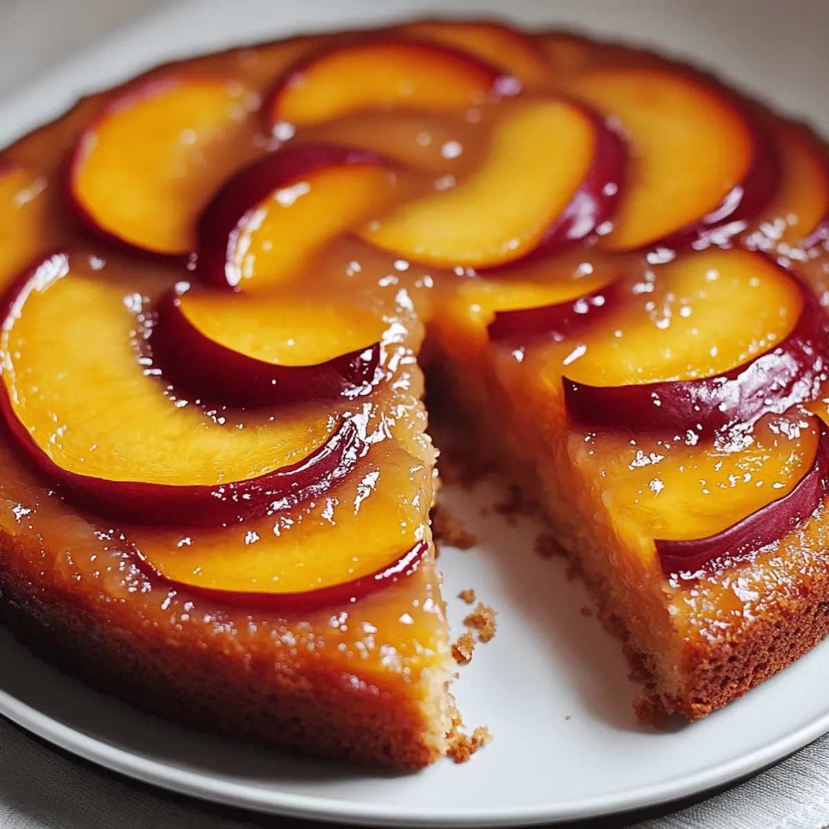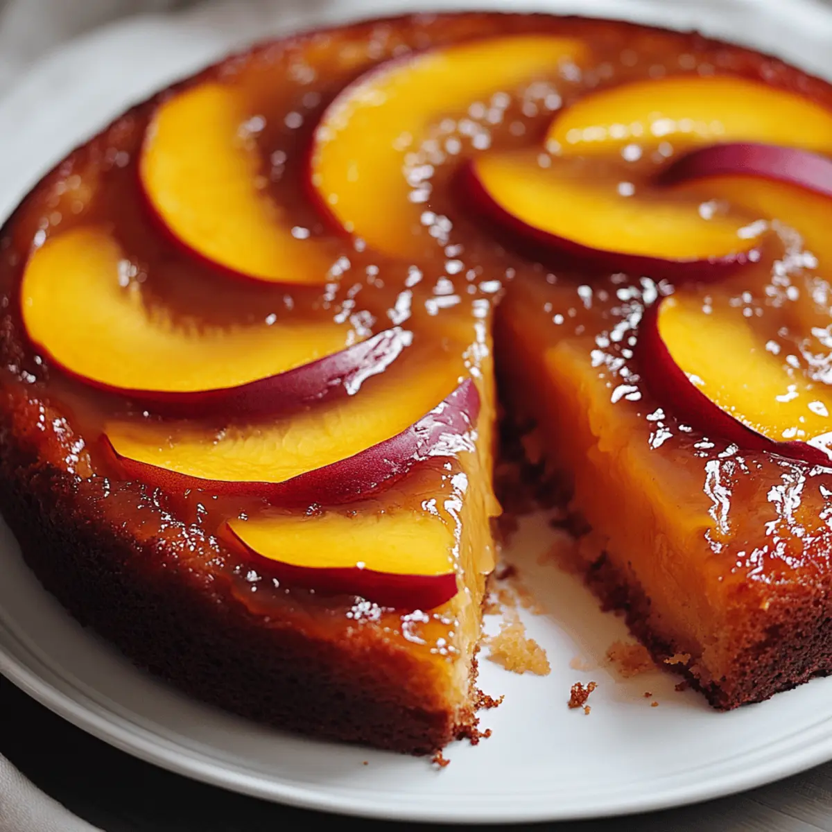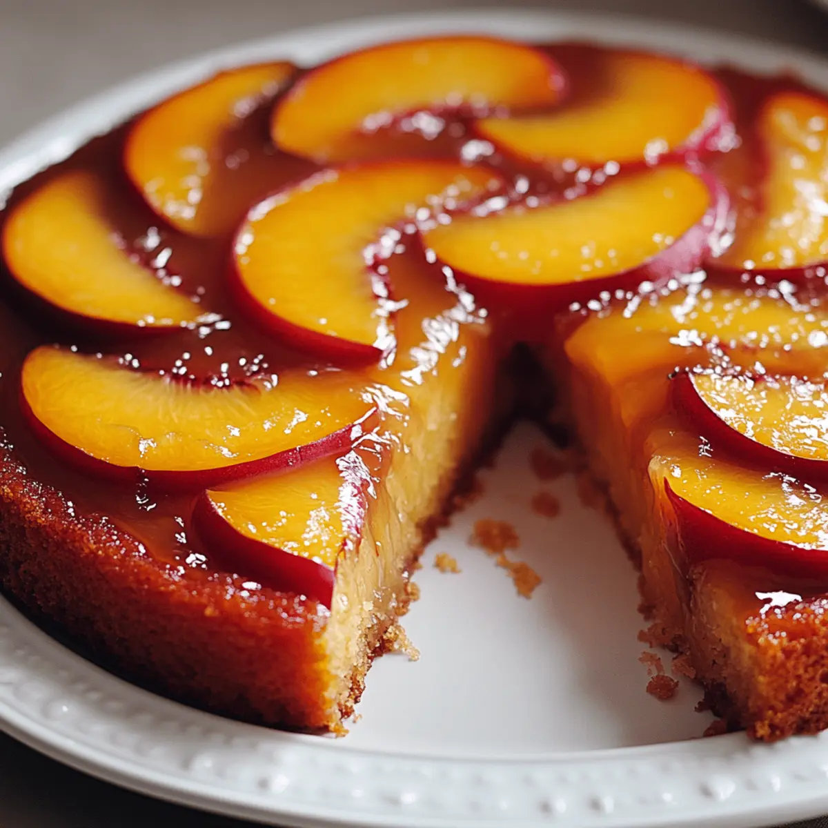 As I pulled the warm Perfect Peach Upside-Down Cake from the oven, the sweet aroma of caramelized peaches filled the kitchen, instantly transporting me to sun-kissed summer days. The beauty of this delightful dessert lies not just in its stunning presentation, but also in its effortless preparation that makes it a go-to crowd-pleaser for any gathering. With the perfect balance of gooey caramel and a tender, fluffy cake, this recipe is incredibly satisfying. Plus, it accommodates various dietary needs, thanks to simple gluten-free substitutions. Whether you’re whipping it up for a summer barbecue or a cozy family dinner, this cake promises to excite your taste buds. Curious how to create this sweet masterpiece? Let’s dive in! Why Is This Cake So Irresistible? Memorable Presentation: The stunning caramelized peach topping creates an eye-catching centerpiece that’s sure to impress your guests. Flavorful Delight: Each bite offers an irresistible blend of sweet peaches and rich, buttery caramel, creating a symphony of flavors that will have everyone coming back for more. Effortless Prep: With a straightforward process, you’ll find this dessert a breeze to whip up—perfect for both novice cooks and seasoned chefs alike! Versatile Options: Feel free to personalize it by swapping in gluten-free flour or using canned peaches for a simplified approach. Cooling Comfort: Best enjoyed slightly warm, this cake is a perfect treat for summer gatherings or cozy family dinners. Get ready to delight your taste buds with every mouthful! For more delicious alternatives, check out our Chocolate Peanut Cake that also impresses every crowd! Peach Upside-Down Cake Ingredients For the Cake Batter Butter – Adds moisture and richness; substitute with dairy-free margarine for a vegan option. Brown Sugar – Provides depth and caramel flavor; essential for the irresistible topping. Granulated Sugar – Sweetens the cake and helps achieve a light, fluffy texture. Eggs – Acts as a binding agent; for a vegan alternative, use flax eggs. Vanilla Extract – Enhances the flavor complexity of the cake. All-Purpose Flour – Provides structure; can be easily replaced with a gluten-free flour blend. Baking Powder – Ensures the cake rises beautifully, creating that perfect texture. Salt – Balances sweetness and enhances overall flavor. Milk – Adds moisture and helps create a tender crumb; swap with plant-based milk for a dairy-free version. For the Caramel Topping Peaches – Fresh, juicy peaches are key for the topping; you can use canned peaches when fresh ones aren’t in season. Butter – Used to create that gooey caramel; more butter yields easier removal of the cake. Brown Sugar – Combines with butter to create a luscious caramel base to hold the peaches in place. Dive into the deliciousness of this Peach Upside-Down Cake and prepare to share it at your next gathering! Step‑by‑Step Instructions for Peach Upside-Down Cake Step 1: Prepare Caramel Topping In a medium saucepan over medium heat, melt 4 tablespoons of butter and 1 cup of brown sugar together until bubbly and smooth, about 2-3 minutes. Carefully remove from heat and immediately arrange sliced peaches in the pan, creating a beautiful design to form the topping for your Peach Upside-Down Cake. Step 2: Make Cake Batter Using a stand mixer or handheld mixer, cream together ½ cup softened butter and 1 cup granulated sugar on medium speed for about 3 minutes until fluffy and pale. Add in 2 eggs, one at a time, making sure to fully incorporate the first before adding the next. Mix in 1 teaspoon of vanilla extract for a delightful boost of flavor. Step 3: Combine Dry Ingredients In a separate bowl, sift 1 ½ cups all-purpose flour, 2 teaspoons baking powder, and ½ teaspoon salt. Gradually add this to the butter mixture, alternating with ½ cup milk. Mix on low speed until just blended, being careful not to overmix. Your batter for the Peach Upside-Down Cake should be smooth and slightly thick. Step 4: Assemble Cake Pour the batter evenly over the caramelized peaches in the pan, ensuring you cover all the peach slices. Gently spread the batter with a spatula to achieve an even layer, taking care not to disturb the caramel topping underneath. This will help ensure that the peaches remain beautifully in place during baking. Step 5: Bake Preheat your oven to 350°F (175°C) and place the cake in the middle rack. Bake for 35-40 minutes, or until the top is golden brown and a toothpick inserted into the center comes out clean. Keep an eye on it to make sure the edges don’t darken too much. Step 6: Cool and Invert Once the cake is baked, remove it from the oven and let it cool in the pan for about 10 minutes. Carefully run a knife around the edges to loosen the cake, then place a serving plate on top. Quickly and confidently invert the pan to release the cake, revealing the gorgeous caramel peach topping. Step 7: Serve Your Peach Upside-Down Cake is best enjoyed warm or at room temperature. For an extra indulgence, serve it with a scoop of vanilla ice cream or a dollop of whipped cream on top. Gather your loved ones and share this sweet delight that perfectly captures the essence of summer! How to Store and Freeze Peach Upside-Down Cake Airtight Container: Store leftovers in an airtight container at room temperature for up to 5 days. This helps maintain the cake’s moisture and flavorful peach topping. Refrigeration: For extended freshness, refrigerate the cake for up to 7 days; just make sure to cover it well to prevent it from drying out. Freezing: Freeze slices of the Peach Upside-Down Cake individually wrapped in plastic wrap and then in a freezer-safe bag for up to 3 months. Thaw overnight in the fridge before serving. Reheating: To enjoy the cake warm, reheat individual slices in the microwave for about 15-20 seconds. Serve warm with ice cream or whipped cream for an extra treat! Peach Upside-Down Cake Variations Ready to make your Peach U