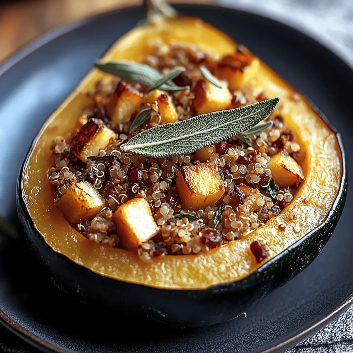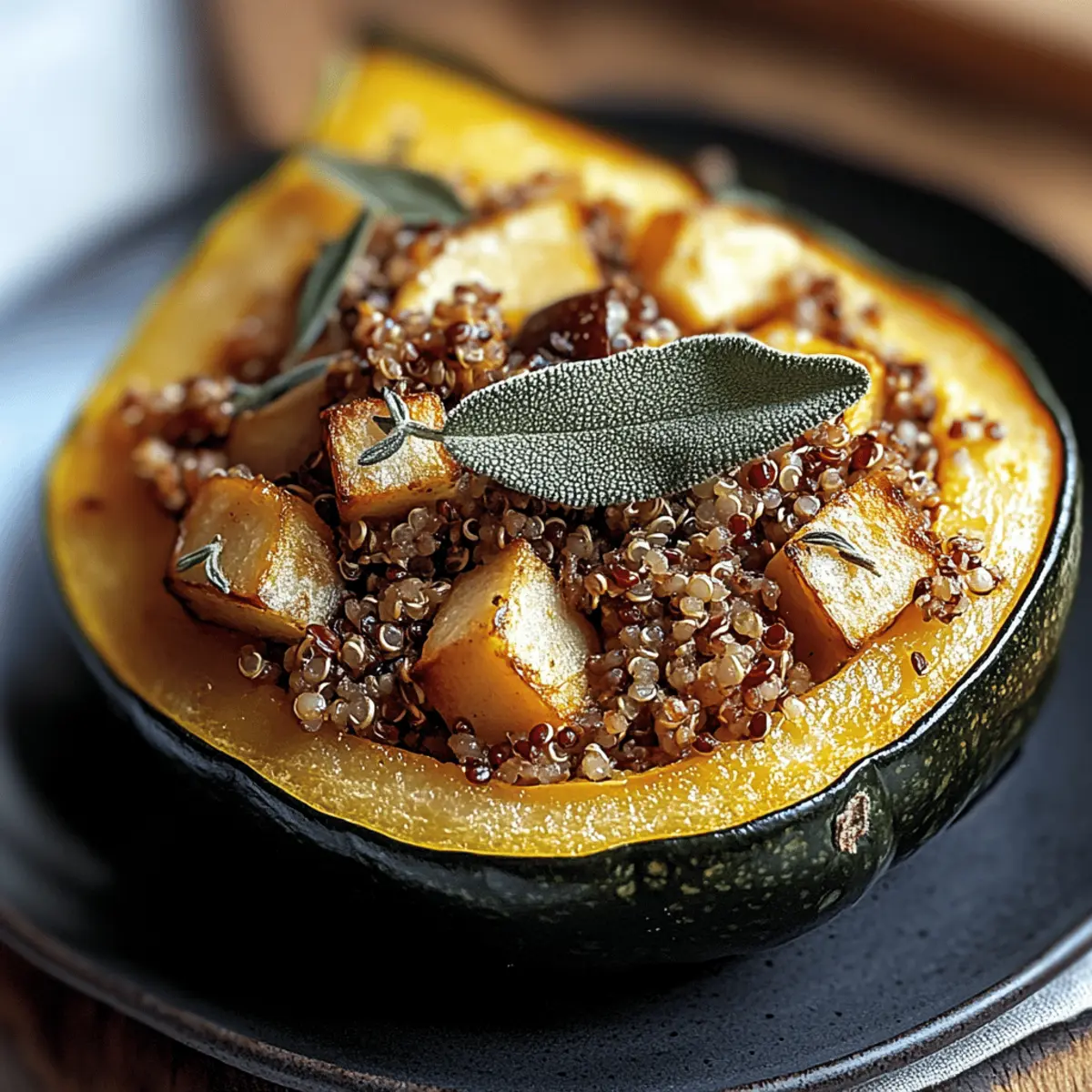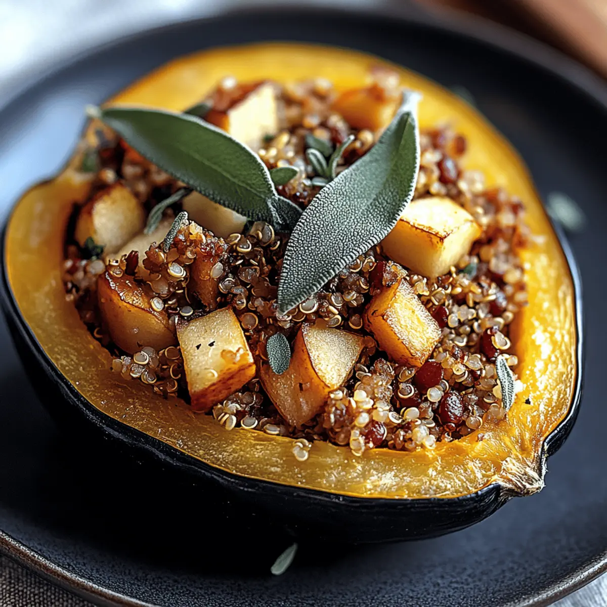 As I sliced into the golden acorn squash, the sweet, earthy aroma floated through the kitchen, whisking me away to cozy autumn nights. This Quinoa, Apple & Sage Stuffed Acorn Squash recipe captures the spirit of fall while effortlessly bridging the gap between healthy eating and comfort food. It’s naturally gluten-free and vegan, making it a heartwarming dish for everyone at the table. Not only does it provide a wholesome blend of flavors and nutrients, but its stunning presentation transforms a simple meal into a celebration of the season. Whether you’re planning a family gathering or a quiet dinner, this recipe is sure to impress and satisfy. Ready to fill your kitchen with the enticing scents of the harvest? Let’s dive into this delightful recipe! Why Choose This Stuffed Squash? Simplicity at Its Best: This recipe requires minimal prep, making it perfect for both novice cooks and seasoned chefs looking for a quick but impressive dish. Flavor Explosion: The harmonious blend of nutty quinoa, sweet apples, and fragrant sage creates a mouthwatering filling that captures the essence of fall in every bite. Nutritious and Wholesome: Packed with protein and fiber, this dish is a healthy option for any meal, ensuring satisfaction without the guilt. Stunning Presentation: Serve this gorgeous stuffed acorn squash as a centerpiece for your table, delighting guests with its vibrant colors and inviting aromas. Versatile Delight: Feel free to swap out ingredients based on what you have on hand; think brown rice or even a medley of seasonal veggies for a unique twist. Whether you’re looking to impress at a dinner party or simply enjoy a cozy meal at home, the Quinoa, Apple & Sage Stuffed Acorn Squash is sure to become a seasonal favorite! Quinoa, Apple & Sage Stuffed Acorn Squash Ingredients For the Squash Acorn Squash – The main vessel for this dish; opt for heavy, deep-colored ones. Olive Oil – For brushing and sautéing; adds richness and flavor to the filling. For the Filling Quinoa – Provides protein and texture; rinse before cooking to avoid bitterness. Onion – Brings sweetness and depth; use yellow or white for the best results. Garlic – Enhances aroma and flavor; can substitute with garlic powder if needed. Apple – Offers sweetness and texture; choose firm varieties like Granny Smith or Honeycrisp, or swap for pears. Sage – A fragrant herb that complements the filling; fresh is best, but dried works in a pinch. Salt and Pepper – Essential for seasoning; adjust to your taste preferences. Nuts/Dried Fruits (optional) – Adds crunch and flavor variety; consider walnuts, pecans, or raisins to enhance your stuffed acorn squash! With these flavorful ingredients gathered, you’re just steps away from creating a dish that not only satisfies your taste buds but also brings warmth and joy to the table! Step‑by‑Step Instructions for Quinoa, Apple & Sage Stuffed Acorn Squash Step 1: Prepare the Squash Begin by preheating your oven to 400°F (200°C). While it heats, carefully halve the acorn squash and scoop out the seeds. Brush the cut sides lightly with olive oil, enhancing their flavor. Place the squash halves cut-side down on a baking sheet lined with parchment paper. Roast in the oven for 30-40 minutes, until the squash is tender and caramelized, invitingly golden in hue. Step 2: Cook the Quinoa While the squash roasts, rinse 1 cup of quinoa thoroughly under cold water to eliminate any bitterness. In a medium saucepan, combine the rinsed quinoa with 2 cups of vegetable broth. Bring the mixture to a boil, then reduce the heat to low, covering the pot. Let it simmer for about 15 minutes, until the quinoa is fluffy and the liquid is absorbed, providing a hearty base for your filling. Step 3: Sauté the Aromatics In a skillet, heat a tablespoon of olive oil over medium heat. Once shimmering, add one diced onion and sauté for about 3-4 minutes until it becomes translucent. Next, mix in 2-3 minced garlic cloves, stirring for another minute until fragrant. Follow this by adding one diced apple and 1 tablespoon of fresh sage, cooking for 2-3 minutes until the apple softens and melds beautifully with the onion and garlic. Step 4: Combine the Filling In a large mixing bowl, combine the cooked quinoa with the sautéed onion, garlic, apple, and sage mixture. Season the filling generously with salt and pepper to taste, and consider adding optional nuts or dried fruits for extra texture and flavor. Gently mix everything together until well combined, allowing the flavors of the Quinoa, Apple & Sage Stuffed Acorn Squash to meld in harmony. Step 5: Stuff the Squash Retrieve the roasted acorn squash from the oven and carefully turn the halves cut-side up. Spoon the flavorful quinoa mixture generously into each half, packing it gently to fit. Aim for a mound that spills slightly over the edge, creating a delightful presentation. Return the stuffed squash to the oven and bake for an additional 10-15 minutes to heat through and enhance the earthy flavors. Step 6: Garnish and Serve Once your Quinoa, Apple & Sage Stuffed Acorn Squash is beautifully heated, remove it from the oven and let it cool slightly. Garnish the top with chopped fresh parsley or toasted nuts for an eye-catching finish. Serve the squash halves warm, either on their own or alongside a crisp green salad or roasted vegetables, creating a wholesome meal that celebrates the flavors of fall! Expert Tips for Quinoa, Apple & Sage Stuffed Acorn Squash Prep Ahead: You can prepare the squash and filling a day in advance. Assemble and bake just before serving for maximum freshness. Monitor Cooking Time: Keep an eye on both the squash and quinoa. Overcooking can lead to mushy quinoa and overly soft squash, stealing the dish’s delightful texture. Flavor Variations: Feel free to get creative! Swap out herbs or add different spices to the filling to personalize your Quinoa, Apple & Sage Stuffed Acorn Squash for varied flavor experienc