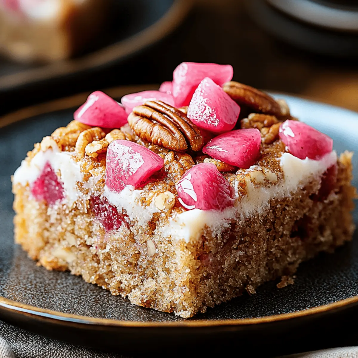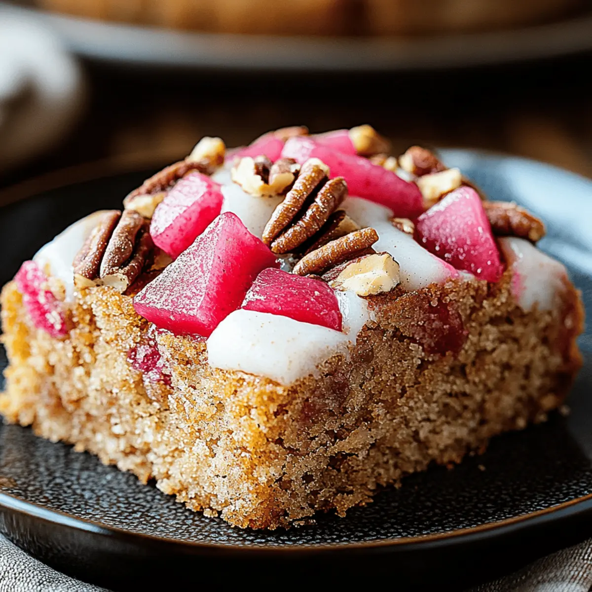 As the fresh burst of spring unfolds, I find myself drawn to the vibrant hues of garden rhubarb, and that’s how my Rhubarb Cinnamon Pecan Cake came to be. It’s more than just dessert; it’s a celebration of flavors that truly shines with its tangy rhubarb, aromatic cinnamon, and crunchy pecans. This cake isn’t just a treat for the senses; it’s quick to whip up and can easily cater to gluten-free diets, making it perfect for anyone tired of store-bought sweets. Picture an afternoon gathering or a cozy Sunday tea where this delightful cake takes center stage, filling the air with warmth and nostalgia. Ready to create something special that captures the essence of the season? Let’s dive in! Why is this cake a must-try? Deliciously unique: This Rhubarb Cinnamon Pecan Cake bursts with bold flavors that will captivate your taste buds! Simple steps: With just a few straightforward instructions, you’ll have an impressive dessert ready in no time. Seasonal delight: Embrace the freshness of spring with rhubarb, a favorite in seasonal baking. Crowd-pleasing: Perfect for gatherings, this cake is bound to be a hit among friends and family. Gluten-free option: Easily adaptable for gluten-free diets, so no one misses out on the fun! Whether paired with a scoop of vanilla ice cream or enjoyed on its own, you won’t regret making this delightful treat! Rhubarb Cinnamon Pecan Cake Ingredients • Prepare to create something special with these simple yet delightful ingredients for the Rhubarb Cinnamon Pecan Cake! For the Cake Fresh Rhubarb – Provides tanginess and moisture; wash and chop into ½ inch pieces for even distribution. Toasted Pecans – Adds flavor and crunch; toast lightly to enhance nuttiness. All-Purpose Flour – Offers structure; for a gluten-free option, substitute with a suitable baking blend. Baking Powder – Ensures the cake rises properly for a fluffy texture. Ground Cinnamon – Infuses warmth and spice to elevate the flavor profile. Salt – Balances flavor for a more harmonious taste. Unsalted Butter – Adds richness and moisture; cream until light and fluffy for best results. Granulated Sugar – Sweetens the cake, contributing to its delightful texture. Eggs – Provide structure and moisture; add each one separately to fully incorporate. Vanilla Extract – Enhances flavor depth, making every bite memorable. Milk/Buttermilk – Contributes to moisture; can be swapped for almond or oat milk for a dairy-free alternative. For Serving (Optional) Powdered Sugar – A delicious finishing touch that adds sweetness; can also serve with whipped cream or caramel sauce for indulgence. Get ready to bring your kitchen to life with this tantalizing Rhubarb Cinnamon Pecan Cake! Step‑by‑Step Instructions for Rhubarb Cinnamon Pecan Cake Step 1: Prepare Rhubarb and Pecans Begin by washing and chopping your fresh rhubarb into ½ inch pieces to ensure even distribution throughout the Rhubarb Cinnamon Pecan Cake. In a dry skillet over medium heat, toast the pecans for about 5-7 minutes, stirring frequently, until they’re fragrant and lightly browned, allowing their natural nuttiness to shine. Step 2: Mix Dry Ingredients In a large mixing bowl, whisk together the all-purpose flour, baking powder, ground cinnamon, and salt until well combined. This step not only combines the ingredients but also aerates the flour, ensuring your cake rises properly. Set aside the dry mixture, as it will join the wet ingredients in later steps. Step 3: Cream Butter and Sugar In a separate bowl, beat the unsalted butter and granulated sugar together using an electric mixer on medium speed for about 3-5 minutes, or until the mixture is light and fluffy. This process is crucial for creating a tender crumb in your Rhubarb Cinnamon Pecan Cake, so be sure to mix thoroughly. Step 4: Incorporate Eggs and Vanilla Add the eggs to the butter-sugar mixture one at a time, mixing well after each addition to ensure they are fully incorporated. After you’ve added all the eggs, pour in the vanilla extract and continue mixing for another minute, allowing these flavors to meld perfectly into your cake batter. Step 5: Combine Mixture Gradually add the dry ingredients to the wet mixture, alternating with the milk or buttermilk, beginning and ending with the dry ingredients. Mix gently until just combined, avoiding overmixing to maintain the cake’s tender texture. The batter should be smooth with some lumps from the flour remaining. Step 6: Fold in Extras Carefully fold in the chopped rhubarb and toasted pecans using a spatula, taking care not to overmix. This gentle incorporation ensures that the tangy rhubarb and crunchy pecans are evenly distributed without breaking down the batter’s structure, essential for the perfect Rhubarb Cinnamon Pecan Cake. Step 7: Bake Preheat your oven to 350°F (175°C) while pouring the cake batter into a greased 9-inch round cake pan. Bake in the preheated oven for 45-55 minutes, or until a toothpick inserted into the center comes out clean, indicating that the cake has set properly and is ready to be enjoyed. Step 8: Cool and Serve Once baked, remove the cake from the oven and let it cool in the pan for about 10 minutes before transferring it to a wire rack. Allow it to cool completely before slicing. For a beautiful finishing touch, dust the top with powdered sugar, and serve with whipped cream or caramel sauce if desired, creating a delightful experience for your guests. Rhubarb Cinnamon Pecan Cake Variations Feel free to customize this delightful cake to suit your taste buds and dietary needs! Nut Swap: Substitute pecans with walnuts, almonds, or hazelnuts for a different texture and flavor that still complements the cake beautifully. Cupcake Adaptation: Transform the batter into cupcakes; just reduce baking time to 20-25 minutes for bite-sized treats! Zesty Upgrade: For a bright twist, add lemon zest to the batter, enhancing the cake’s flavor profile with a refreshing citr
