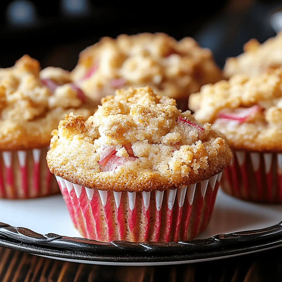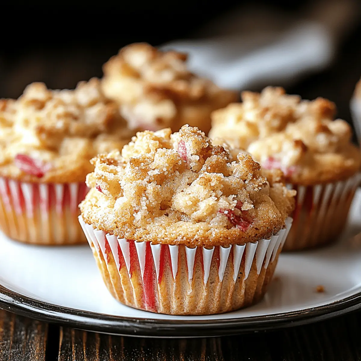 As the oven hums, the aroma of sweet buttery goodness begins to weave its way through the kitchen, creating a moment that feels like a warm embrace. Today, I’m excited to share my beloved recipe for Rhubarb Streusel Muffins, a delightful balance of tart rhubarb and a crunchy streusel topping. These muffins are not only incredibly easy to make, but their versatility makes them perfect for breakfast, brunch, or a satisfying snack anytime. Plus, you can easily customize them to suit your taste or dietary preferences! With each muffin boasting a moist texture and a tempting crumb topping, they’re bound to become a regular in your baking rotation. Curious to see how simple it is to whip these up? Let’s dive into the delicious details! Why are Rhubarb Streusel Muffins a must-try? Bold flavors: The combination of tart rhubarb and sweet, buttery streusel creates a deliciously balanced muffin that will elevate your breakfast or snack game. Easy baking: Even if you’re a beginner, this straightforward recipe requires minimal skills but delivers a stunning result you’ll be proud of. Customizable goodness: Feel free to mix in your favorite fruits or spices, or even switch to gluten-free for an adaptable treat that caters to everyone. Irresistible aroma: Baking these muffins fills your kitchen with an inviting fragrance that will have everyone asking what’s cooking! Perfect texture: Enjoy the contrast of a moist muffin cradled beneath a crunchy topping, making each bite a delightful experience. Pair them with a warm cup of coffee or tea for a cozy morning, or check out our other scrumptious recipes for more inspiration! Rhubarb Streusel Muffin Ingredients Get ready to bake these delightful treats! For the Muffin Batter • Fresh Rhubarb – Adds tartness and moisture; if unavailable, you can substitute with frozen rhubarb (thaw and drain excess moisture). • All-Purpose Flour – Provides structure and base for the muffins; can substitute with whole wheat or gluten-free flour for a different texture. • Granulated Sugar – Sweetens the batter and enhances flavor; consider reducing for less sweetness or using a sugar alternative. • Baking Powder – Acts as a leavening agent for a fluffy texture; ensure it’s fresh for best results. • Salt – Enhances overall flavor; sea salt or kosher salt are excellent alternatives. • Eggs – Contribute structure and moisture; you can replace with 1 tablespoon of flaxseed meal mixed with water for a vegan option. • Unsalted Butter – Adds richness and is key for a crumbly streusel; substitute with oil for a dairy-free option, but keep butter in the streusel for best texture. • Milk or Buttermilk – Moistens the batter and enhances flavor; use dairy-free milk for vegan muffins. • Vanilla Extract – Adds aromatic sweetness; a half teaspoon of almond extract can provide a unique flavor twist. For the Streusel Topping • Cold Butter – Must be cold to create the perfect crumble; warm butter will result in a doughy topping. • Granulated Sugar – Sweetens the streusel; can be adjusted based on your taste. • All-Purpose Flour – Combines with butter and sugar to achieve that delightful crumble—keeping it simple adds to the texture. Get ready to turn these ingredients into scrumptious Rhubarb Streusel Muffins that will brighten up your mornings! Step‑by‑Step Instructions for Rhubarb Streusel Muffins Step 1: Preheat and Prepare Begin by preheating your oven to 375°F (190°C). While the oven heats, prepare a muffin tin by placing paper liners in each cup or greasing them lightly with cooking spray. This step ensures that your delicious Rhubarb Streusel Muffins will release easily once baked, and it’s essential for achieving that perfect golden-brown finish. Step 2: Prepare the Rhubarb Wash and dice your fresh rhubarb into small, even pieces, approximately ½ inch in size. This will help ensure that each muffin is bursting with tart rhubarb flavor. Set the diced rhubarb aside, as it will be folded into the muffin batter later, adding a delightful tang to the final product. Step 3: Mix the Dry Ingredients In a large mixing bowl, combine the all-purpose flour, granulated sugar, baking powder, and salt together. Using a whisk, stir the dry ingredients until they are well blended and airy, which helps in creating a light muffin texture. This mixture serves as the base of your Rhubarb Streusel Muffins, ensuring they rise beautifully during baking. Step 4: Combine the Wet Ingredients In a separate bowl, beat the eggs until frothy, then add melted unsalted butter, milk, and vanilla extract. Whisk these ingredients together until they form a smooth, cohesive mixture. The wet ingredients are integral for binding everything together while also contributing moisture to the muffins, ensuring they don’t dry out. Step 5: Combine Wet and Dry Ingredients Gently fold the wet mixture into the dry ingredients using a spatula, taking care not to overmix. It’s perfectly fine if a few lumps remain; this will keep your Rhubarb Streusel Muffins light and tender! Once just combined, carefully fold in the diced rhubarb, ensuring even distribution throughout the batter. Step 6: Prepare the Streusel Topping In a small bowl, mix cold butter, granulated sugar, and all-purpose flour until the mixture resembles coarse crumbs. Use your fingers or a pastry cutter to achieve the desired crumble texture. This streusel topping adds a delightful crunch to your muffins, enhancing the contrast between the moist interior and the crisp top. Step 7: Fill Muffin Cups Divide the muffin batter evenly among the prepared muffin cups, filling each about three-quarters full to allow for rising. Top each muffin generously with the prepared streusel, ensuring each bite of your Rhubarb Streusel Muffins will be packed with flavor and texture. Step 8: Bake and Cool Place the muffin tin in the preheated oven and bake for 20-25 minutes, or until the muffins are golden brown and a 