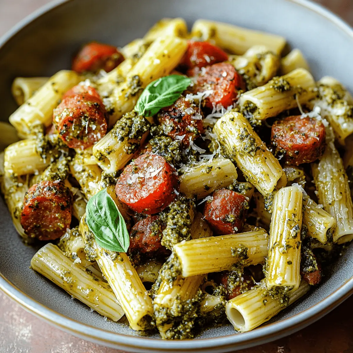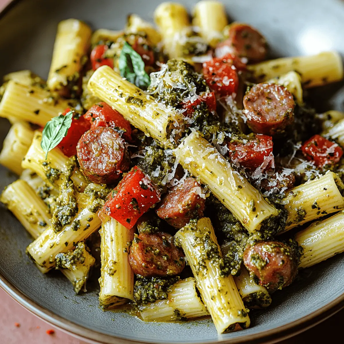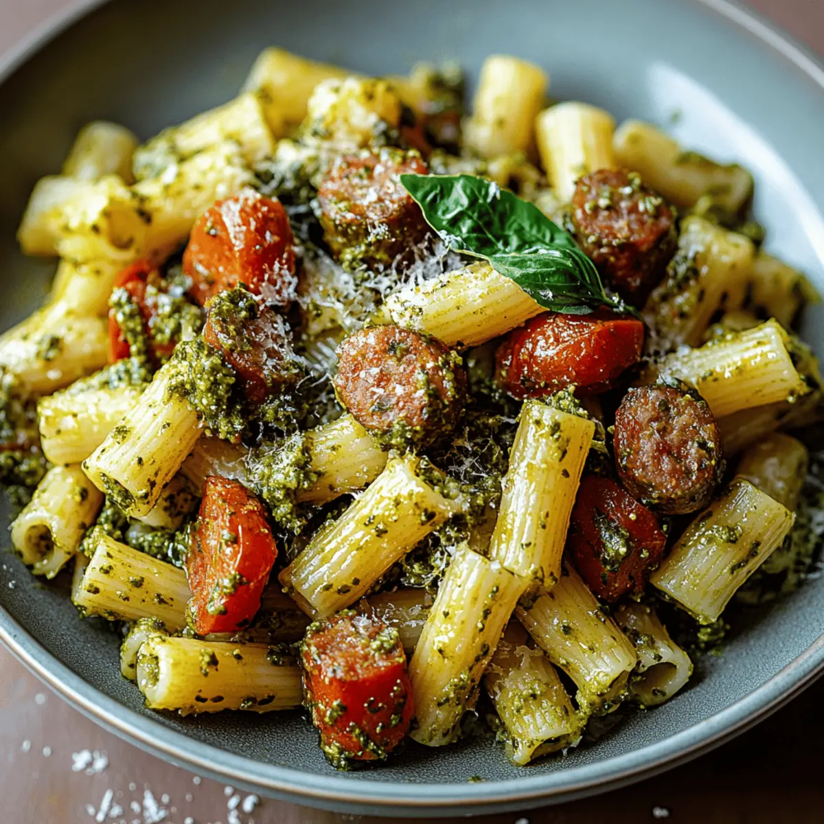 As I took in the aroma of sizzling sausage and fresh basil, a wave of nostalgia washed over me. This Easy Sausage Pesto Pasta is my go-to solution on those busy weeknights when I crave comfort food without endless prep. With just 30 minutes to spare, I can whip up a dish that marries savory sausage with vibrant basil pesto, making it a hearty meal everyone will love. It’s not only quick but also incredibly versatile, allowing for gluten-free options or a switch in sausage types based on your pantry. Plus, it’s a crowd-pleaser that brings everyone to the table! So, what’s your favorite twist on pasta dishes? Let’s dive into this savory delight together! Why is Sausage Pesto Pasta a Favorite? Simplicity: In just 30 minutes, you can create a dinner that feels gourmet without complicated techniques. Versatility: Feel free to swap out sausage types, like Italian or chorizo, or use gluten-free pasta, making it adaptable for everyone at your table. Savory Flavor: The combination of savory sausage, vibrant basil pesto, and fresh cherry tomatoes creates a delicious symphony of flavors that will leave your taste buds singing. Crowd-Pleaser: This recipe is perfect for family meals or dinner parties—everyone will be coming back for seconds! Pair it with a refreshing salad or some crispy garlic bread for a meal that impresses. Nostalgic Comfort: This pasta dish evokes warm, homey feelings, making it a beloved favorite in many households. Whether you’re looking for an easy weeknight meal or something special for guests, Orecchiette Pasta Sausage or Pasta Fagioli Soup are also fantastic choices to enjoy. Sausage Pesto Pasta Ingredients For the Pasta • Pasta – Opt for your favorite type, or substitute with gluten-free pasta for a lighter option. For the Sauce • Italian Sausage – This brings a hearty flavor; switch for chorizo or omit for a vegetarian version. • Basil Pesto – Use store-bought or whip up homemade for that vibrant herbaceous goodness. • Olive Oil – Essential for sautéing, enhancing the overall flavor profile. • Minced Garlic – Adds depth and an irresistible aroma to the dish. • Cherry Tomatoes – These provide freshness and sweetness; seasonal veggies can work too. For the Finish • Parmesan Cheese – Elevates the dish with umami; try nutritional yeast for a dairy-free option. • Fresh Basil – Use as a fragrant garnish to elevate the visual and flavor appeal. This delightful Sausage Pesto Pasta is sure to become a family favorite in no time! Step‑by‑Step Instructions for Easy Sausage Pesto Pasta Step 1: Cook Sausage In a large skillet, heat 2 tablespoons of olive oil over medium heat. Once the oil shimmers, add the Italian sausage, breaking it apart with a wooden spoon. Sauté for about 6-8 minutes, until the sausage turns golden brown and is cooked through. Stir occasionally to ensure even cooking and let the savory aroma fill your kitchen. Step 2: Boil Pasta While the sausage cooks, bring a large pot of salted water to a rolling boil. Add your favorite pasta, cooking according to the package directions until al dente, usually around 8-10 minutes. Before draining, reserve 1 cup of the starchy pasta water, then drain the remaining water. This will help create a silky sauce for your Sausage Pesto Pasta. Step 3: Add Aromatics After the sausage is browned, stir in 2-3 cloves of minced garlic and halved cherry tomatoes into the skillet. Cook for about 3-4 minutes, stirring gently until the tomatoes begin to soften and release their juices. The mixture will create a delicious base for your pasta, combining savory and vibrant flavors. Step 4: Combine Ingredients Once the tomatoes have softened, add the drained pasta to the skillet with the sausage mixture. Pour in the basil pesto and gently toss everything together to coat the pasta evenly. Gradually add the reserved pasta water, about ¼ cup at a time, stirring until you achieve your desired sauce consistency. Step 5: Finish & Serve Remove the skillet from heat and sprinkle the cooked Sausage Pesto Pasta with freshly grated Parmesan cheese. Season to taste with salt and pepper, allowing the cheese to melt slightly into the dish. Serve immediately, garnished with fresh basil leaves for an added touch of color and flavor, ensuring a heartwarming presentation for your meal. Make Ahead Options These Easy Sausage Pesto Pasta recipes are perfect for busy home cooks looking to save time during the week! You can prepare the sausage and garlic mixture up to 3 days in advance and store it in an airtight container in the refrigerator. Additionally, cook the pasta and toss it with a bit of olive oil to prevent sticking if you’re prepping it ahead of time. When you’re ready to serve, simply reheat the sausage mixture, add the cooked pasta, and stir in the basil pesto along with reserved pasta water to achieve that silky consistency. This way, you’ll have a delightful, home-cooked meal that stays just as delicious even when prepped ahead! Storage Tips for Sausage Pesto Pasta Fridge: Store leftovers in an airtight container for up to 3 days. Ensure the pasta has cooled to room temperature before sealing to maintain freshness. Freezer: Freeze Sausage Pesto Pasta without cheese for up to 1 month. Use freezer-safe containers, leaving some space for expansion. Reheating: To reheat, gently warm in a skillet over low heat with a splash of reserved pasta water or olive oil, stirring until heated through. PRO Tip: If you plan to freeze, consider separating fresh basil and cheese to add just before serving for the best flavor and presentation. Expert Tips for Sausage Pesto Pasta Pre-Cooked Sausage: Use pre-cooked sausage to cut down on time; just heat it through with the rest of the ingredients for an even quicker meal. Reserve Pasta Water: Always save at least 1 cup of pasta water before draining—this starchy liquid helps you achieve the perfect sauce consistency for your Sausage Pesto Pasta. Taste as You Go: Adjus