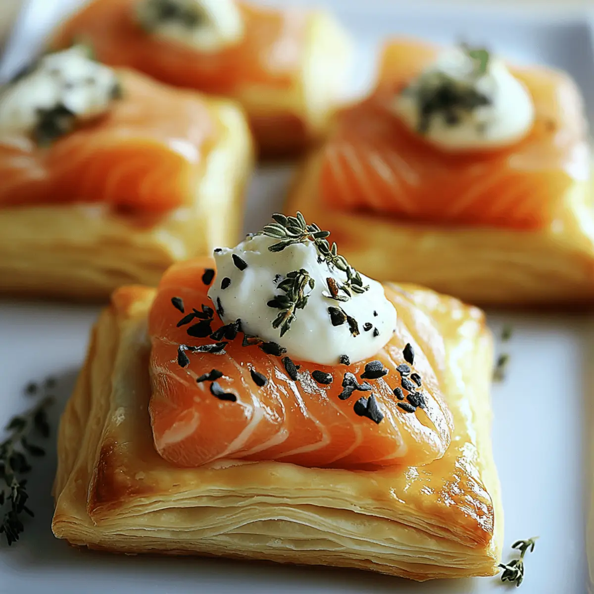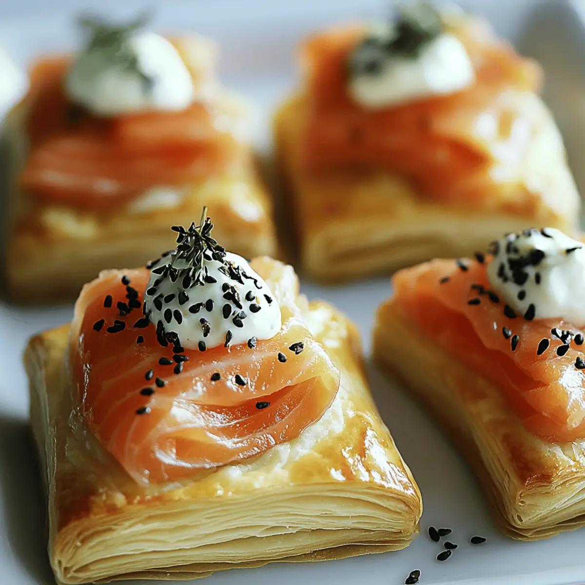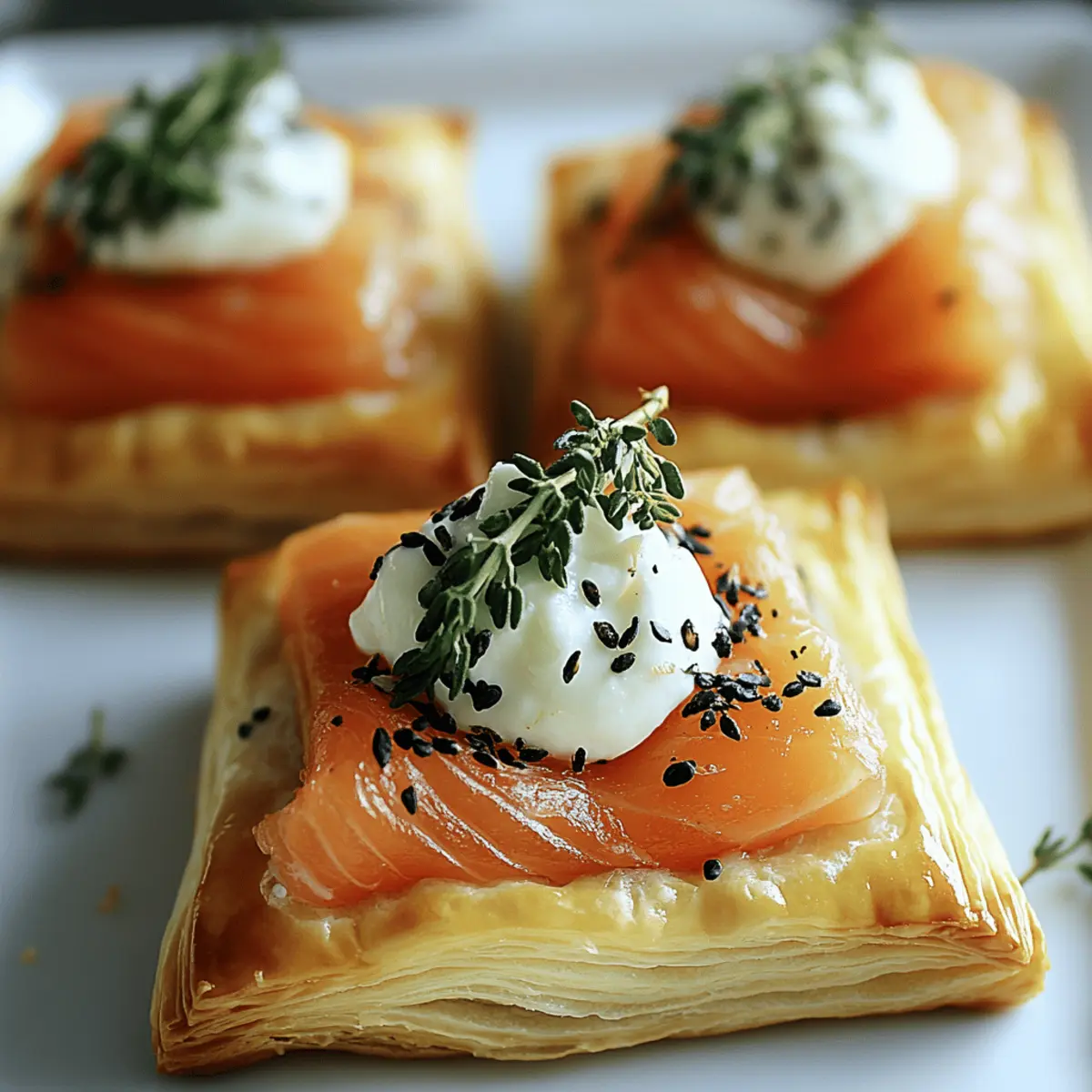 As I prepped for a recent gathering, I was hit by the delightful aroma of buttery pastry wafting through my kitchen. That’s when I knew I had to whip up my Elegant Smoked Salmon & Goat Cheese Puff Pastry. This recipe is not only a stunning show-stopper for any table, but it also offers a balance of smoky and creamy flavors that dazzle the palate. With its quick prep time and impressive presentation, it’s perfect for gatherings or those moments when you crave something extra special. Plus, you can easily switch up ingredients to suit your taste or dietary needs—try gluten-free puff pastry for a delicious twist! Curious about how to create this gourmet appetizer that’s bound to impress your guests? Let’s dive in! Why Choose Smoked Salmon & Goat Cheese Puff Pastry? Elegance on a Plate: This dish combines beautiful presentation with exquisite flavors, making it the perfect centerpiece for any gathering. Quick and Easy: With straightforward steps, you can impress guests in no time, preserving your precious time for socializing! Flavorful Fusion: The smoky salmon paired with tangy goat cheese creates an unforgettable harmony that your taste buds will thank you for. Versatile and Customizable: Feel free to switch out ingredients easily, whether you’re craving cream cheese or need a gluten-free option—this recipe adapts beautifully! Crowd-Pleasing Appeal: Every bite is a delight, ensuring everyone keeps coming back for more. Serve alongside a fresh salad or your favorite dips for an easy, balanced meal. Why wait? Make this stunning Smoked Salmon & Goat Cheese Puff Pastry your next go-to appetizer for any occasion! Smoked Salmon & Goat Cheese Puff Pastry Ingredients • Get ready to create this exquisite appetizer. For the Pastry Base Puff Pastry – A light and flaky foundation that holds all the deliciousness; ensure it’s thawed before rolling for best results. Egg Wash – This adds a beautiful golden, glossy finish to your pastry, enhancing its visual appeal. For the Filling Goat Cheese – Brings a creamy, tangy richness; for a milder flavor, consider using cream cheese as a substitute. Smoked Salmon – The star of this dish, delivering a rich, smoky flavor that complements the cheese perfectly—use fresh or properly thawed. Lemon Zest – Adds a bright, citrusy note that enhances the overall flavor balance. Herbs and Seasoning Fresh Herbs (e.g., Dill, Chives) – Provides freshness that cuts through the richness; feel free to experiment with your favorites. Black Pepper – A simple seasoning that adds an extra layer of flavor without overwhelming the ingredients. Explore the magic of creating this Smoked Salmon & Goat Cheese Puff Pastry and see how effortlessly it transforms your dining experience! Step‑by‑Step Instructions for Smoked Salmon & Goat Cheese Puff Pastry Step 1: Prepare Puff Pastry Begin by thawing the puff pastry, allowing it to reach room temperature for about 30 minutes. Once thawed, lightly flour your work surface and roll out the pastry into a rectangle, roughly ¼ inch thick. This will ensure a light and flaky finish. Keep an eye on the edges; they should be smooth and even to form a perfect base for your Smoked Salmon & Goat Cheese Puff Pastry. Step 2: Mix the Filling In a medium bowl, soften the goat cheese with a spatula, ensuring it becomes creamy and spreadable. Mix in your choice of fresh herbs, lemon zest, and a sprinkle of black pepper until well combined. This is where the flavor starts to blossom! You want a harmonious blend of tangy and fresh flavors that will complement the smoked salmon beautifully. Step 3: Assemble the Pastry Lay the rolled-out puff pastry flat on your baking sheet lined with parchment paper. Spread the creamy goat cheese mixture evenly over the pastry, leaving a little border around the edges. Next, layer the smoked salmon elegantly on top of the cheese, arranging it in a way that will impress your guests. If desired, sprinkle extra herbs over the salmon for added freshness and flavor. Step 4: Shape the Pastry Carefully fold or roll the puff pastry, sealing the edges tightly to prevent any filling from leaking during baking. Pinch the seams together, and if you prefer, use a fork to crimp the edges for a decorative touch. The goal is to create a secure envelope for the delicious Smoked Salmon & Goat Cheese filling. Step 5: Bake to Perfection Preheat your oven to 400°F (200°C). Brush the surface of your assembled puff pastry with egg wash to achieve a beautiful golden finish. Bake in the preheated oven for 15-20 minutes, or until the pastry is puffed up and a delightful golden brown. Keep an eye on it; the visual cue to look for is the flaky layers and a stunning color that signals it’s ready to come out. Step 6: Garnish and Serve Once your Smoked Salmon & Goat Cheese Puff Pastry is baked to perfection, take it out of the oven and let it cool for a few minutes. For an elegant finishing touch, garnish with fresh dill and lemon wedges. Slice into bite-sized pieces for serving, presenting a delightful appetizer that’s ready to impress at your next gathering! How to Store and Freeze Smoked Salmon & Goat Cheese Puff Pastry Fridge: Store leftover puff pastry in an airtight container for up to 2 days. This helps maintain its flavor and freshness while keeping the pastry from becoming stale. Freezer: If you plan to make ahead, unbaked puff pastry can be tightly wrapped and frozen for up to 1 month. Bake directly from frozen, adding a few extra minutes to the cooking time for perfect results. Reheating: For the best texture, reheat baked leftovers in a preheated oven rather than a microwave. This will keep the pastry crispy and delicious. Assembly Tips: If you assemble the Smoked Salmon & Goat Cheese Puff Pastry ahead of time, store it in the fridge before baking. This makes for easy preparation right before your gathering! Make Ahead Options These Smoked Salmon & Goat Cheese Puff Pastry bites are a fantastic option for m