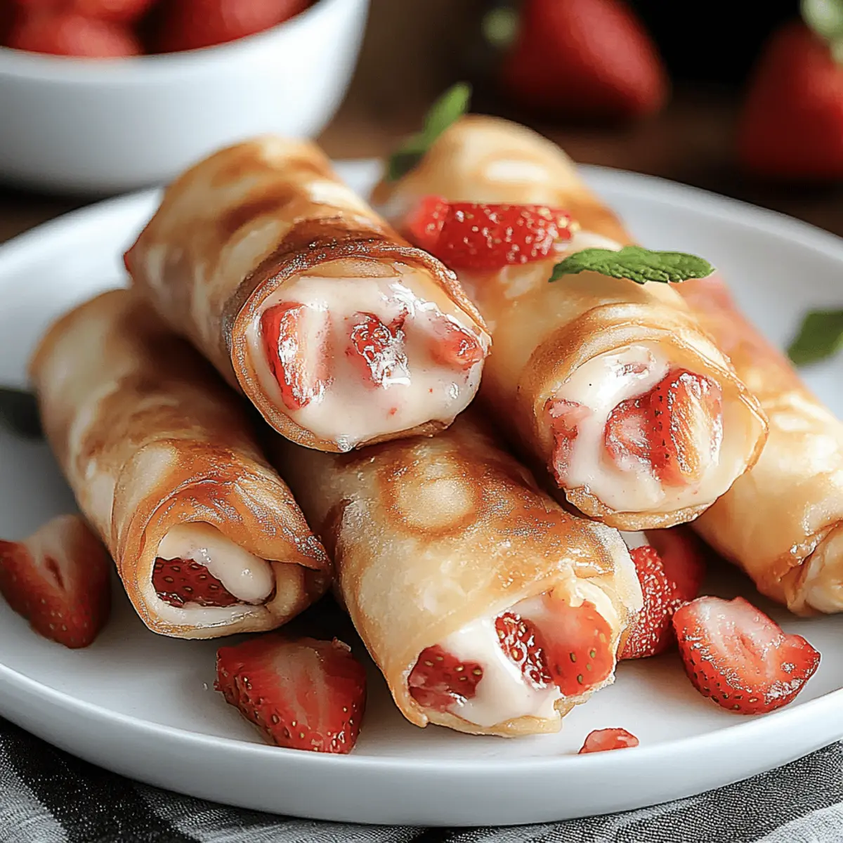 As I stood in my kitchen one sunny afternoon, the scent of strawberries wafted through the air, instantly lifting my spirits. That’s when I decided to put a fun twist on a classic favorite and created these delightful Strawberry Cheesecake Egg Rolls. Not only are they a quick dessert that whisks together effortlessly in just 25 minutes, but they also take traditional cheesecake to a whole new level with their crispy, golden outside and luscious, creamy filling. Perfect for impressing guests or satisfying a sweet tooth on a cozy night in, these egg rolls cater to everyone’s cravings without the fuss. Plus, with a gluten-free option available, no one has to miss out on this delicious treat! Curious about how to craft this unique dessert that will surely steal the spotlight? Let’s roll up our sleeves and dive into this scrumptious adventure! Why are Strawberry Cheesecake Egg Rolls irresistible? Crispy Delight: The combination of warm, crispy egg roll wrappers with a creamy cheesecake filling creates a mouthwatering experience that contrasts beautifully in every bite. Quick Preparation: In just 25 minutes, you can whip up this easy dessert, making it perfect for last-minute gatherings or satisfying late-night cravings. Versatile Flavors: While strawberries shine here, feel free to experiment with other fruits or add-ins like chocolate chips, tailoring the recipe to your taste. Crowd-Pleasing Treat: These egg rolls are bound to impress friends and family at any gathering, turning dessert into a festive affair! Gluten-Free Option: Easily adapt the recipe with gluten-free wrappers, ensuring everyone can enjoy this delightful dessert. For more delicious variations, check out my section on variation ideas. Strawberry Cheesecake Egg Rolls Ingredients For the Filling Cream Cheese – Adds a creamy texture essential for the cheesecake flavor; make sure it’s softened for easy blending. Sugar – Sweetens the filling to balance the strawberries’ tang; try substituting with honey for a natural sweetness. Vanilla Extract – Elevates the overall taste of your filling; pure vanilla is recommended for richer flavor. Strawberries – Provide a fruity punch and natural sweetness; fresh strawberries are best, but thawed frozen ones work too. For the Wrapping Egg Roll Wrappers – Create that crispy exterior; you can use spring roll wrappers or gluten-free options to cater to dietary needs. Oil or Butter – Essential for frying, achieving that perfect golden crisp; feel free to use healthier oil alternatives if desired. For the Finishing Touch Powdered Sugar – Adds a lovely sweet dusting before serving, making each bite even more enticing. Chocolate/Sauces – Optional drizzles like chocolate or strawberry sauce add extra flavor and visual appeal to your egg rolls. Now that you have all the delicious ingredients ready, let’s move on to crafting these delightful Strawberry Cheesecake Egg Rolls! Step‑by‑Step Instructions for Strawberry Cheesecake Egg Rolls Step 1: Prepare the Filling In a mixing bowl, blend together 8 oz of softened cream cheese, 1/4 cup of sugar, and 1 teaspoon of vanilla extract until smooth and creamy, about 2-3 minutes. Once your mixture is well combined, gently fold in 1 cup of diced strawberries, being careful not to crush them. This luscious filling will be the heart of your Strawberry Cheesecake Egg Rolls, providing the perfect balance of sweetness and fruitiness. Step 2: Wrap the Egg Rolls Take an egg roll wrapper and lay it flat on a clean surface, with one corner pointing towards you. Spoon 2 tablespoons of the cheesecake filling into the center and fold the bottom corner over the filling. Then, fold the sides in tightly and roll up to seal it securely. Use a dab of water on the edges to ensure they stick. Repeat this process until you’ve wrapped all your filling in the egg rolls, creating delightful bundles. Step 3: Fry the Egg Rolls In a large skillet, heat enough oil or butter over medium heat until it reaches about 350°F (175°C), shimmering but not smoking. Carefully place the wrapped egg rolls in the hot oil, frying for 2-3 minutes per side until they turn golden brown and crispy. Use tongs to turn them gently, allowing for an even cook. The sight of the crispy golden exterior will let you know it’s time to remove them from the oil. Step 4: Cool & Serve Once fried, transfer the Strawberry Cheesecake Egg Rolls to a plate lined with paper towels to drain any excess oil. Allow them to cool slightly for about 3 minutes; this enhances their crispiness. Before serving, dust with powdered sugar for an elegant finish, and consider drizzling with chocolate or strawberry sauce for extra decadence. These egg rolls are now ready to impress your guests or satisfy your cravings! Make Ahead Options These Strawberry Cheesecake Egg Rolls are perfect for meal prep enthusiasts looking to save time during busy weeknights! You can assemble the egg rolls and freeze them un-fried for up to 3 months. Just lay them in a single layer on a baking sheet until frozen solid, then transfer to a freezer bag. When you’re ready to satisfy that sweet craving, fry them directly from frozen, adding a couple of extra minutes to the cooking time. This ensures they stay just as deliciously crispy on the outside while the cheesecake filling remains creamy inside. Enjoy the convenience of having a quick dessert ready to go, transforming last-minute gatherings into delightful occasions! How to Store and Freeze Strawberry Cheesecake Egg Rolls Fridge: Store any leftover Strawberry Cheesecake Egg Rolls in an airtight container in the refrigerator for up to 2 days. This keeps them fresh and ready for a sweet snack. Freezer: To freeze, wrap un-fried egg rolls tightly in plastic wrap and place them in a freezer-safe bag or container. They can be stored for up to 3 months. Reheating: When ready to enjoy, fry directly from frozen, adding an extra couple of minutes for cooking time. Alternatively, bake 