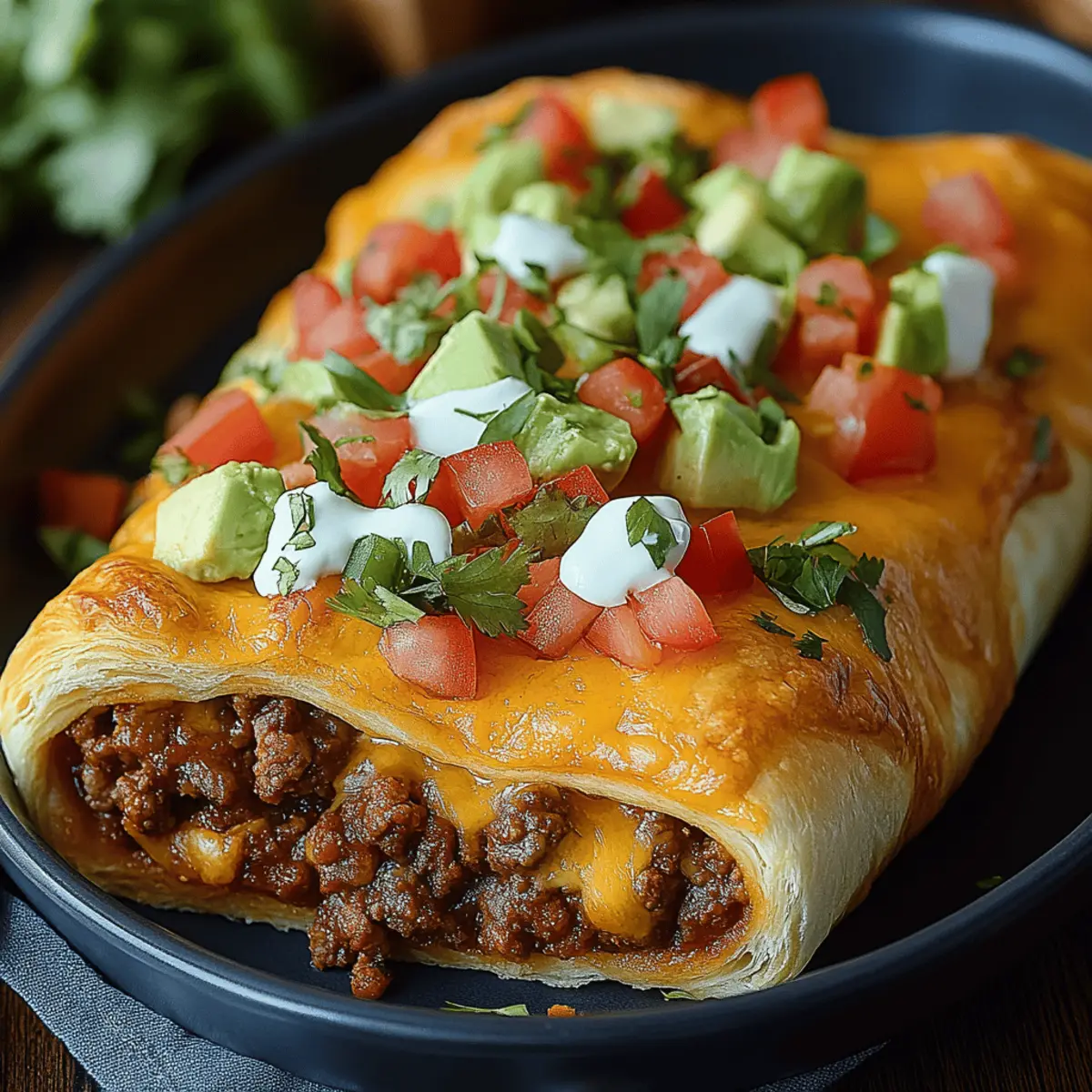 Once baked, remove your Taco Crescent Roll Bake from the oven and let it cool for a few minutes. Top it with fresh cilantro or green onions for a burst of color and flavor. Serve warm, and consider adding a dollop of sour cream or a squeeze of lime juice for a delightful finishing touch to this family-friendly dish.
