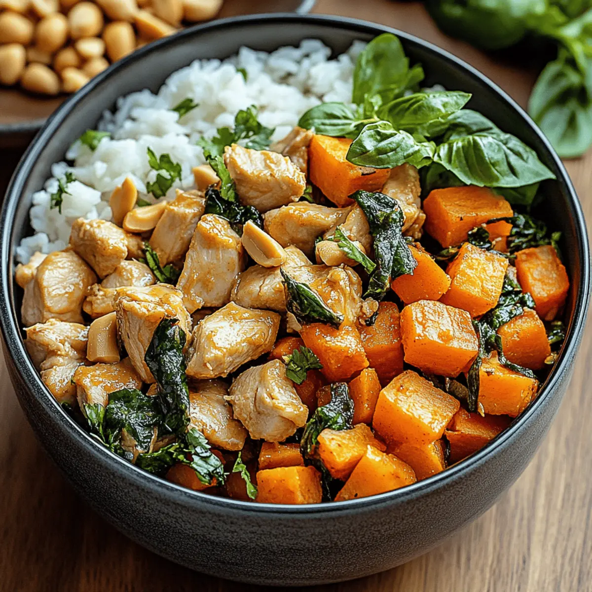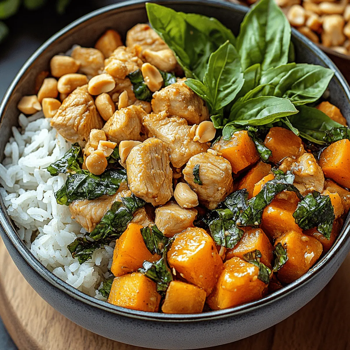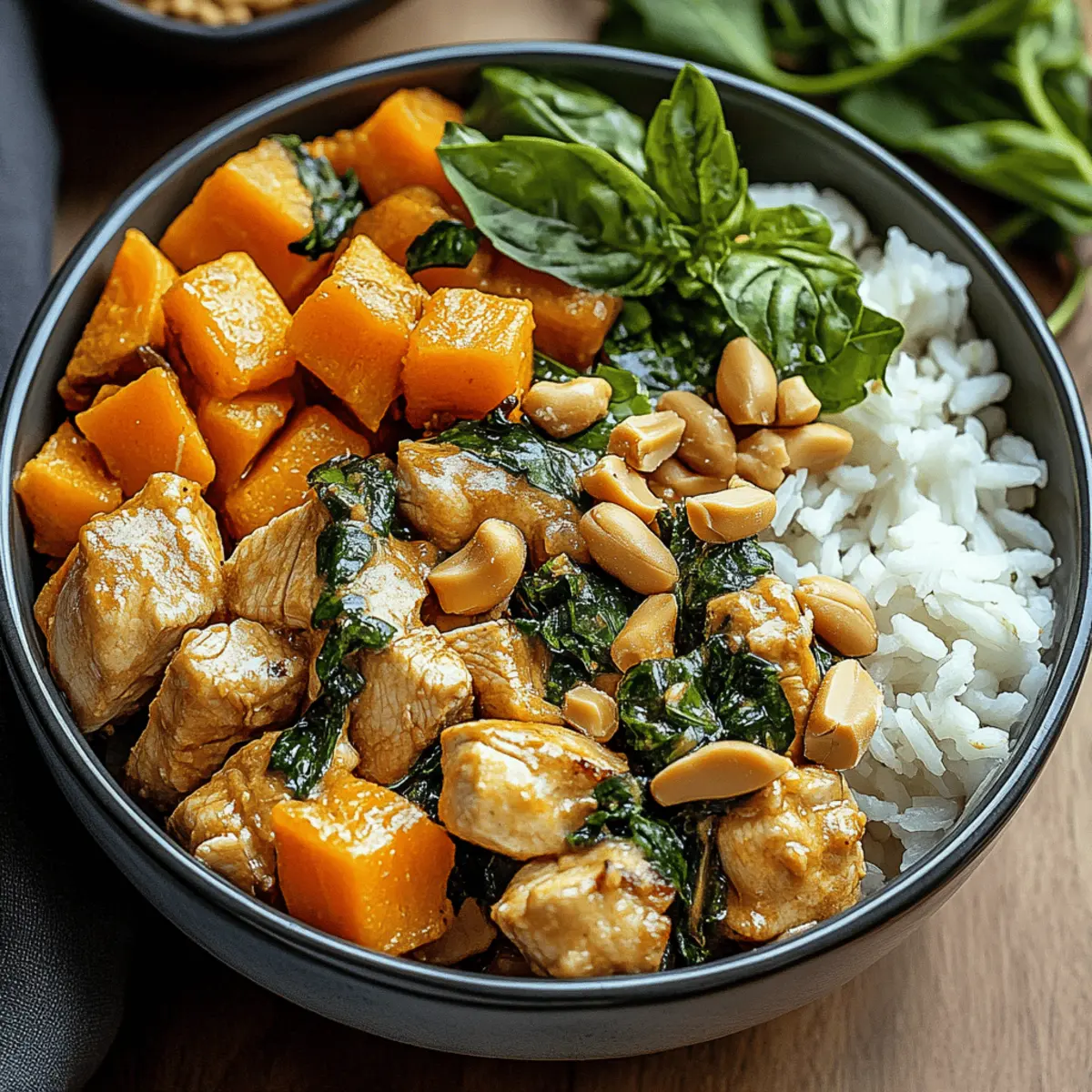 As I stirred the creamy peanut sauce, a rush of nostalgia hit me—like a warm afternoon in a vibrant Thai market filled with aromatic spice stalls and colorful produce. That’s the kind of heartwarming experience you can create right in your own kitchen with these Thai Chicken Sweet Potato Peanut Bowls. This recipe is not just another meal; it’s a delicious, quick-prep delight that brings together juicy chicken, caramelized sweet potatoes, and a rich, savory sauce that everyone will love. Plus, the flexibility of this dish means you can easily customize it to suit your taste and dietary needs, making it perfect for busy weeknights or meal prep sessions. Are you ready to dive into this wholesome recipe that’s bound to impress? Let’s get cooking! Why Make Thai Chicken Sweet Potato Bowls? Nutritious and Wholesome: This dish is loaded with vitamins, protein, and fiber, making it not only filling but also a perfect addition to your balanced diet. Versatile Ingredients: Easily swap in seasonal vegetables or proteins, such as tofu or chickpeas, for a custom culinary adventure. Quick Meal Prep: With only a few simple steps, you’ll have a delicious meal ready in less than 30 minutes—ideal for busy weeknights! Flavor Explosion: The rich blend of creamy peanut sauce and roasted sweet potatoes creates an unforgettable flavor profile that’s sure to delight your taste buds. Crowd-Pleaser: Serve it at dinner parties or meal prep it for the whole week—the vibrant colors and textures will impress family and friends alike! Thai Chicken Sweet Potato Peanut Bowls Ingredients For the Bowl Sweet Potatoes – Add sweetness and substance; substitute with butternut squash for a similar texture. Chicken – Provides protein; use tofu for a vegetarian option or chickpeas for a plant-based alternative. Rice – Serves as the base; brown rice, quinoa, or cauliflower rice are great low-carb options. For the Peanut Sauce Peanut Butter – Creates the creamy peanut sauce; almond or cashew butter can be substituted, but adjust seasoning for taste. Coconut Milk – Adds creaminess; regular milk or almond milk can be used but may alter the flavor slightly. Soy Sauce – Enhances savory depth; use tamari for gluten-free or coconut aminos for a lighter option. Garlic – Provides aromatic depth; fresh garlic is preferred, but powdered garlic can work in a pinch. Ginger – Adds a warm, zesty flavor; fresh ginger adds more oomph, though powdered may suffice if needed. Lime Juice – Brightens flavors; lemon juice can serve as a substitute. Chili Flakes/Sriracha – Adds heat; adjust to taste based on spice preferences. For Garnishing Cilantro – Offers a fresh, herbaceous touch; omit if not preferred. Green Onions – Provide a mild onion flavor; optional but recommended for garnish. Step‑by‑Step Instructions for Thai Chicken Sweet Potato Peanut Bowls Step 1: Prepare Sweet Potatoes Preheat your oven to 425°F (220°C). Peel and dice the sweet potatoes into bite-sized pieces, ensuring they are uniform for even cooking. In a large bowl, toss the sweet potato cubes with olive oil, salt, and pepper until well-coated. Spread them out in a single layer on a baking sheet and roast for 20-25 minutes, or until they are golden brown and tender when pierced with a fork. Step 2: Cook Chicken While the sweet potatoes are roasting, slice the chicken breast into bite-sized pieces. Heat a skillet over medium-high heat and add a splash of olive oil. Once the oil is hot, add the chicken pieces, seasoning them with salt and pepper. Cook for about 5-7 minutes, stirring occasionally, until the chicken is golden brown and cooked through. Remove the skillet from heat and set the chicken aside. Step 3: Make Peanut Sauce In a medium bowl, combine the creamy peanut butter, coconut milk, soy sauce, minced garlic, ginger, lime juice, and a sprinkle of chili flakes or Sriracha. Whisk these ingredients together until the mixture is smooth and creamy, adjusting the consistency with a little water if necessary. Set the peanut sauce aside for easy drizzling later in your Thai Chicken Sweet Potato Peanut Bowls. Step 4: Assemble Bowls Once the sweet potatoes are done roasting and the chicken is cooked, it’s time to assemble your bowls. Start by distributing your choice of cooked rice evenly among serving bowls. Layer generous amounts of roasted sweet potatoes and cooked chicken atop the rice. Drizzle the flavorful peanut sauce over each bowl, ensuring every bite will be packed with flavor. Step 5: Serve To finish, garnish each bowl with freshly chopped cilantro and green onions for a pop of color and additional flavor. Serve these delightful Thai Chicken Sweet Potato Peanut Bowls right away while the components are warm, and enjoy this vibrant meal with optional sides like cucumber salad or pickled carrots for an extra refreshing touch. What to Serve with Thai Chicken Sweet Potato Peanut Bowls Elevate your meal experience by pairing these vibrant bowls with delicious side dishes that create a balanced feast. Cucumber Salad: Refreshing and crunchy, cucumber salad offers a cool contrast to the warm and hearty bowls, enhancing your dining experience. Pickled Carrots: The tanginess of pickled carrots adds a delightful zing to each bite, balancing the rich peanut sauce beautifully. Steamed Greens: Lightly steamed bok choy or broccoli introduces a healthy, tender crunch, adding both nutrients and color to your plate. Quinoa Salad: A protein-packed quinoa salad with herbs and lemon creates a zesty companion that harmonizes well with the sweet and savory notes. Mango Slices: Sweet, juicy mango slices provide a tropical burst of flavor that complements the savory goodness of the bowls perfectly. Chili-Lime Roasted Chickpeas: Crispy and spicy roasted chickpeas create a satisfying crunch, inviting diverse textures that echo the bowls’ creaminess. Herbed Rice: An aromatic herbed rice will infuse your meal with a fragrant touch, enhancing the over