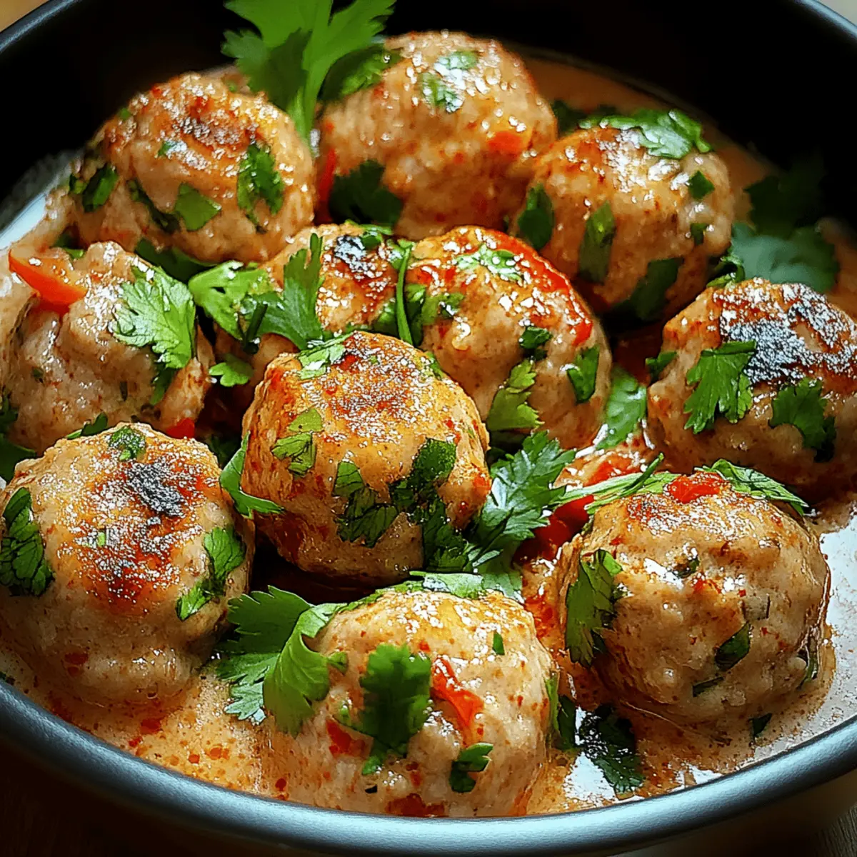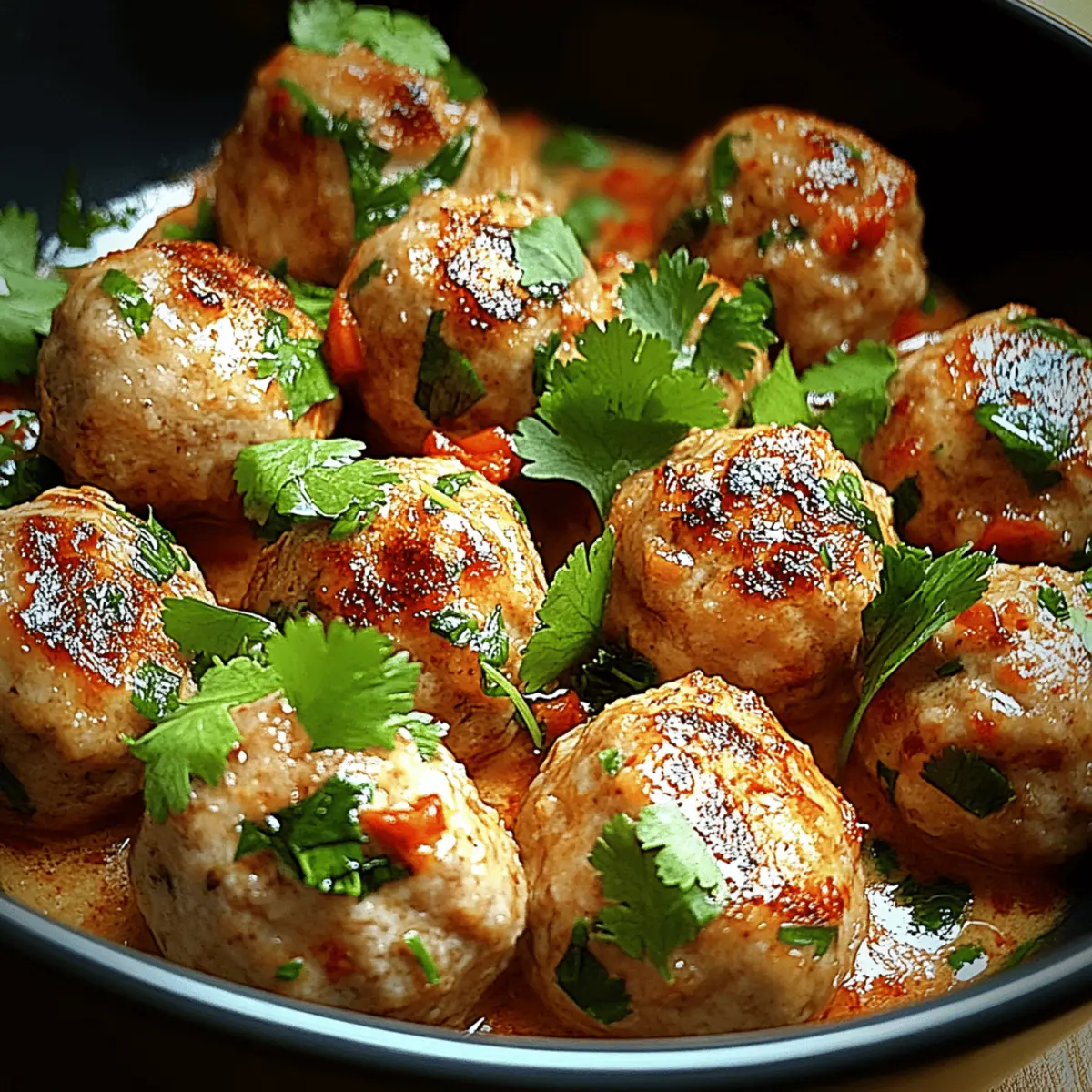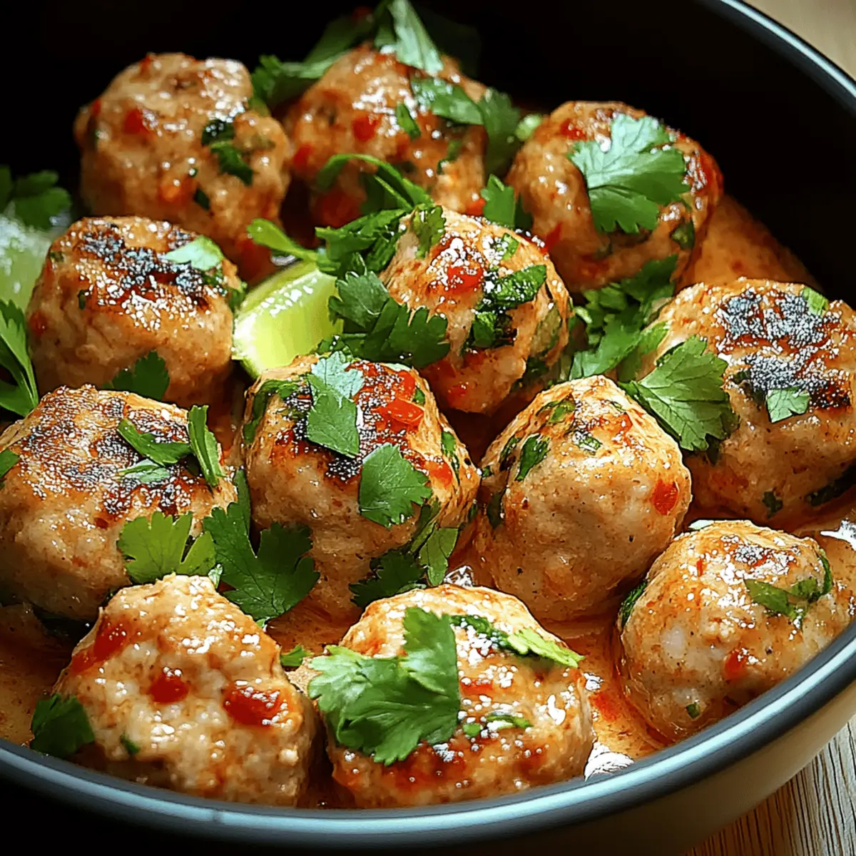 As I stood in the kitchen, the tantalizing aroma of garlic and ginger wafted through the air, instantly whisking me away to the bustling streets of Thailand. This Easy Thai Turkey Meatballs recipe is not just a meal; it’s a passport to a world of flavor that combines lean ground turkey with vibrant Thai spices and fresh herbs. In just 30 minutes, you can have a satisfying dish that’s not only gluten-free but also customizable to fit any dietary preference. Whether you’re looking for a quick weeknight dinner or a show-stopping appetizer for your next gathering, these meatballs are bound to impress without the fuss. So, why stick with takeout when you can create mouthwatering Thai-inspired goodness right at home? Ready to roll up your sleeves and dive into these delightful bites? Why are Thai Turkey Meatballs a must-try? Bold flavors: The combination of aromatic garlic, zesty ginger, and vibrant lime creates a flavor explosion that will transport your taste buds to Thailand. Quick and easy: With only 30 minutes needed from prep to plate, these meatballs are perfect for busy weeknights or last-minute gatherings. Versatile: Easily customize the spice level by adjusting the chili flakes or swap out ingredients to cater to dietary preferences, ensuring everyone enjoys! Crowd-pleaser: Serve these meatballs as an appetizer or pair them with jasmine rice for a complete meal; they’re sure to impress guests and family alike. Feel free to enhance your meal further with fresh sides or sauces. If you’re looking for serving ideas, check out the serving suggestions. Thai Turkey Meatballs Ingredients For the Meatballs Ground Turkey – The lean protein base, perfect for a healthy dish; substitute with ground chicken for a lighter option. Garlic – Adds wonderful aromatic depth; use fresh minced for the best flavor. Fresh Ginger – Provides a warm zing; in a pinch, ground ginger works as a suitable alternative. Green Onions – Contributes freshness and crunch; chives can be used if green onions are unavailable. Breadcrumbs – Essential for binding the meatballs; opt for gluten-free breadcrumbs to keep the dish gluten-free. Egg – Acts as a binding agent; a flax egg is a great substitute for a vegan option. Fish Sauce – Delivers umami and authenticity; use soy sauce or tamari for a vegetarian alternative. Lime Zest and Juice – Adds brightness and a refreshing tang; fresh lime is always recommended for maximum flavor. Chili Flakes – Introduces the spice levels; adjust the quantity based on your preference to control heat. Chopped Cilantro – Offers a fresh, herbal note; Thai basil can be used for a different flavor profile. For Garnishing Cilantro – Enhances the freshness; sprinkle it liberally before serving for an extra touch. Green Onions – Adds a pop of color and flavor; use chopped for garnish. Lime Wedges – Squeeze over for an extra burst of flavor; they are perfect for brightening the dish. These Thai Turkey Meatballs are a delightful addition to any meal, offering endless possibilities for customization and flavor! Step‑by‑Step Instructions for Easy Thai Turkey Meatballs Step 1: Prepare the Mixture In a large mixing bowl, combine the ground turkey, minced garlic, grated ginger, chopped green onions, breadcrumbs, egg, fish sauce, lime zest, lime juice, chili flakes, and cilantro. Use your hands to gently mix the ingredients until just combined, taking care not to overmix, which can make the meatballs tough. The mixture should be slightly sticky and well-blended, inviting that perfect flavor fusion for your Thai Turkey Meatballs. Step 2: Form the Meatballs Lightly dampen your hands with water to prevent sticking, then scoop about 1 to 1.5 tablespoons of the mixture. Roll it into neat balls, ensuring they are compact but not overly pressed. Place each meatball on a baking sheet lined with parchment paper, leaving space between them for even cooking. You should have a nice, shiny surface on each meatball, ready to be cooked to perfection. Step 3: Heat the Skillet In a large skillet, heat a couple of tablespoons of coconut or vegetable oil over medium heat. Allow the oil to warm for about 2 minutes until shimmering, indicating it’s ready for frying. This heated oil is crucial for achieving those golden-brown, crispy edges on your Easy Thai Turkey Meatballs, enhancing their mouthwatering appeal. Step 4: Cook the Meatballs Carefully add the meatballs to the skillet in batches, making sure not to overcrowd the pan. Cook for 5 to 7 minutes, turning them occasionally to ensure a uniform golden color on all sides. Use a pair of tongs to gently rotate them halfway through. The meatballs should reach an internal temperature of 165°F (74°C), ensuring they are fully cooked and juicy. Step 5: Drain and Garnish Once cooked, remove the meatballs from the skillet and let them drain on a plate lined with paper towels to absorb any excess oil. This step keeps your Easy Thai Turkey Meatballs light and delightful. Before serving, sprinkle them with fresh cilantro, sliced green onions, or a squeeze of lime for an added burst of flavor that complements their zesty profile! Storage Tips for Thai Turkey Meatballs Fridge: Store cooked Thai Turkey Meatballs in an airtight container for up to 3 days to maintain their freshness and flavor. Freezer: Freeze uncooked meatballs for up to 3 months—place them on a baking sheet to freeze individually before transferring to a freezer-safe bag. Reheating: To reheat cooked meatballs, warm them in a skillet over medium heat for about 5 minutes or microwave in 30-second intervals until heated through. Thawing: When ready to enjoy frozen meatballs, thaw in the fridge overnight for best results, then cook as directed. Thai Turkey Meatballs Variations Feel free to unleash your creativity and customize these Thai Turkey Meatballs to suit your tastes and dietary needs! Chicken Option: Swap ground turkey for ground chicken for a different yet delicious flavor 