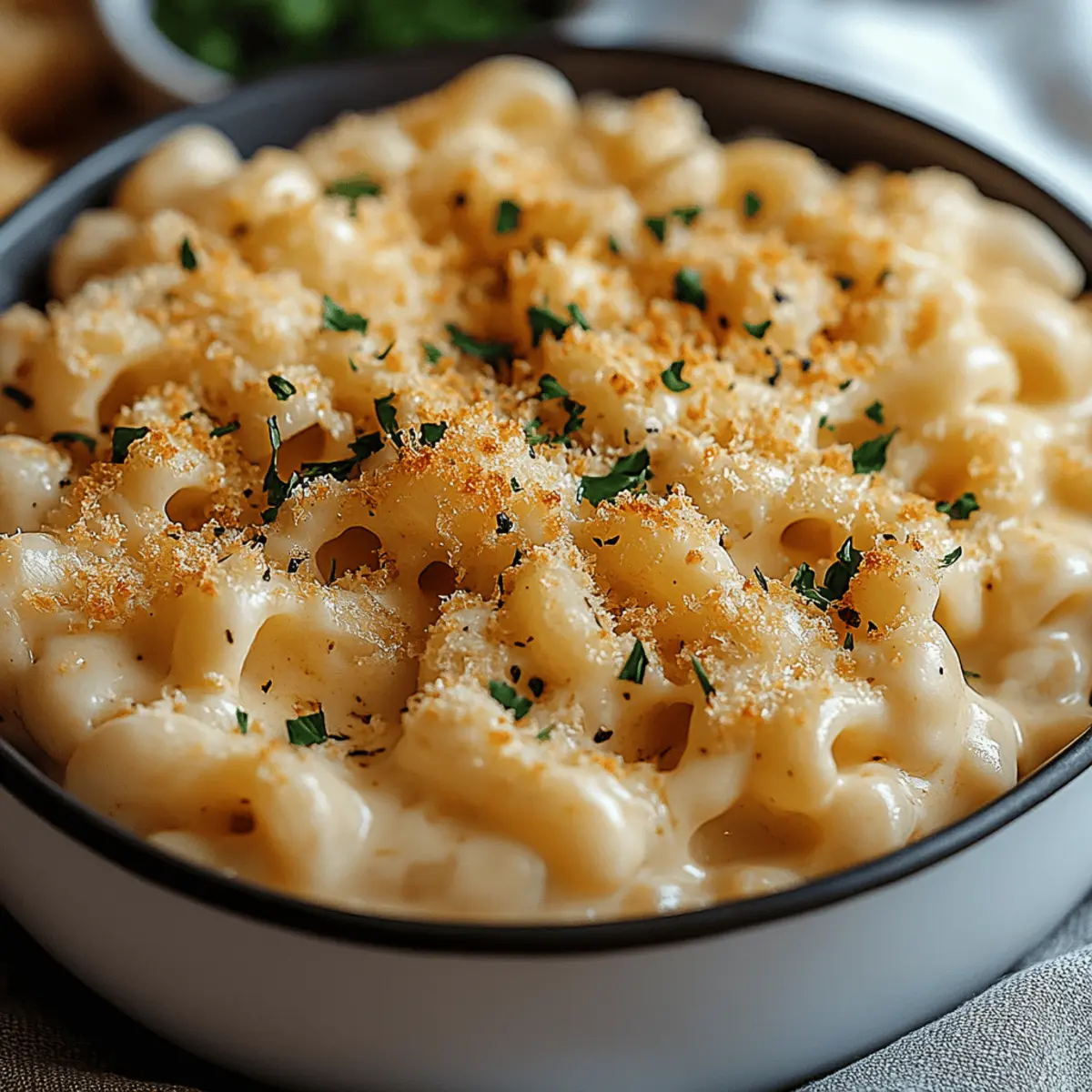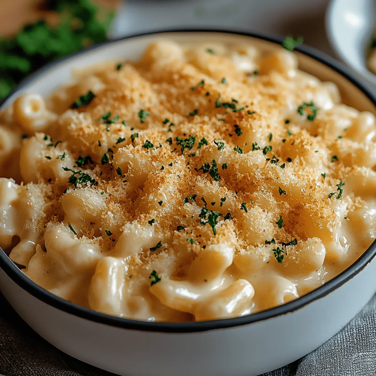 As I stirred the pot, the aroma of melting cheese filled my kitchen, instantly transporting me back to carefree childhood days spent around the dinner table. Today, I invite you to create your own cozy nostalgia with my Creamy White Cheddar Mac and Cheese with Chickpea Pasta. This recipe offers a delightful twist on a classic comfort food, replacing traditional wheat pasta with protein-packed chickpea pasta, making it not only gluten-free but also a nutritious option for all you home chefs out there. Within just 30 minutes, you can whip up a dish that satisfies your cravings while being easily customizable to meet any dietary needs. Ready to see how a healthy upgrade can redefine your mac and cheese experience? Let’s dive in! Why is Chickpea Pasta a Game Changer? Nutritional Powerhouse: Switching to chickpea pasta enhances protein and fiber content, making this dish not just comforting but nourishing. Rich & Creamy: The blend of white cheddar creates an indulgent cheese sauce that coats every morsel beautifully. Quick & Easy: Ready in just 30 minutes, this recipe is perfect for busy weeknights—delivering flavor without the fuss. Customizable: Add your favorite vegetables or proteins for a personalized touch, making each batch uniquely satisfying. Crowd-Pleaser: This dish appeals to all taste buds, ensuring even picky eaters will delight in a healthier mac and cheese experience! White Cheddar Mac and Cheese with Chickpea Pasta Ingredients For the Pasta • Chickpea Pasta – A gluten-free and protein-rich base for your mac and cheese; any gluten-free pasta can also be used. For the Cheese Sauce • Butter – Adds richness to the sauce; substitute with olive oil for a dairy-free version. • Flour – Helps create a roux to thicken the sauce; gluten-free flour works just as well. • Milk – Provides creaminess and forms the base of the cheese sauce; opt for plant-based milk for a dairy-free option. • Garlic Powder – Enhances the depth of flavor; fresh garlic can be used for a bolder taste. • Mustard Powder – Adds a tangy note that complements the cheese; Dijon mustard can be substituted for a similar effect. • Salt and Pepper – Essential for seasoning; adjust to your personal taste. • Shredded White Cheddar Cheese – Gives classic mac and cheese flavor; try Gouda, mozzarella, or parmesan for different profiles. For the Topping (optional) • Breadcrumbs – Creates a crispy topping when baked; Panko breadcrumbs can add extra crunch if desired. This White Cheddar Mac and Cheese with Chickpea Pasta is not just a meal; it’s a comforting experience that combines health benefits with all the indulgence you crave! Step‑by‑Step Instructions for White Cheddar Mac and Cheese with Chickpea Pasta Step 1: Cook Chickpea Pasta Begin by bringing a large pot of salted water to a boil over high heat. Once boiling, add the chickpea pasta and cook it until al dente, about 7-9 minutes, stirring occasionally. As the pasta cooks, it should be slightly firm to the bite. Drain the cooked pasta in a colander and set it aside while you prepare the cheese sauce. Step 2: Prepare Cheese Sauce In a medium saucepan, melt 2 tablespoons of butter over medium heat. Once melted, whisk in 2 tablespoons of flour to create a roux, cooking for 1-2 minutes until it forms a paste and begins to turn golden. Gradually whisk in 2 cups of milk, continuing to stir until the sauce thickens and bubbles gently, around 5 minutes. Season the sauce with garlic powder, mustard powder, salt, and pepper to taste. Step 3: Incorporate Cheese Reduce the heat to low and stir in 2 cups of shredded white cheddar cheese into your thickened sauce. Keep stirring until the cheese melts completely and the sauce becomes silky and smooth, about 2-3 minutes. Make sure to stir constantly to prevent the cheese from clumping. This is the heart of your White Cheddar Mac and Cheese with Chickpea Pasta, infusing rich flavor into the sauce. Step 4: Combine Pasta and Sauce Add the drained chickpea pasta to the cheese sauce, using a wooden spoon to gently toss the pasta until it is evenly coated. Make sure every piece of pasta is enveloped in that creamy cheese goodness. Cook together on low heat for another 2-3 minutes to ensure the pasta is heated through and the flavors meld beautifully. Step 5: Bake (optional) If you prefer a crunchy topping, transfer the mac and cheese into a greased baking dish. Sprinkle panko breadcrumbs evenly over the top for extra texture. Place the dish into a preheated oven at 350°F and bake for 15-20 minutes, or until the top is golden brown and bubbly, creating a tempting crust over the creamy mac and cheese. Step 6: Serve Once baked, remove the mac and cheese from the oven and let it cool slightly before serving. For an extra flourish, garnish with chopped parsley or a sprinkle of smoked paprika. Pair your delightful White Cheddar Mac and Cheese with Chickpea Pasta with a fresh side salad or some roasted vegetables to complement the meal. White Cheddar Mac and Cheese Variations Unleash your creativity with these delightful twists on the classic mac and cheese, transforming each bite into a unique adventure! Veggie Delight: Add sautéed spinach, bell peppers, or broccoli for a colorful, nutrient-packed addition. This not only boosts flavor but also adds vibrant color to your dish. Spicy Kick: Stir in red pepper flakes or diced jalapeños for a satisfying heat that balances the creamy cheese perfectly. A touch of spice elevates the comfort food experience to new heights! Protein-Packed: Mix in cooked chicken, bacon, or even chickpeas to amp up the protein content and make it a heartier meal. Each bite offers a satisfying blend of flavors and textures. Herb Infusion: Incorporate fresh herbs like thyme or basil to brighten the cheese sauce with a burst of freshness. This simple addition adds layers of aromatic depth. Nutty Flavor: Enhance the creaminess by folding in a spoonful of tahini or almond butter; it c